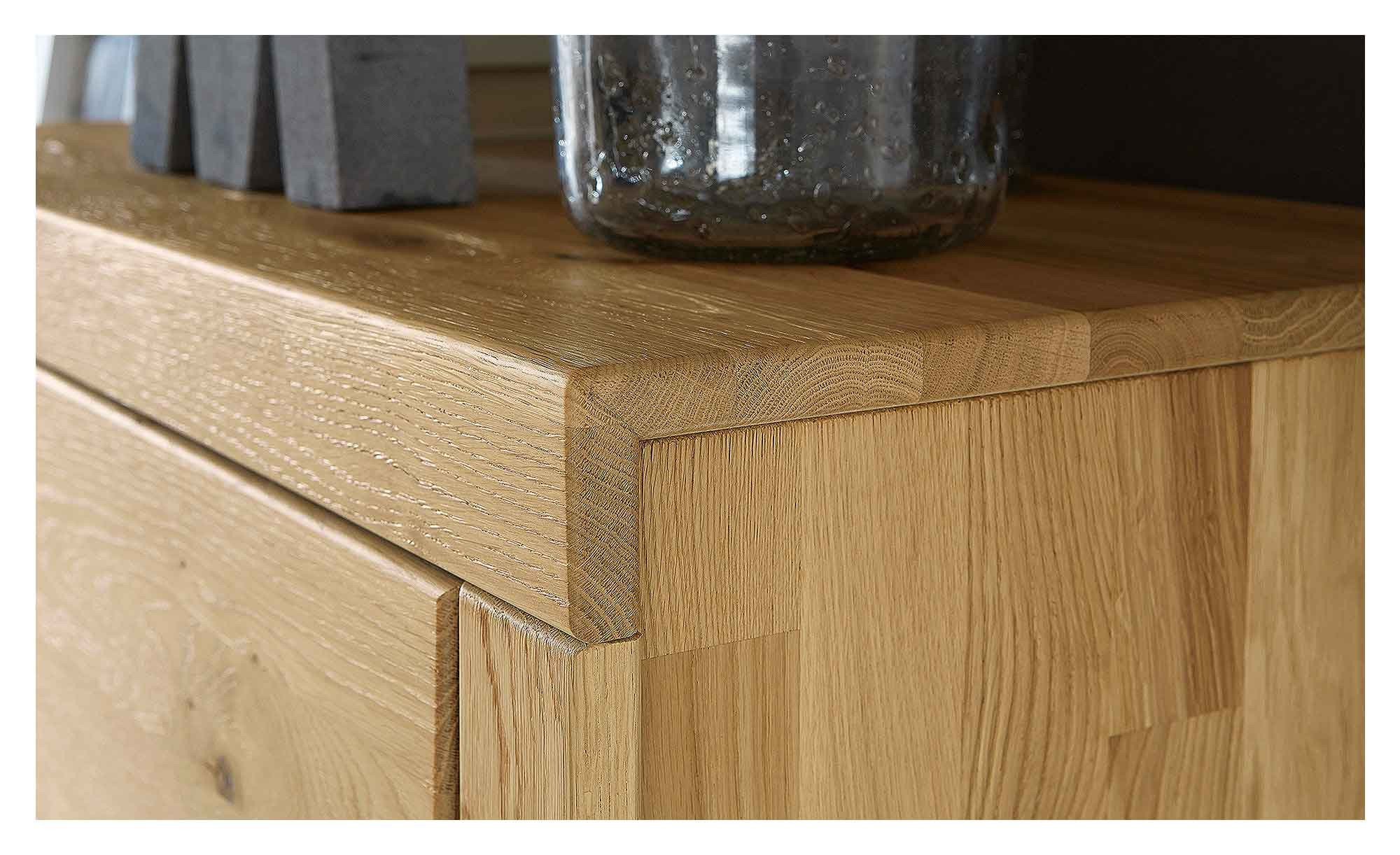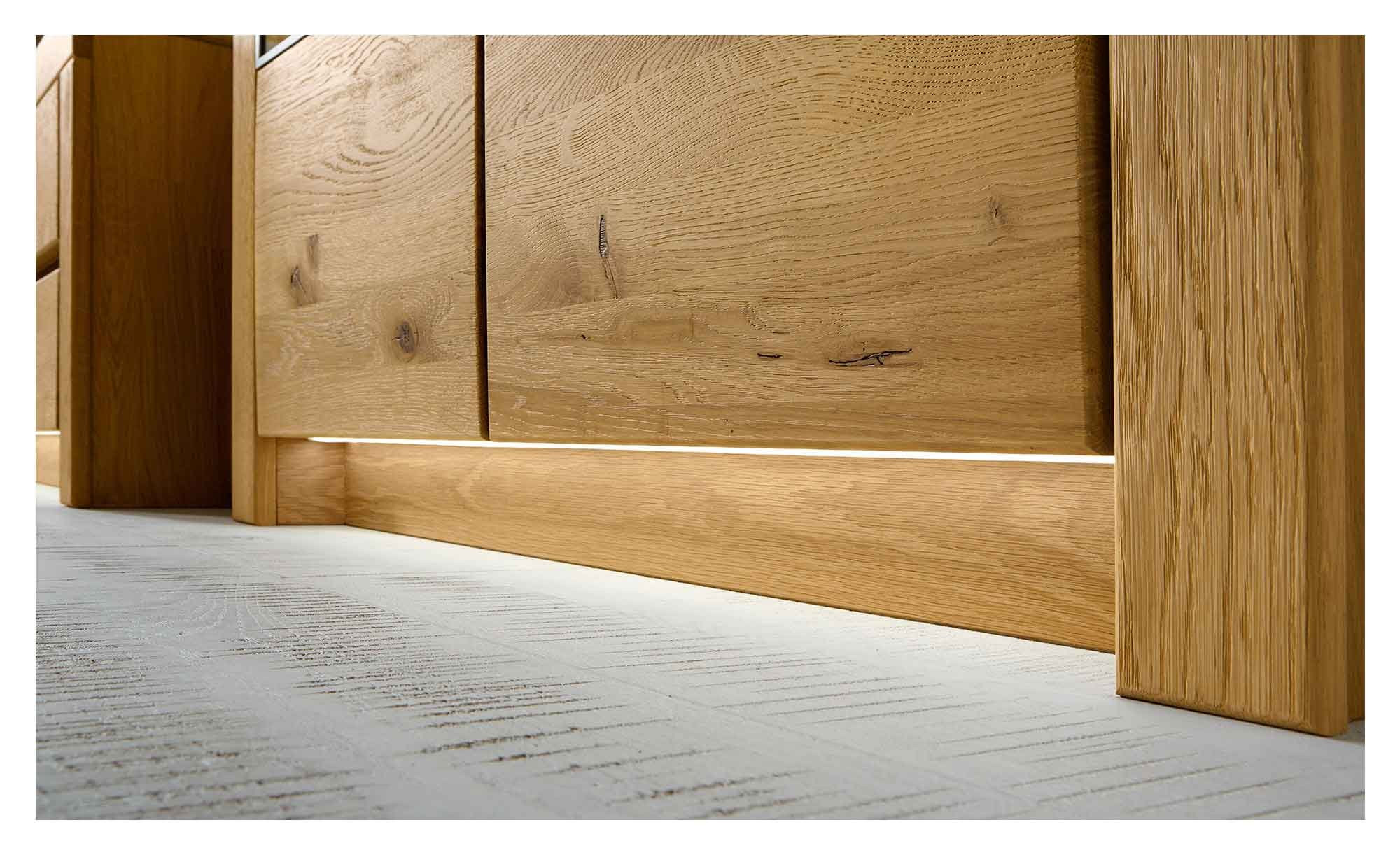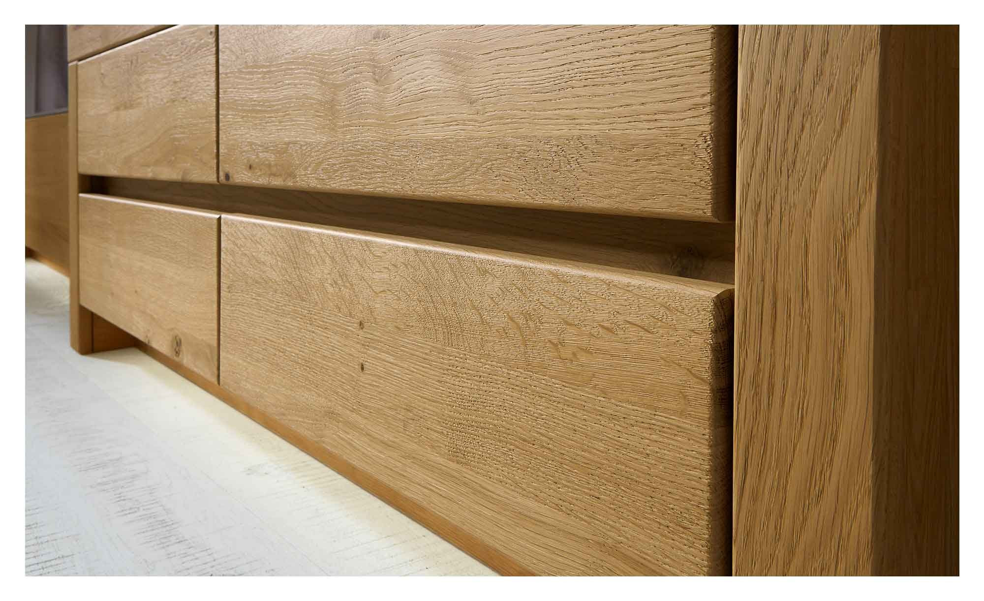 Gefertigt aus Massivholz der Handelsklasse 1A, überzeugt das Ensemble mit einem edlen und zeitlosen Erscheinungsbild. Die für Korpus und Fronten verwendete Wildeiche ist soft gebürstet und lackiert, wodurch ihre Maserung besonders schön zur Geltung kommt. Teilweise eingesetzte Glaselemente lockern das Gesamtbild stilvoll auf.