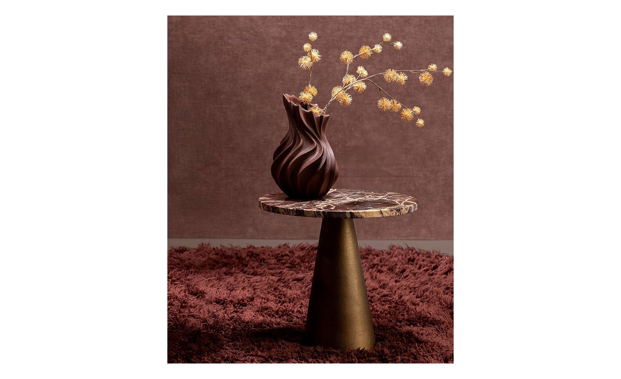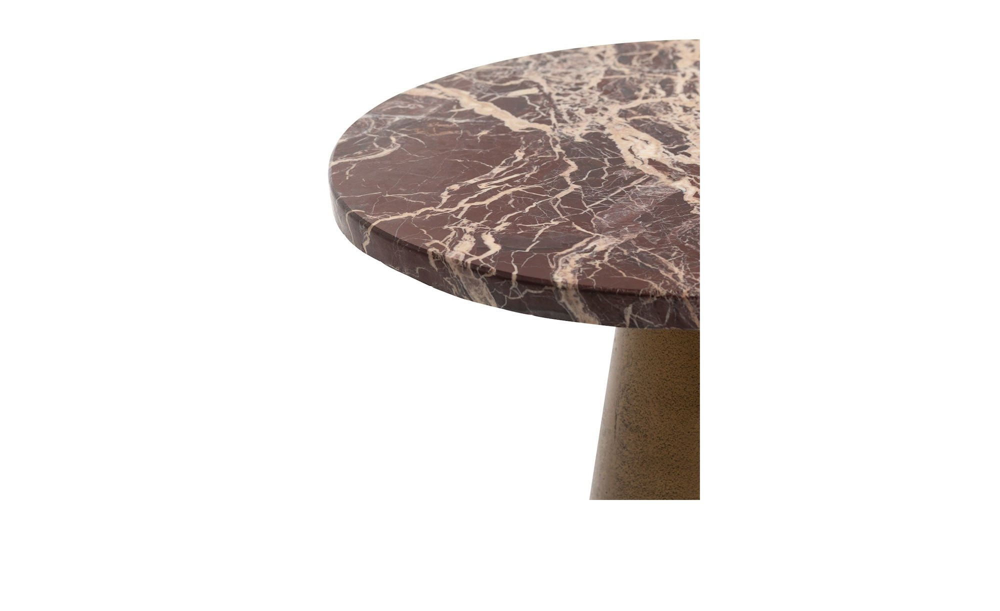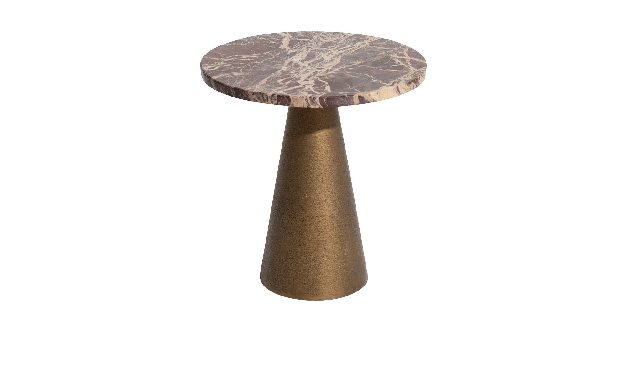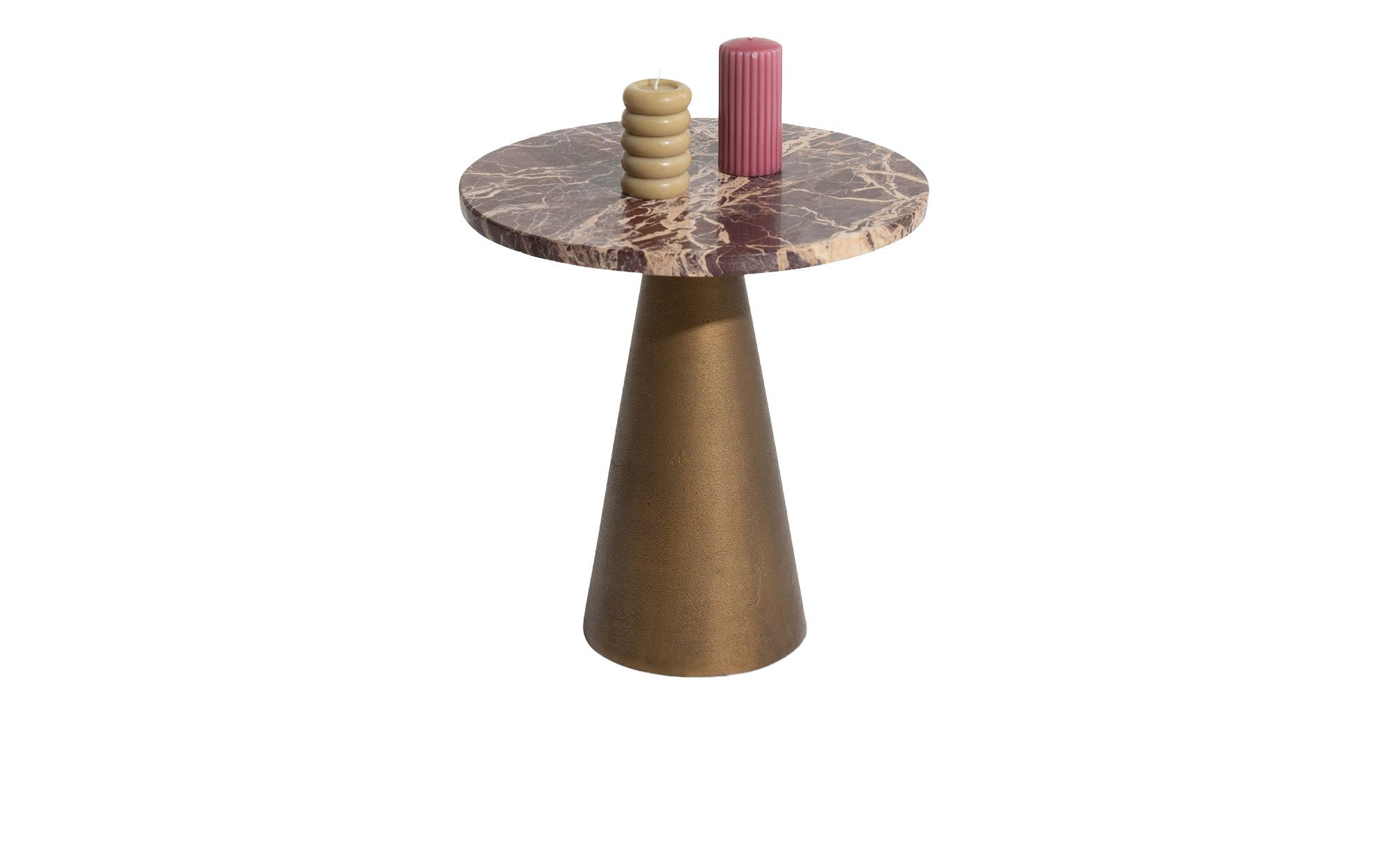 Ein kegelförmiges Aluminiumgestell im Farbton Kupfer bildet die Basis des ca. 41 x 43 x 41 cm großen Möbelstücks. Zuverlässig trägt es eine runde Platte aus Marmor, die durch ihr individuelles Muster sofort die Blicke auf sich zählt.