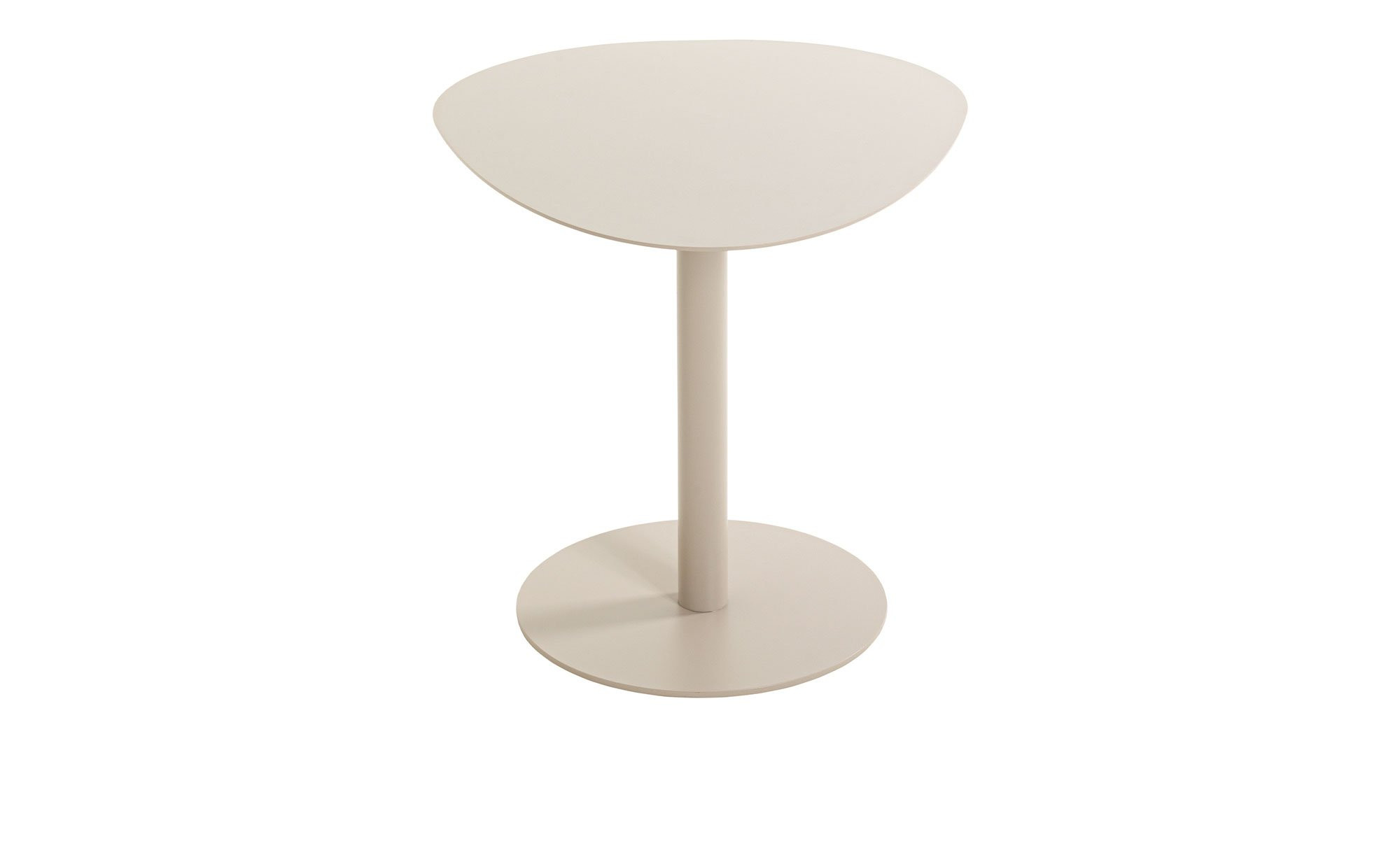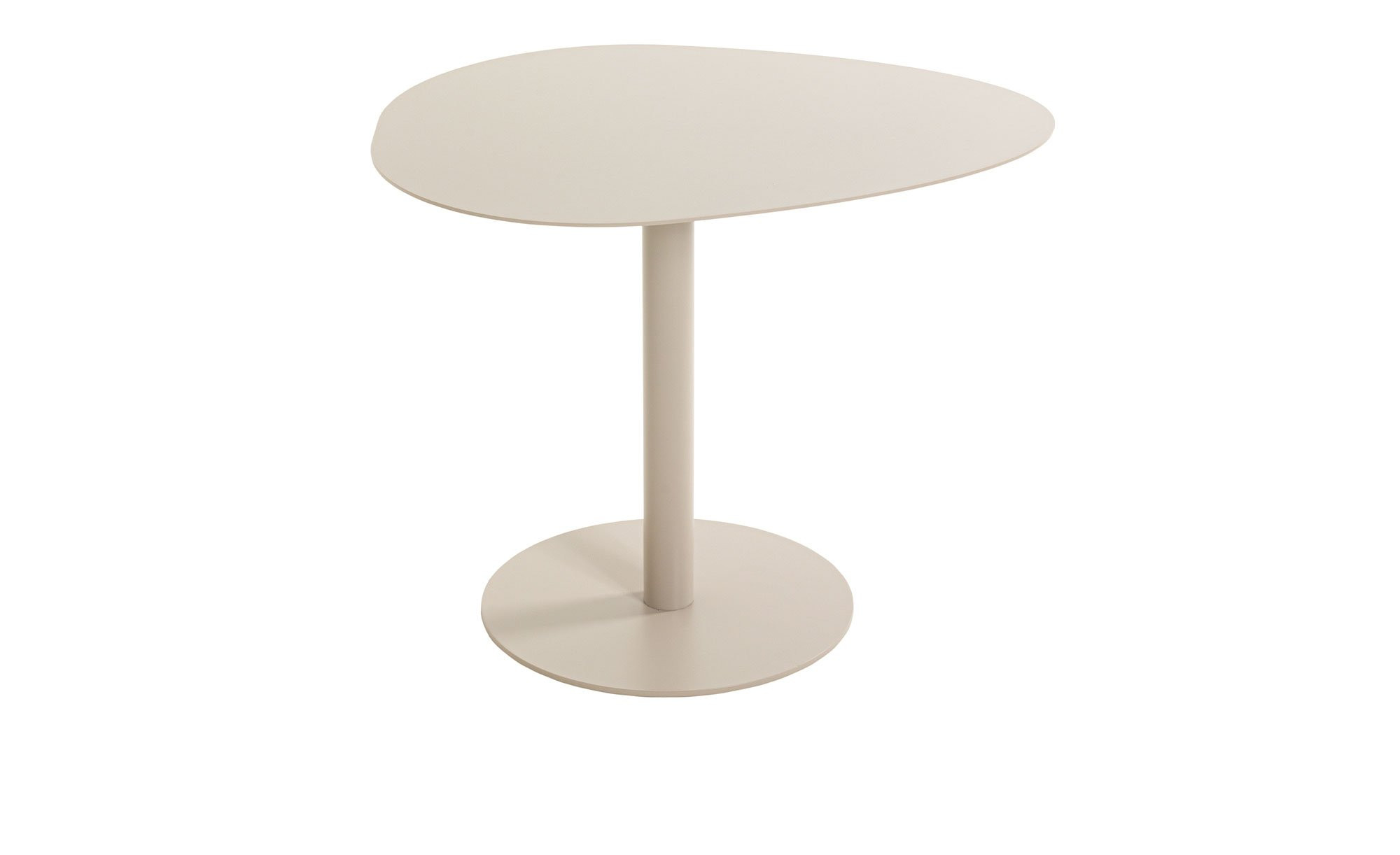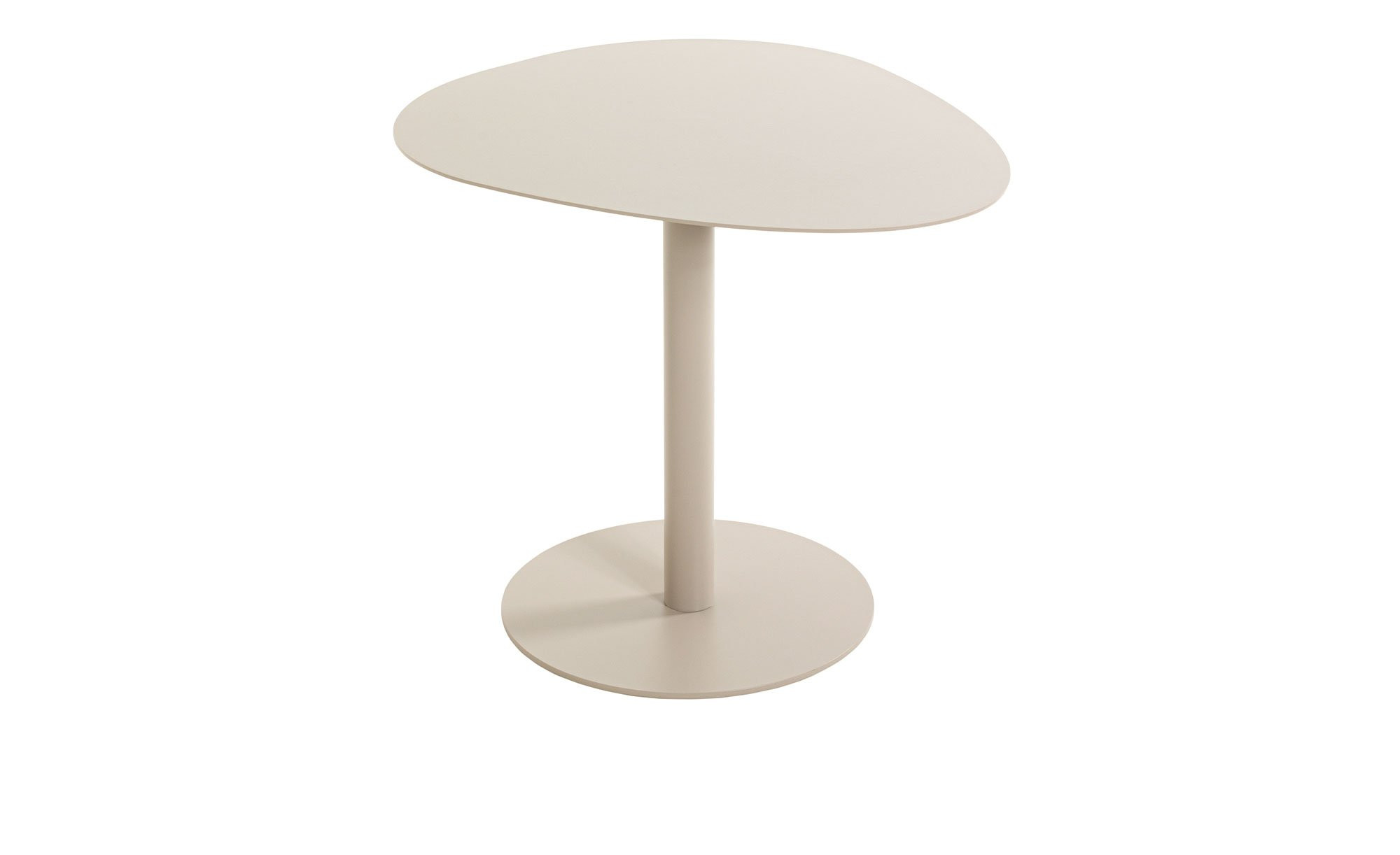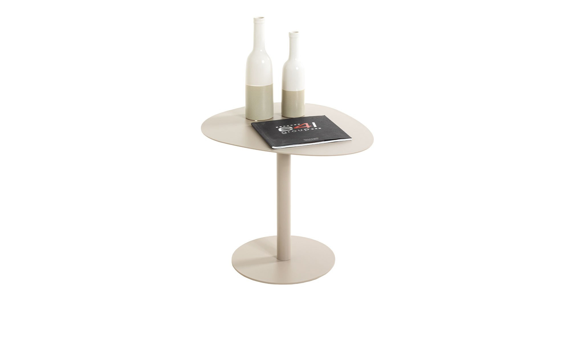 Gefertigt aus pulverbeschichtetem Metall in Kaschmirgrau, präsentiert sich der ca. 51 x 42 x 41 cm große Artikel robust und zugleich elegant. Besonders ins Auge fällt neben der Bodenplatte mit einem Durchmesser von ca. 30 cm die außergewöhnlich geformte Tischplatte, die dem Möbelstück seinen modernen Charakter verleiht.