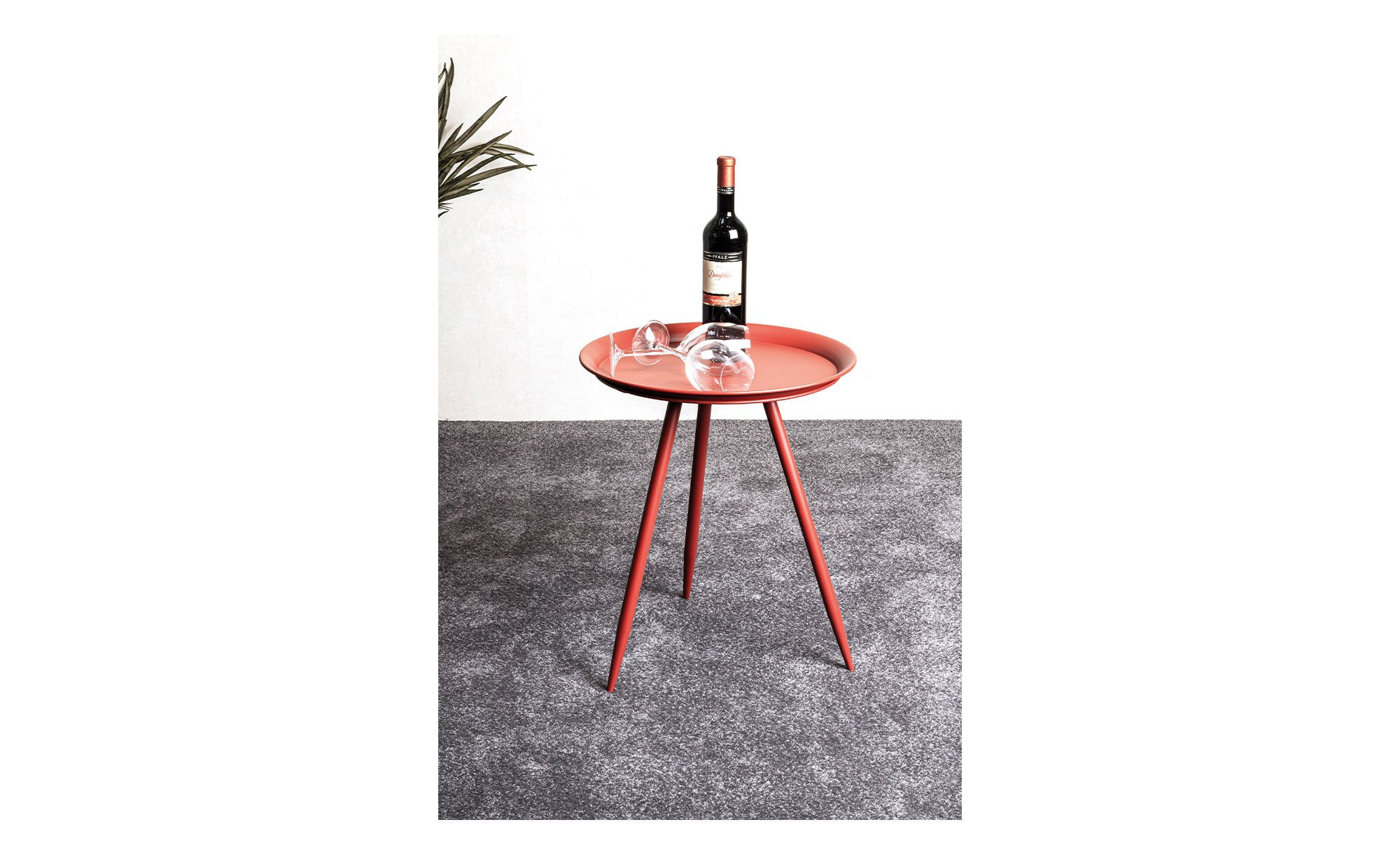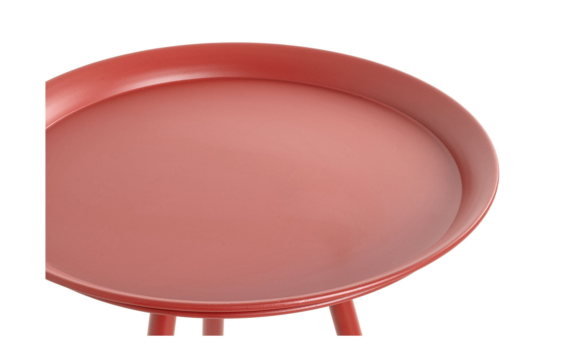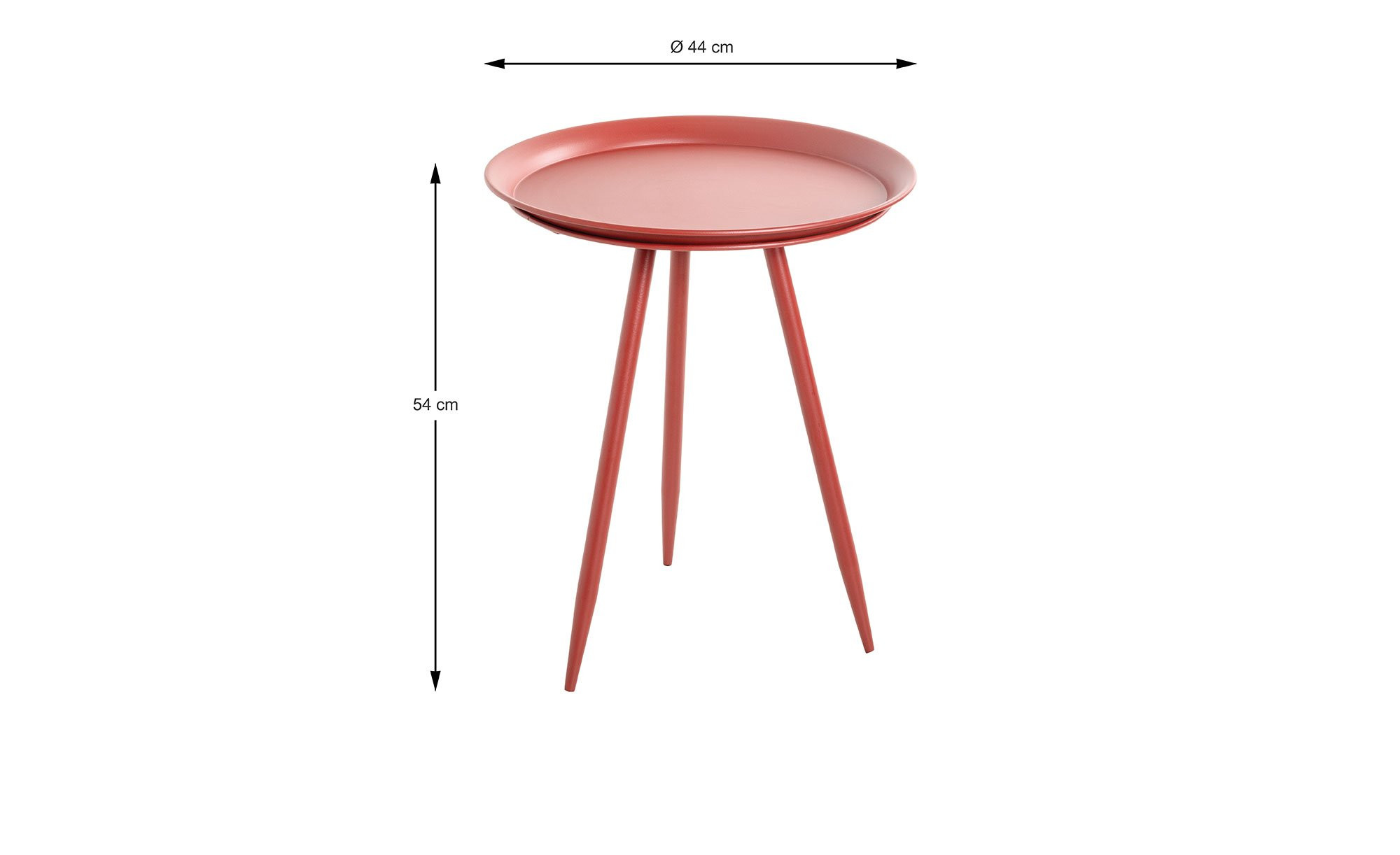 Das ca. 44 x 54 x 44 cm große Möbelstück besteht vollständig aus rot lackiertem Metall. Seine runde Platte mit einem Durchmesser von ca. 44 cm bietet Platz für Gegenstände von bis zu ca. 8 kg Gewicht. Getragen wird sie von einem stabilen Dreifußgestell in Stativ-Form.