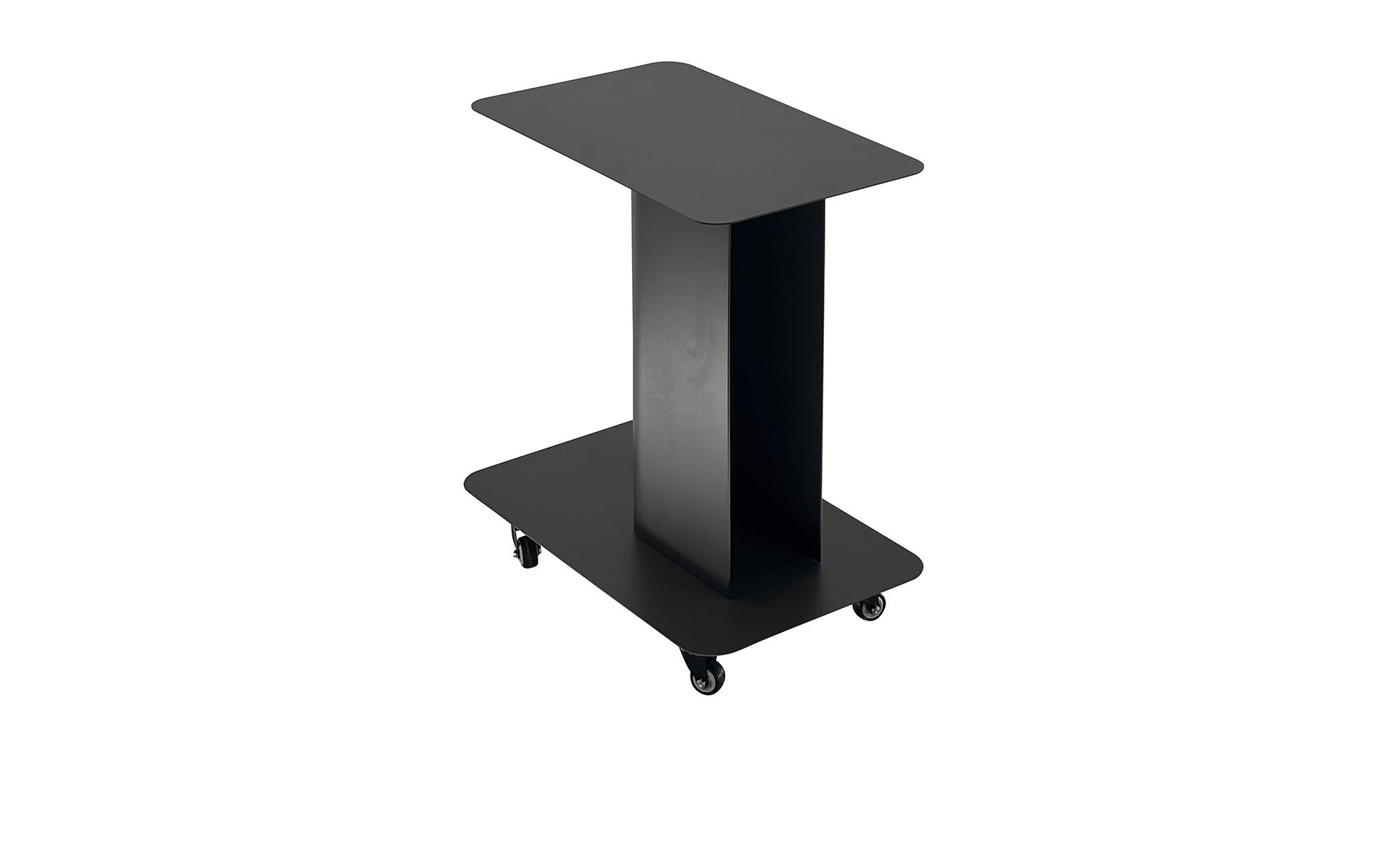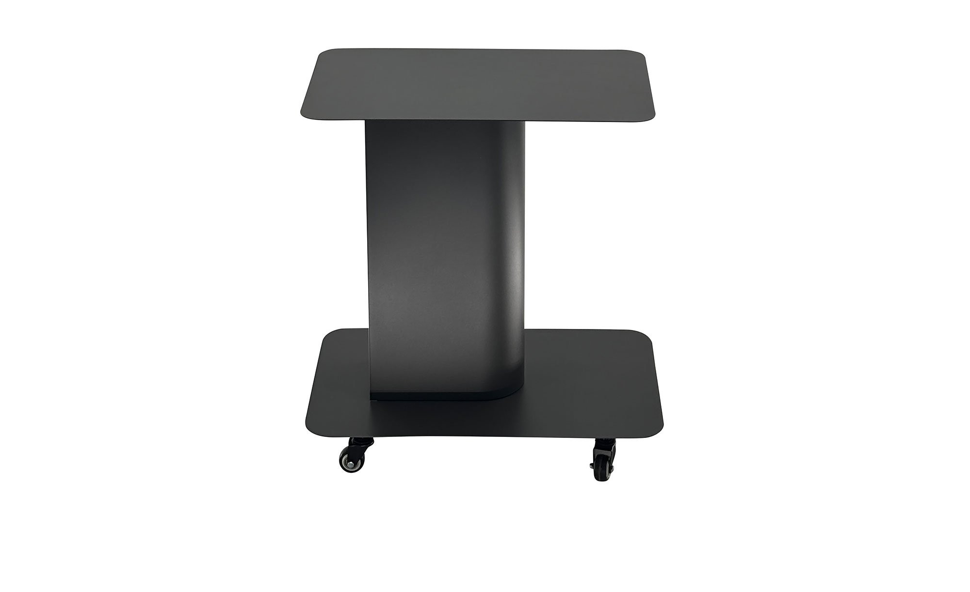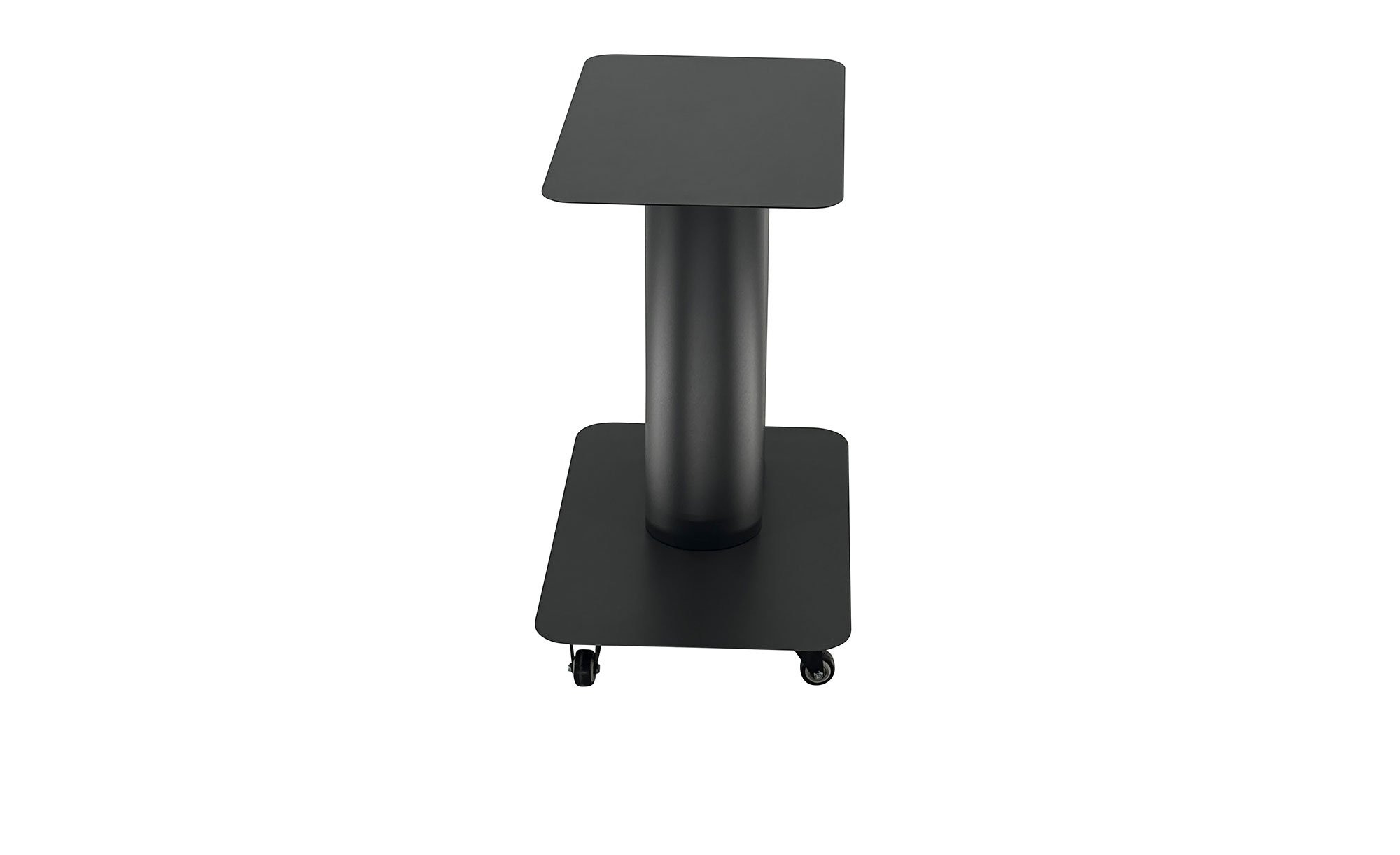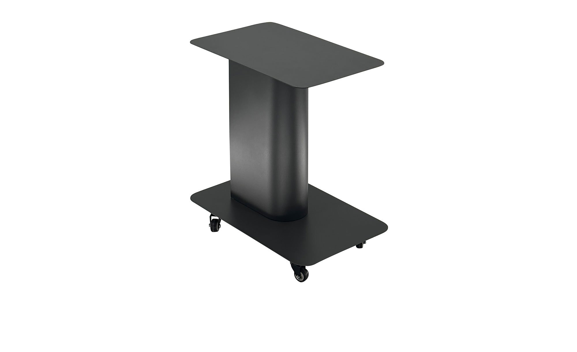 Der ca. 78 x 55 x 47 cm große Tisch besteht aus pulverbeschichtetem Stahl in Anthrazit. Ein Säulengestell trägt die rechteckige Platte. Sie hat eine Stärke von ca. 1,50/1,00 mm und kann mit max. 10 kg belastet werden. Praktische Rollen sorgen für eine besondere Flexibilität bei der Platzierung des Artikels.