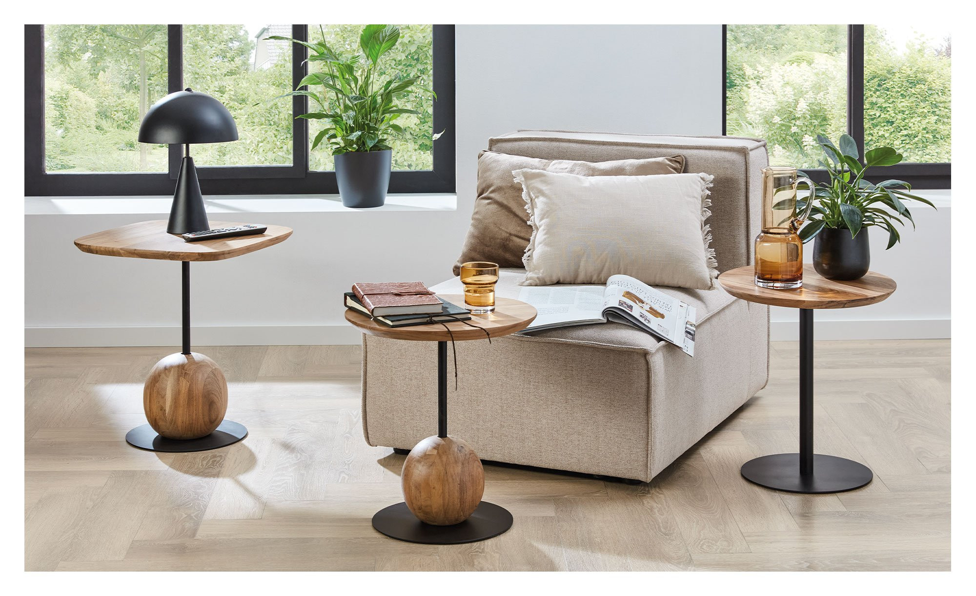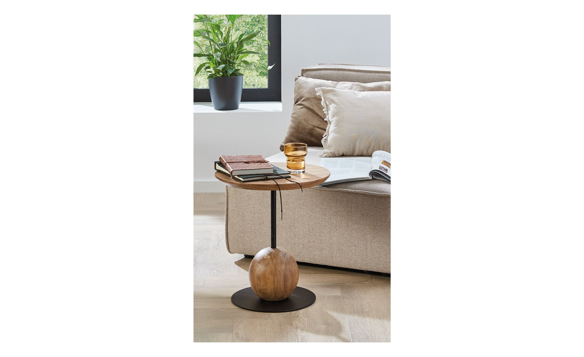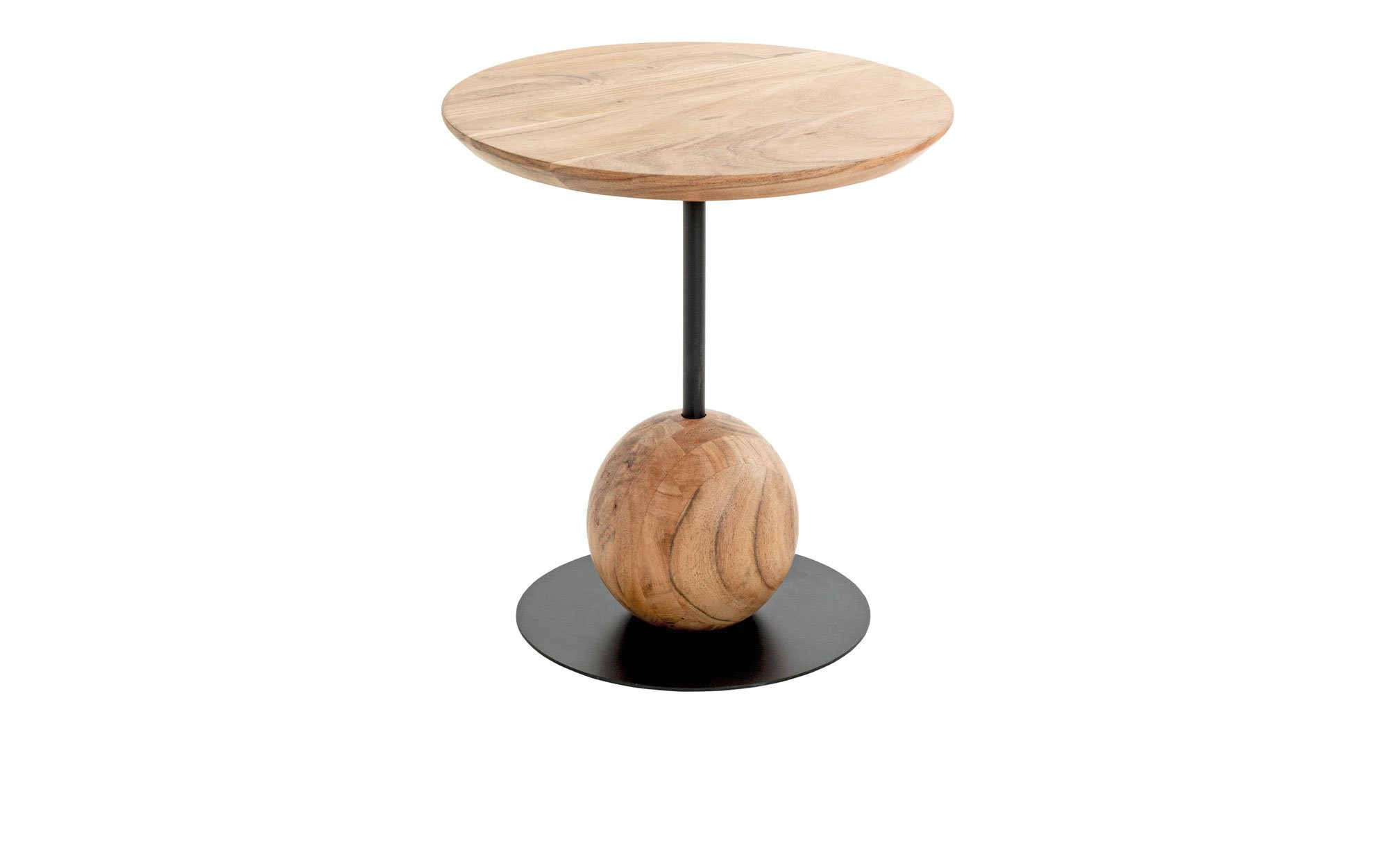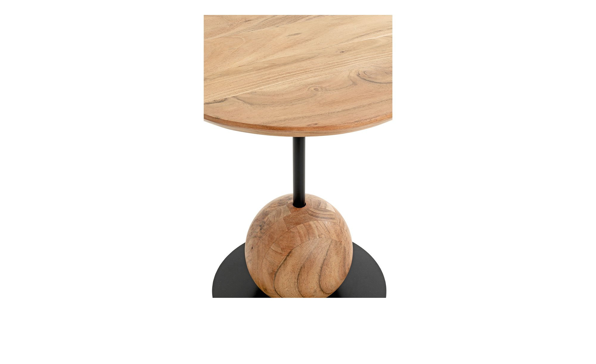 Seine ca. 25 mm starke Tischplatte aus massiver Akazie mit einem Durchmesser von ca. 40 cm sorgt für eine warme, natürliche Ausstrahlung. Als besonderes Detail sticht das dekorative Kugel-Element aus demselben Holz hervor, das harmonisch ins Gestell integriert ist.