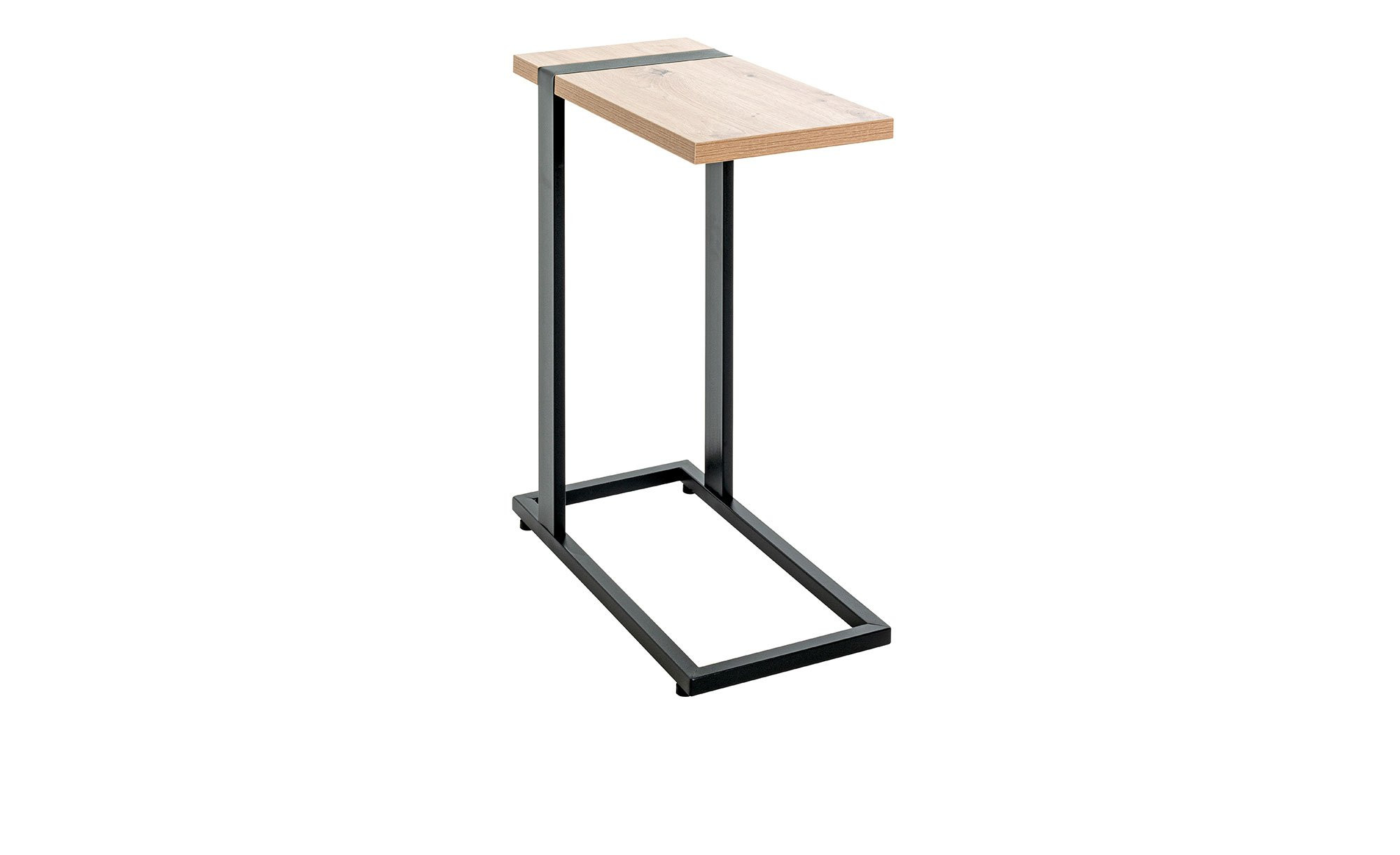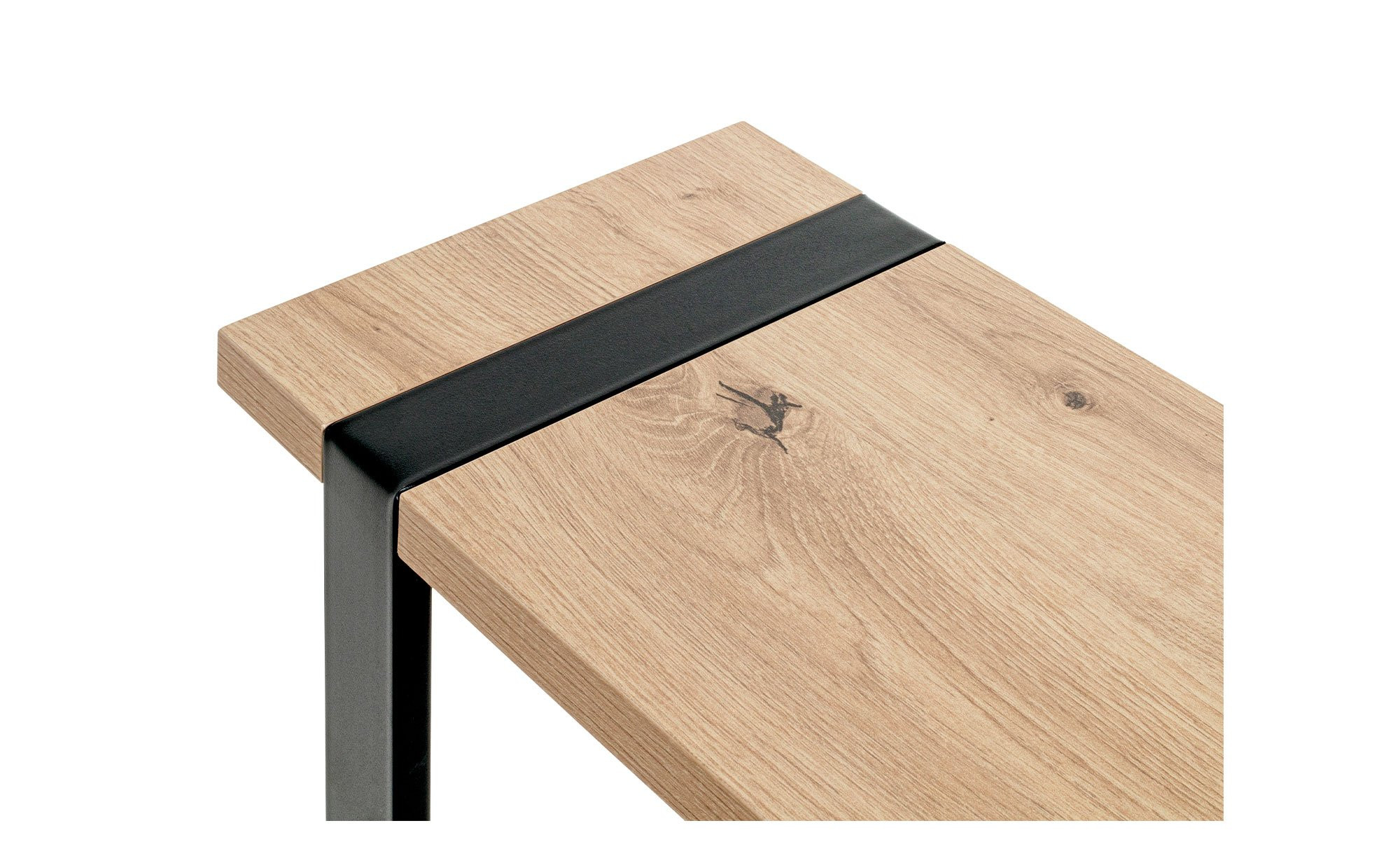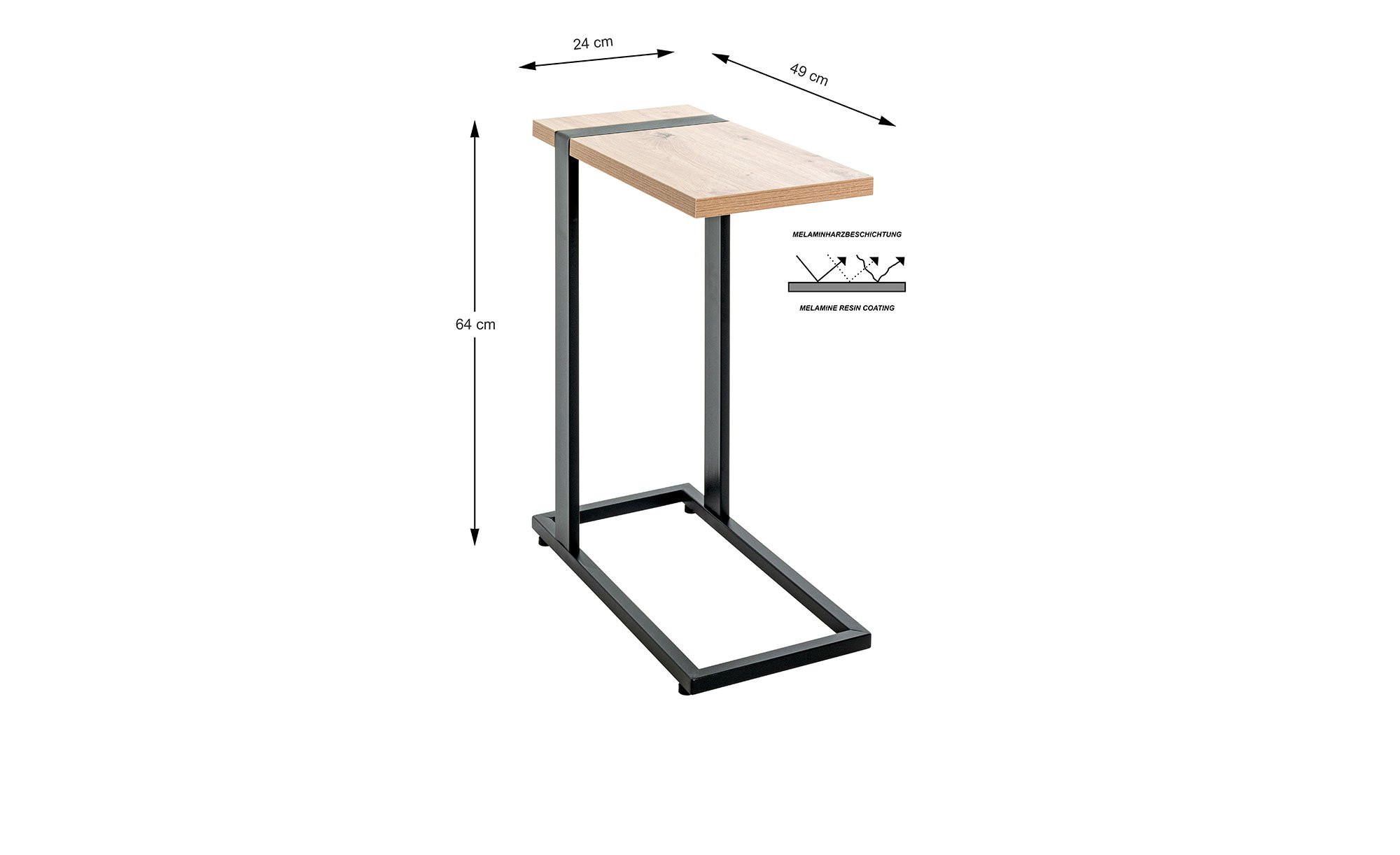 Das Gestell des ca. 24 x 64 x 49 cm großen Möbelstücks besteht aus schwarz pulverbeschichteten Stahlrohren. Obenauf befindet sich die rechteckige Platte in hellem Eiche-Dekor. Sie ist ca. 25 mm stark und kann mit bis zu ca. 10 kg belastet werden.