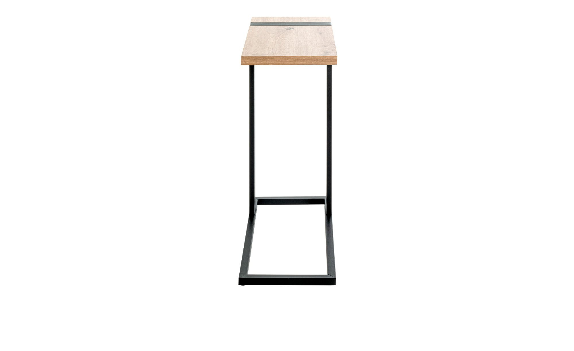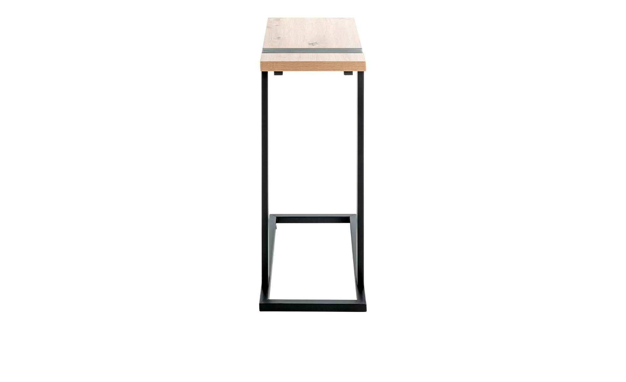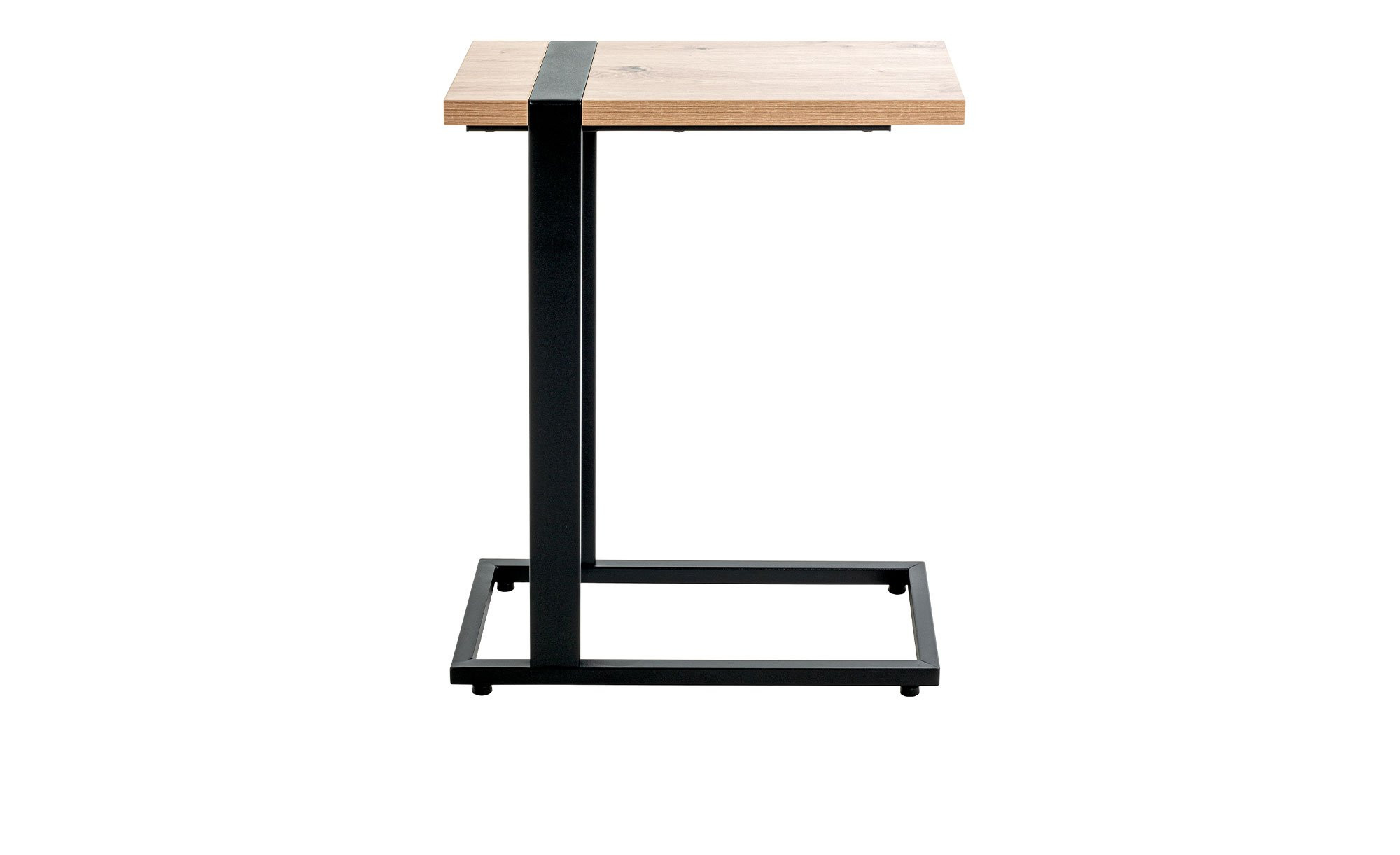 Das Gestell des ca. 24 x 64 x 49 cm großen Möbelstücks besteht aus schwarz pulverbeschichteten Stahlrohren. Obenauf befindet sich die rechteckige Platte in hellem Eiche-Dekor. Sie ist ca. 25 mm stark und kann mit bis zu ca. 10 kg belastet werden.