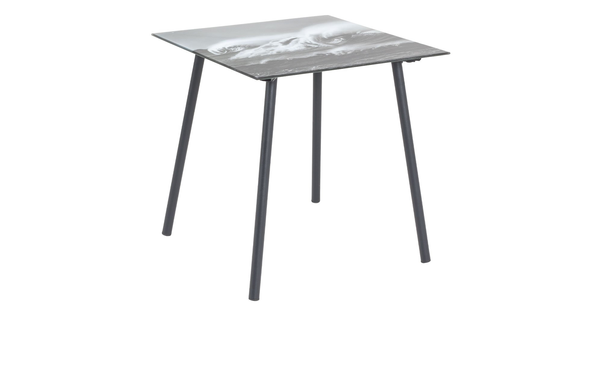 Der rechteckige Tisch ist ca. 40 x 41 x 40 cm groß und verfügt über eine Platte aus Sicherheitsglas. Diese ist mit einem Wellen-Motivdruck versehen und sorgt damit für ein besonderes Flair. Einen stabilen Stand gewährleistet das vierfüßige Gestell aus schwarz lackiertem Stahlrohr.