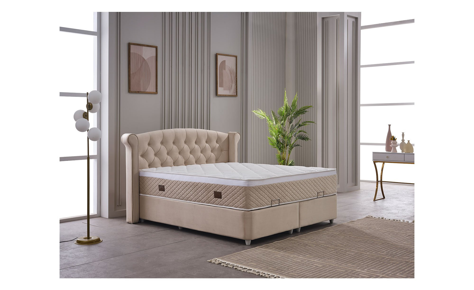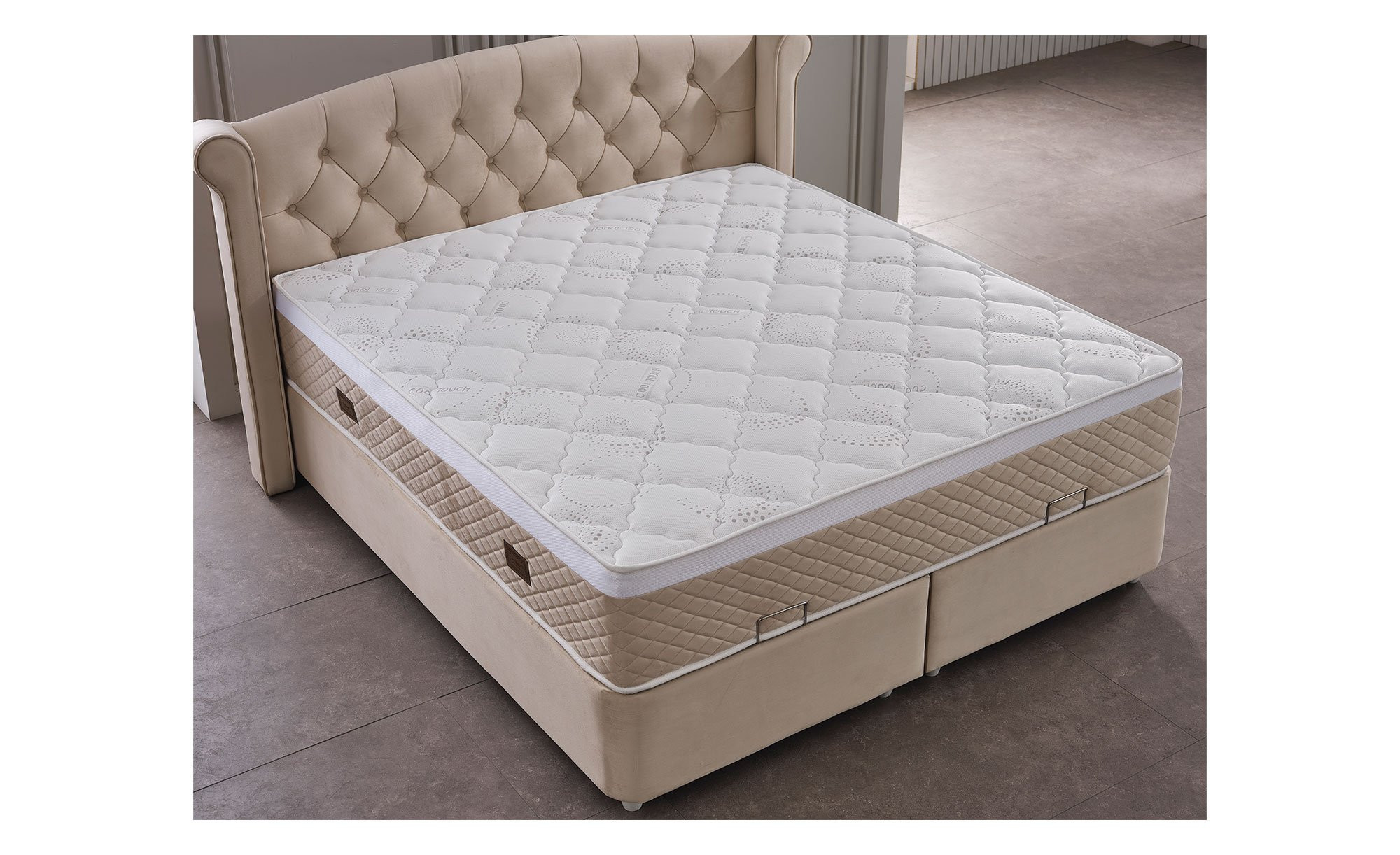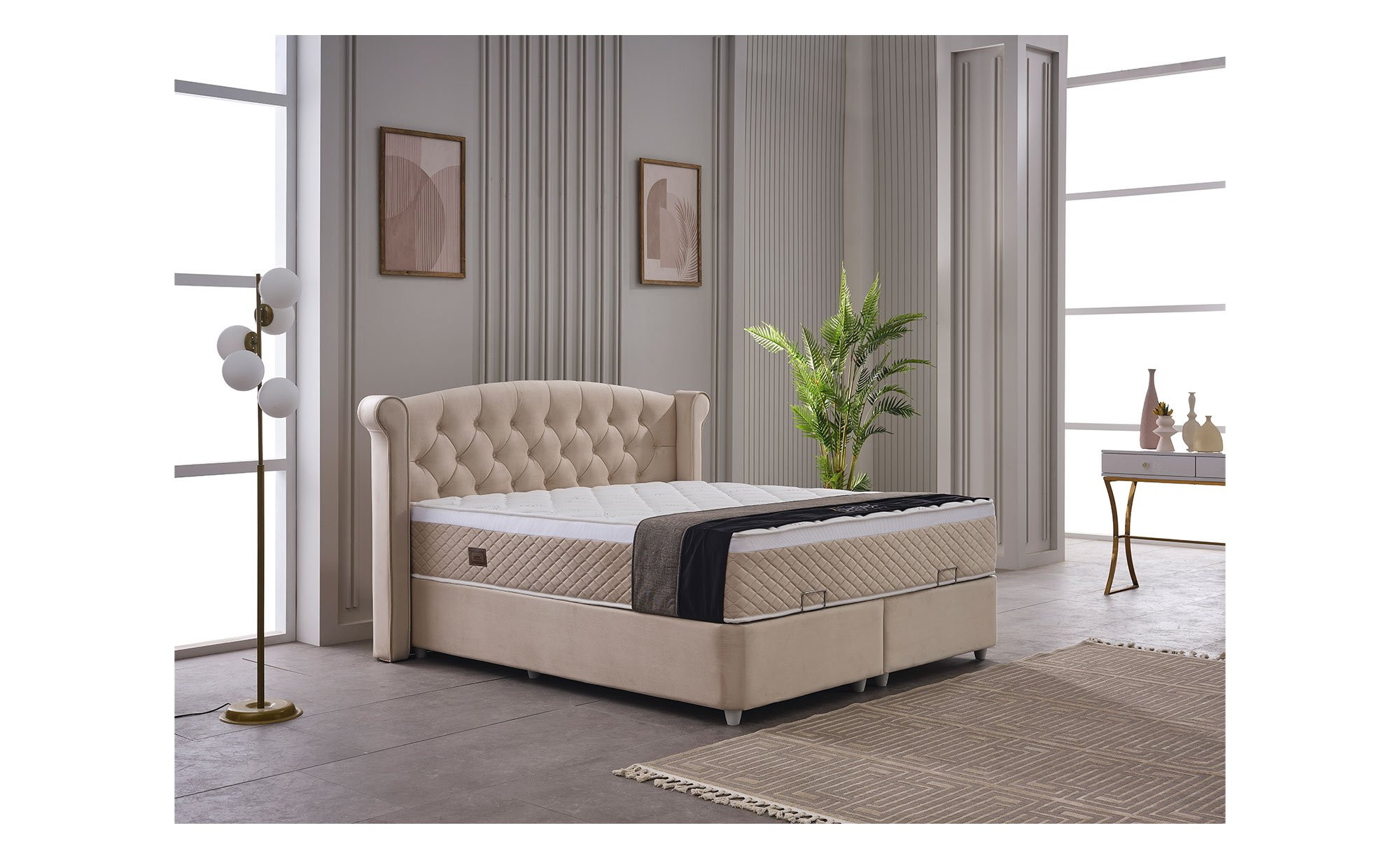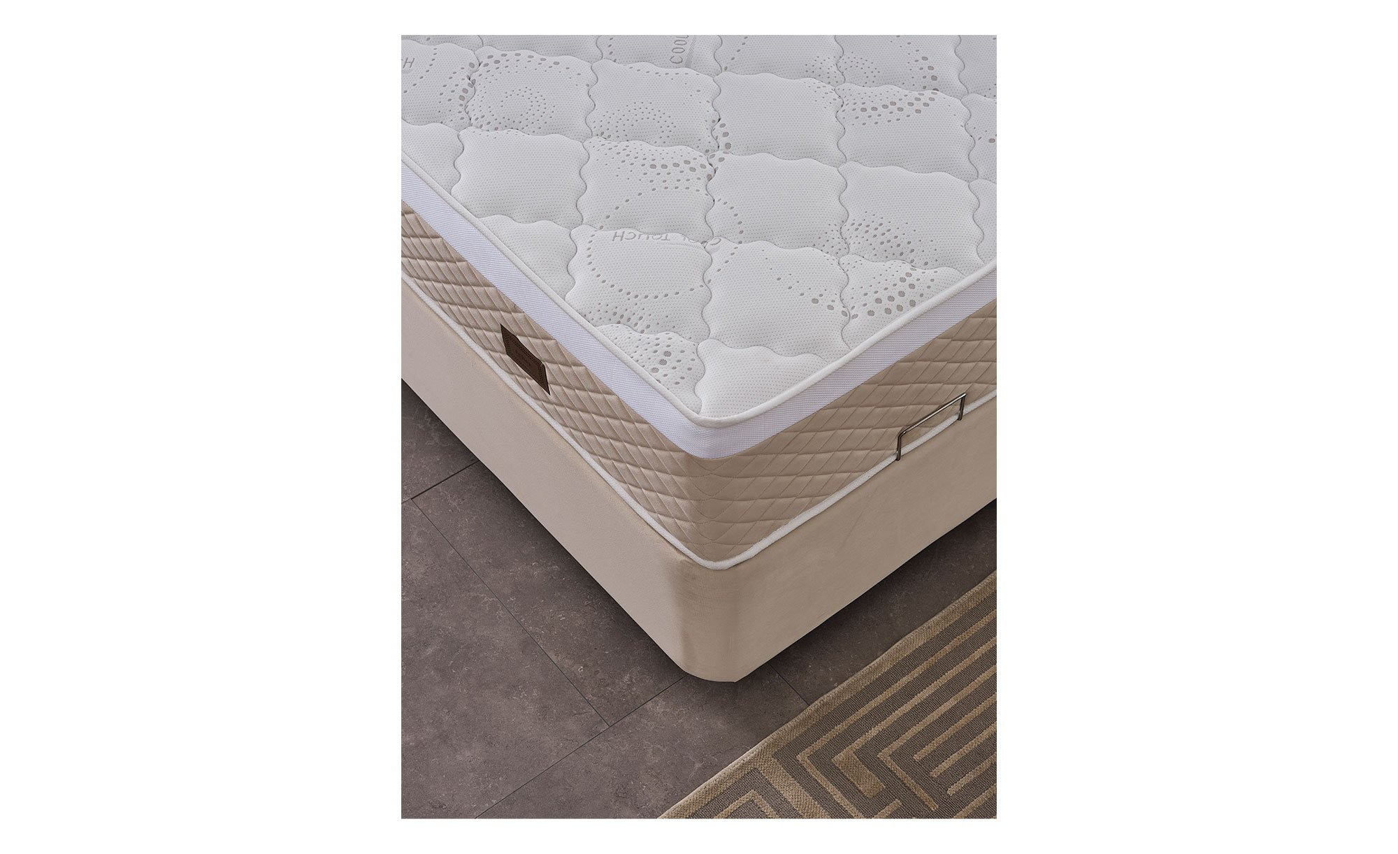 Die ca. 180 x 200 cm umfassende Liegefläche befindet sich auf einer Box. Sie ist ca. 69 cm hoch und besteht aus einer angenehm punktelastischen Federkernmatratze. Ihr Körper wird im Schlaf also optimal unterstützt. Eine Etage tiefer sorgt der integrierte Bettkasten außerdem für praktischen Stauraum.