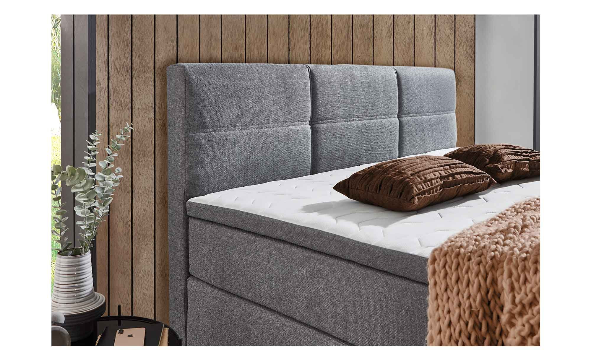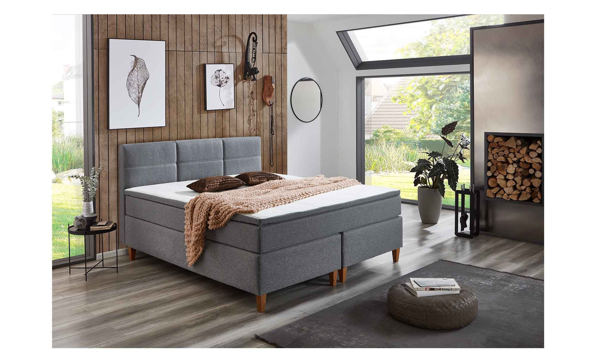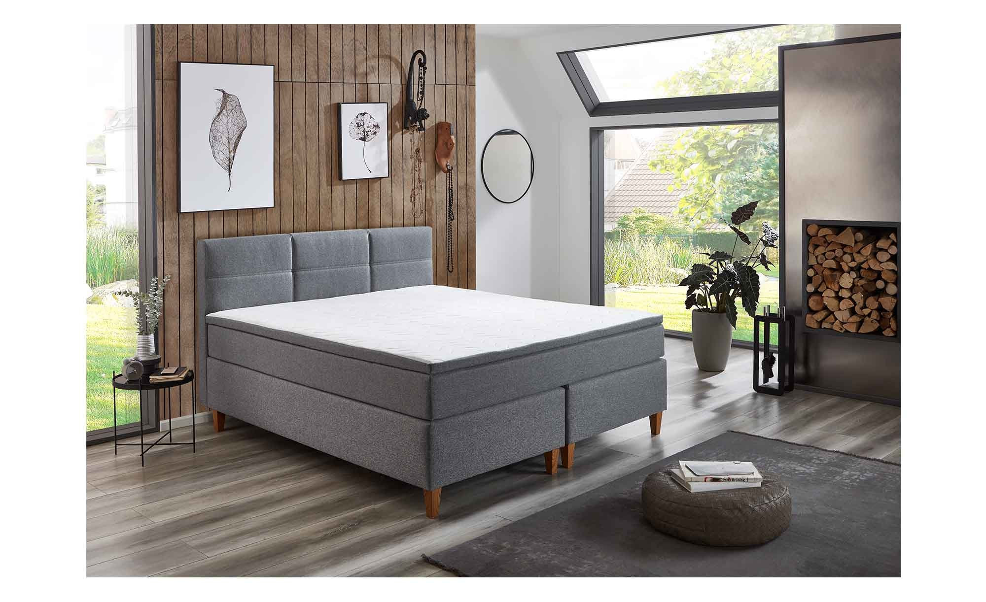 Mit dem Boxspringbett Kansas holen Sie sich ein elegantes und zugleich komfortables Schlafmöbel in Ihr Schlafzimmer. Der graue Möbelstoffbezug aus 100 % Polyester verleiht dem Bett eine moderne, zeitlose Optik, während das gepolsterte Kopfteil mit dekorativer Versteppung und Abheftungen für eine einladende Ausstrahlung sorgt. Die stabile Basis aus Spanplatten und Massivholzleisten gewährleistet zuverlässige Standfestigkeit, ergänzt durch Kunststofffüße in natürlicher Eichen-Optik. Das Kopfteil ist zur Positionierung an der Wand vorgesehen und wird mit passenden Befestigungsbeschlägen geliefert.