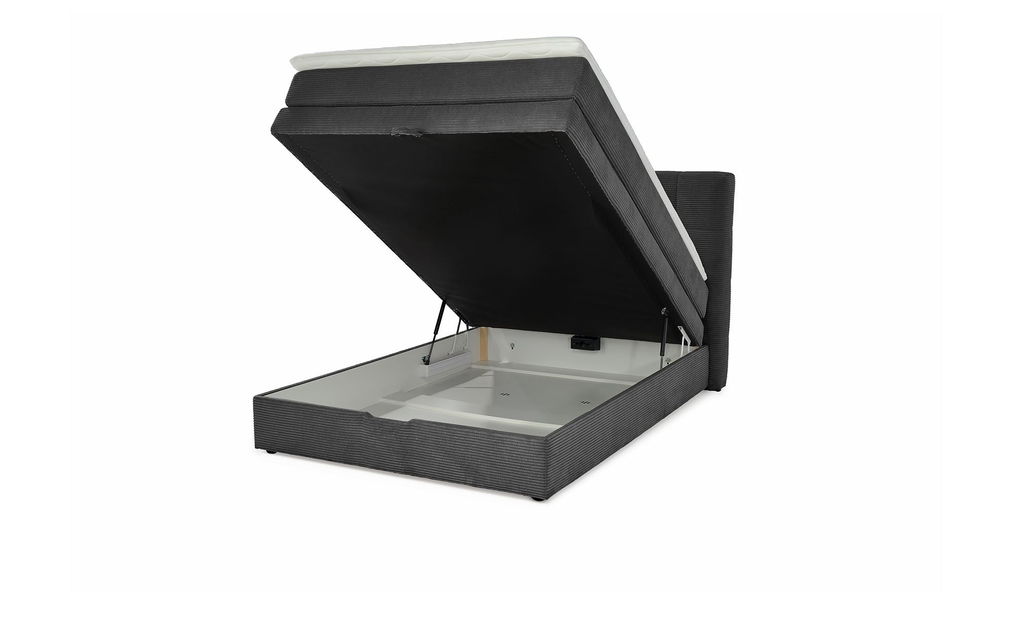 Dank Gasdruckfeder lässt sich der integrierte Bettkasten leichtgängig öffnen und bietet mit Innenmaßen von ca. 196 x 136 cm reichlich Stauraum für Ihre Bettwäsche.