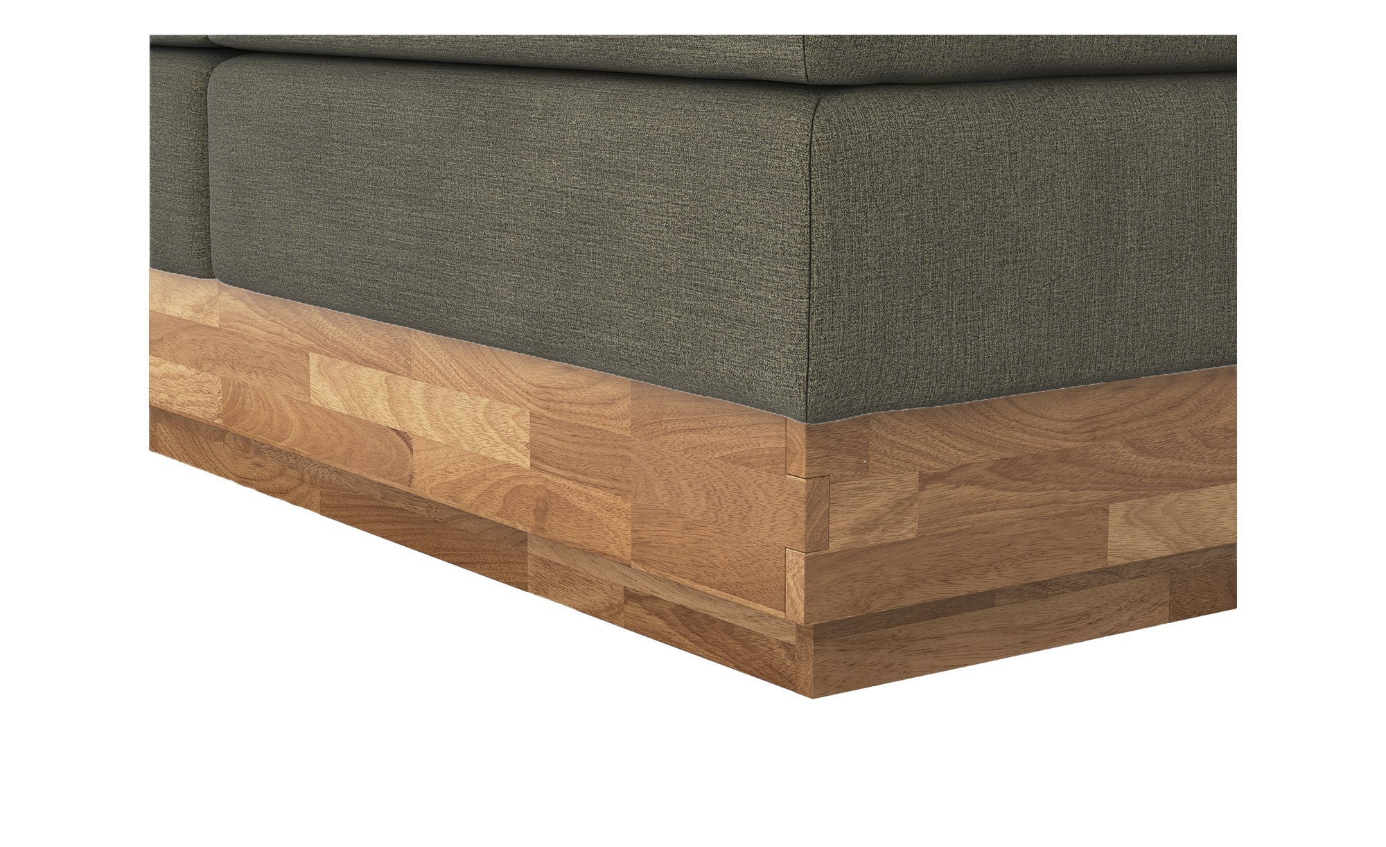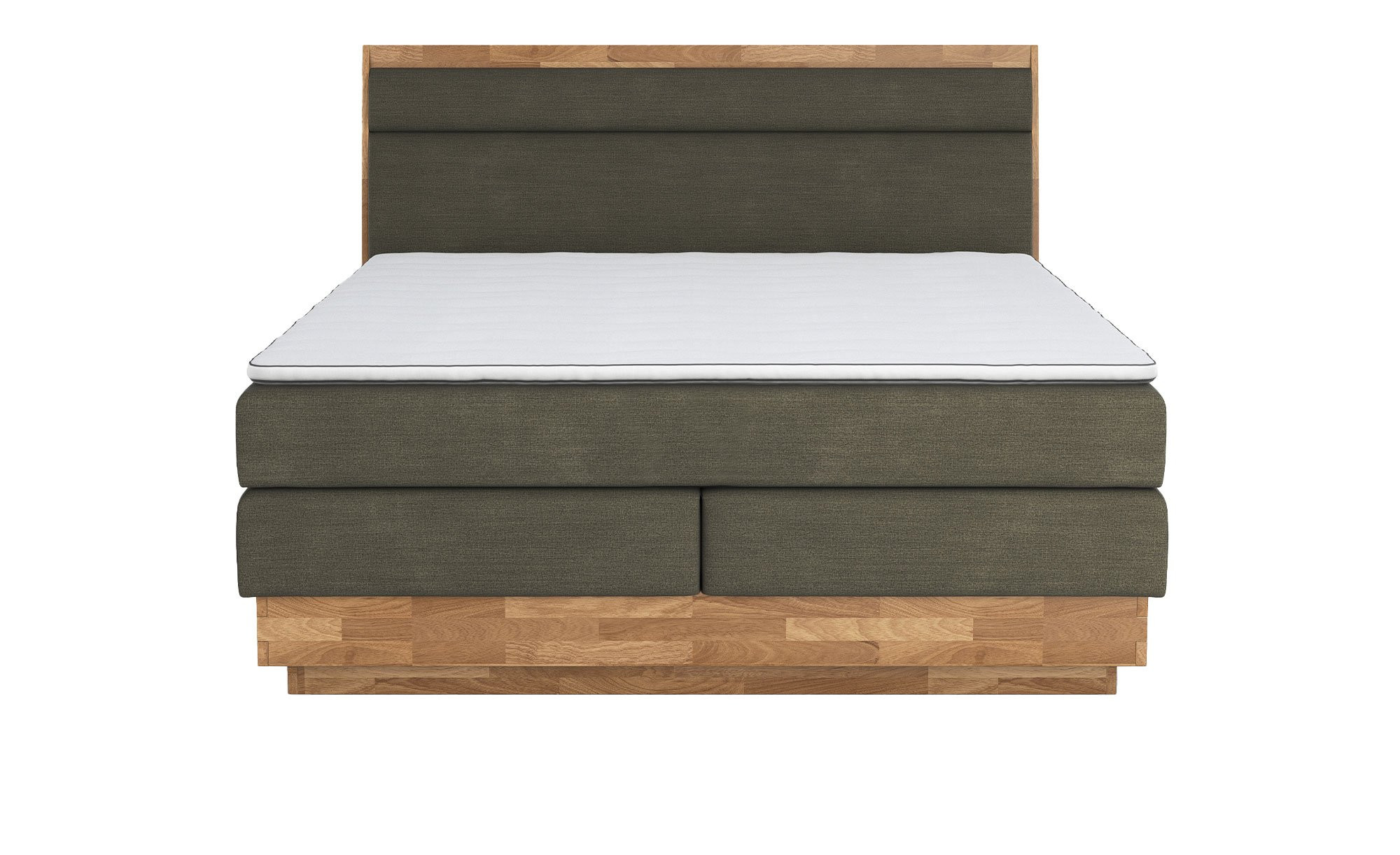 Das ca. 185 x 115 x 215 cm große Möbelstück begeistert mit einem Sichtrahmen aus geölter Eiche, der nicht nur Stabilität bietet, sondern auch durch seine natürliche Schönheit besticht. Der übrige Rahmen sowie das gepolsterte Kopfteil sind mit einem feinen Flachgewebe in Leinen-Optik bezogen. Dieser Stoff aus 100 % Polyester ist wasserabweisend und im eleganten Farbton Hunter gehalten, wodurch ein reizvoller Kontrast zum Holz entsteht. Schwarze Kunststoffgleiter von ca. 1,5 cm Höhe dienen als Füße.