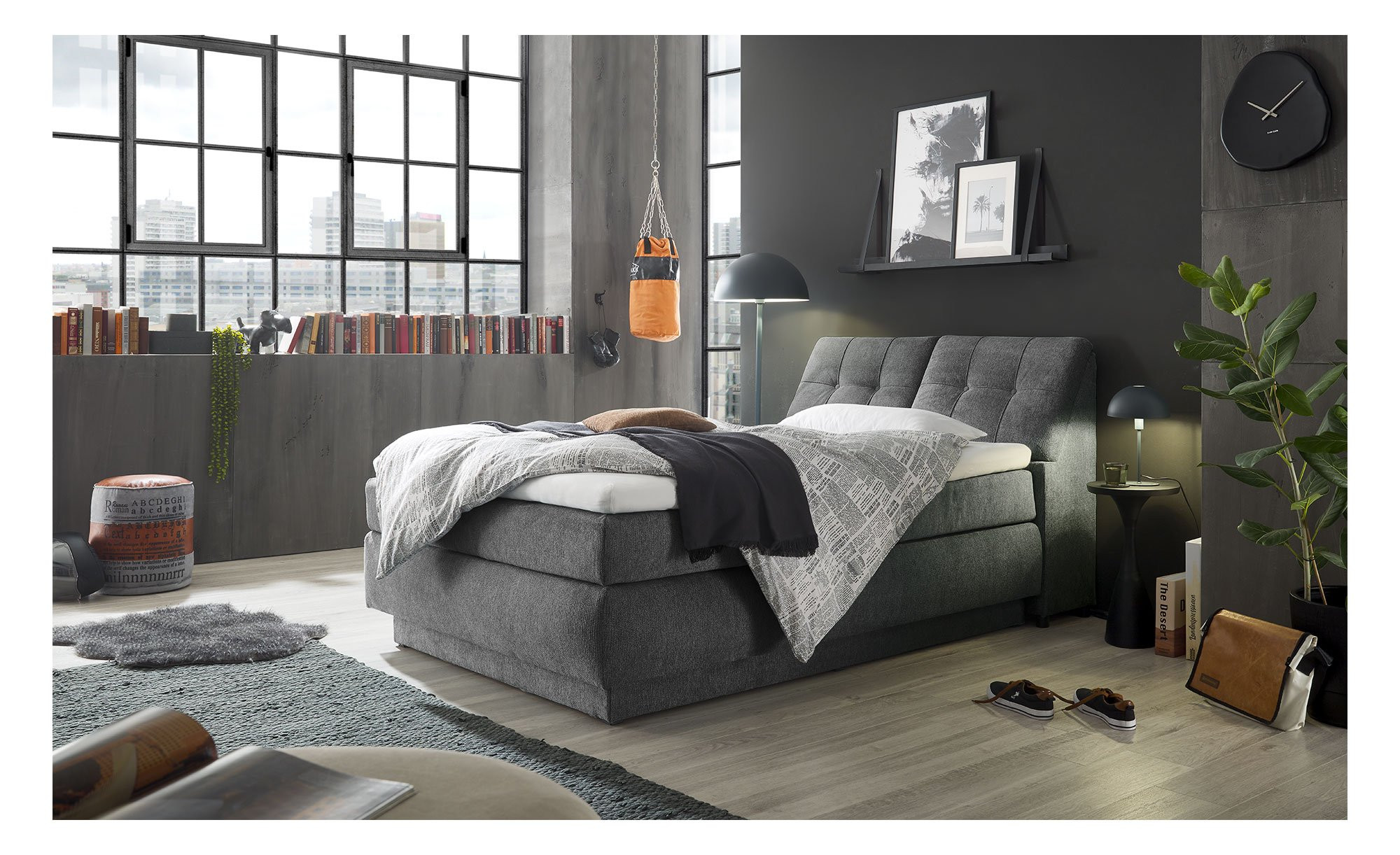 Bezogen mit einem Stoff in Anthrazit und Maßen von ca. 142 x 105 x 242 cm überzeugt dieses Möbelstück auch optisch. Es weist zudem ein attraktives Kassettenmuster am Kopfende auf.