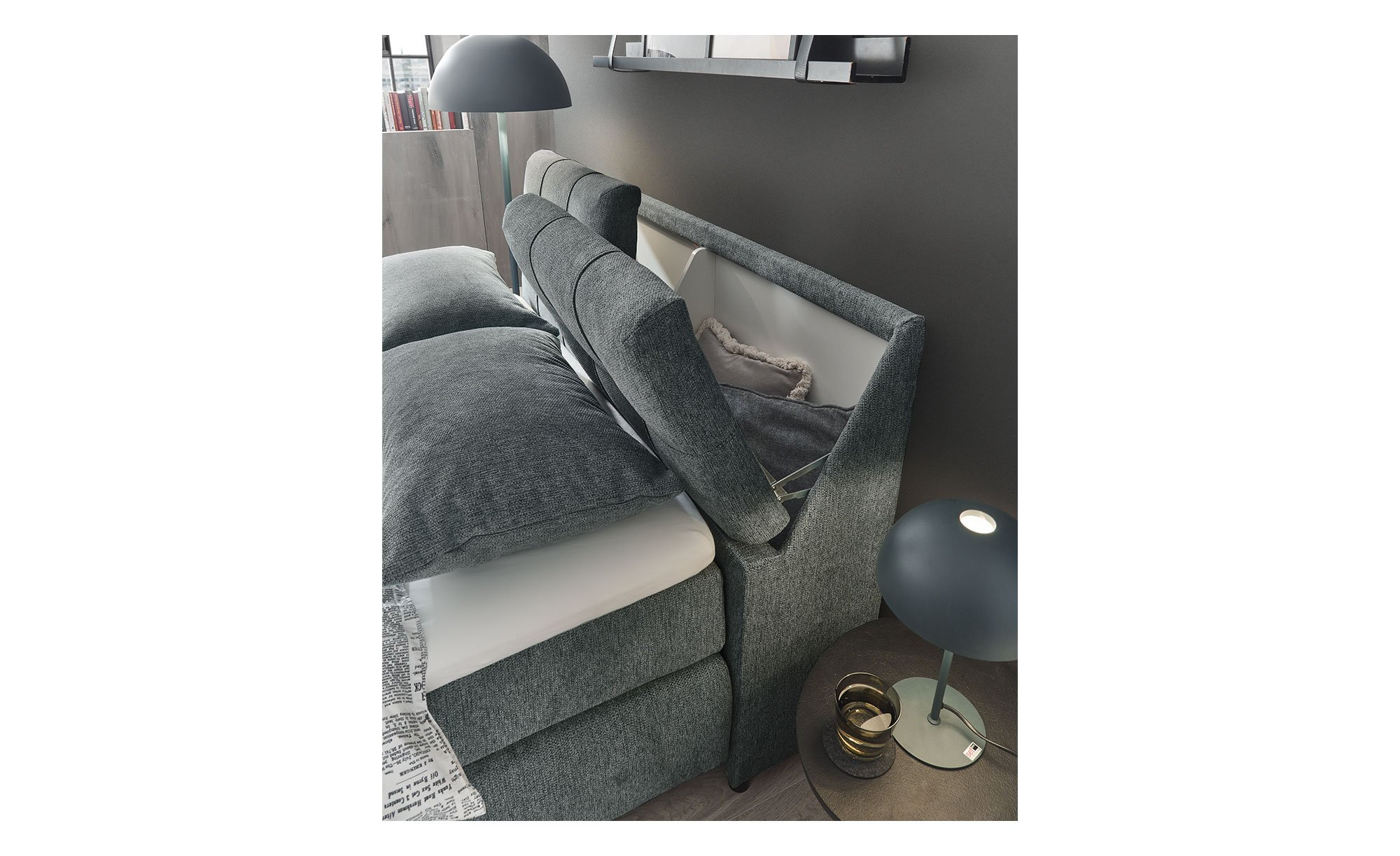- Kopfteil mit Bettkasten und Kassettenoptik