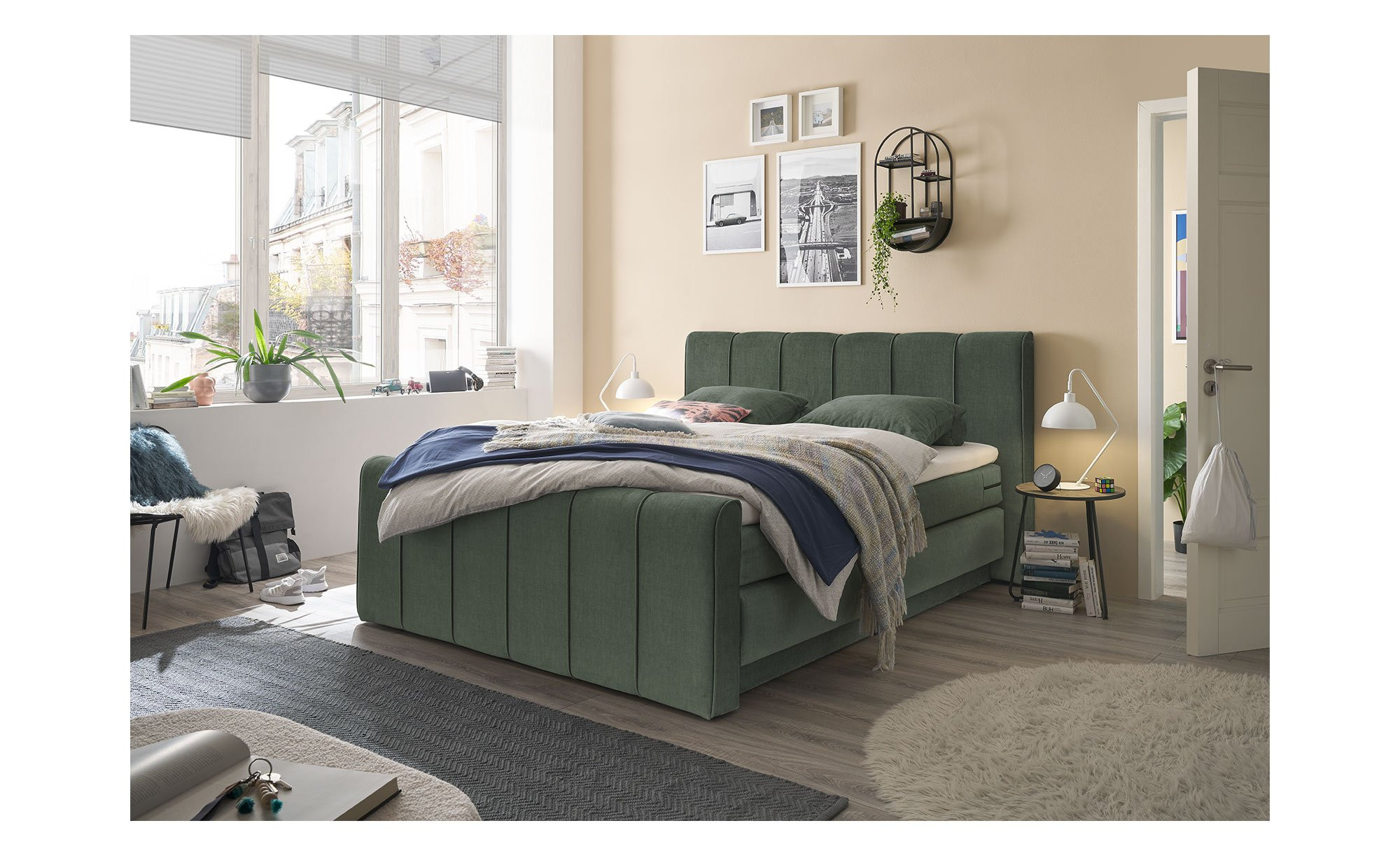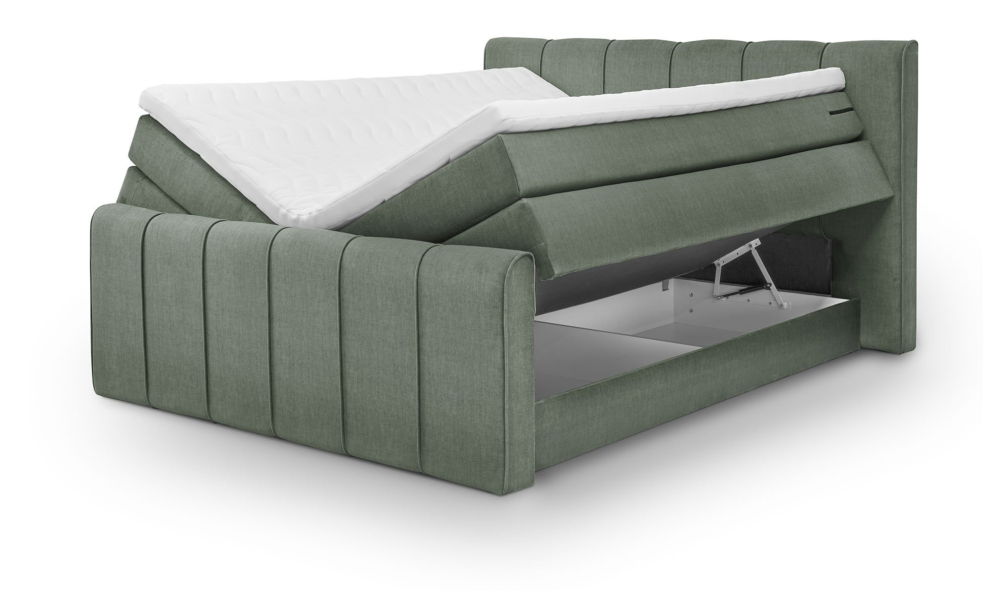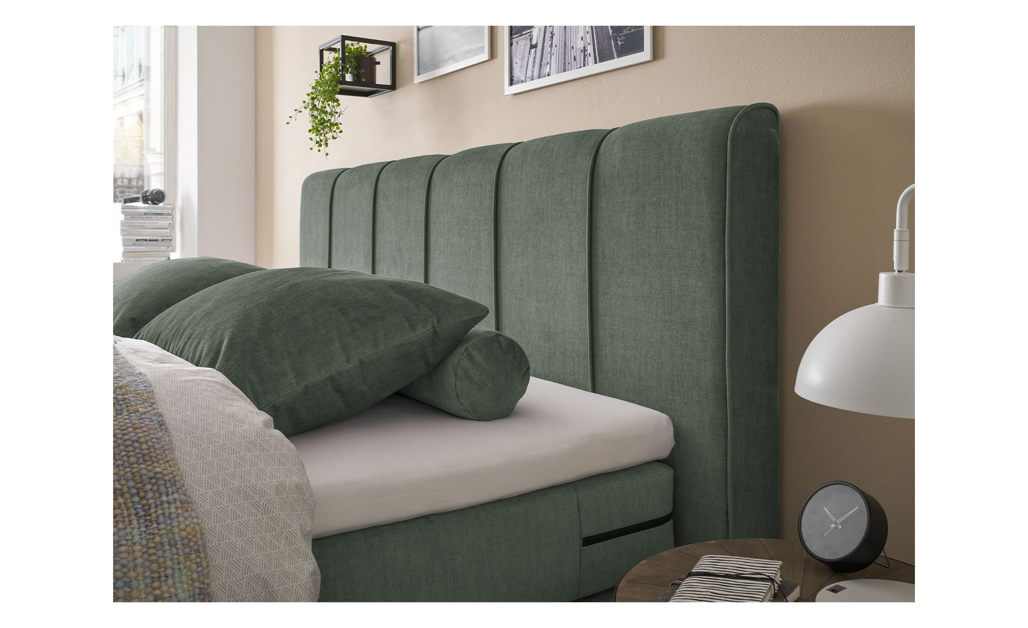 Das Bett hat eine Größe von ca. 202 x 114 x 230 cm und ist mit einem Stoffbezug aus 100 % Polyester in der Farbe Winter Moss versehen. Sowohl das Kopf- als auch das Fußteil sind mit einem vertikalen Keder verziert, der dem Bett einen eleganten Look verleiht.