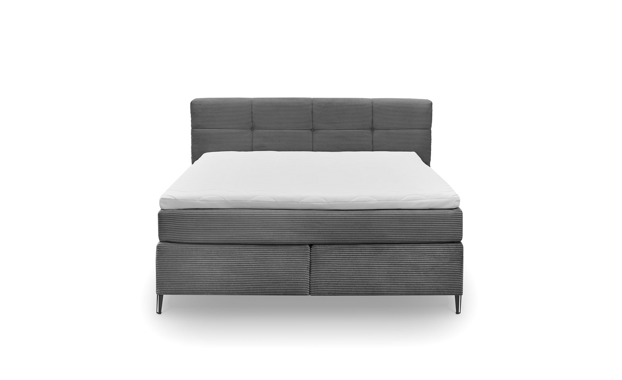 Mit seinem Mikrofaser-Bezug in Dunkelgrau ist das ca. 204 x 116 x 218 cm große Bett ein echter Hingucker. Das Kopfteil mit Kassettenfedern und die schwarzen Metallfüße (ca. 12 cm) verleihen ihm ebenfalls eine stilvolle Note und sorgen für praktischen Komfort.