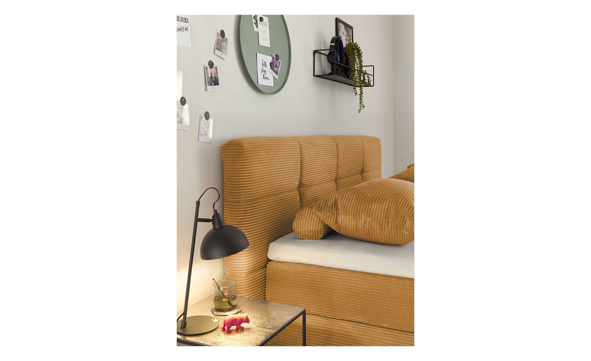 Der ca. 204 x 116 x 218 cm große Artikel ist mit einem gelben Mikrofaser-Bezug versehen, der für eine freundliche, einladende Atmosphäre sorgt. Das Kopfteil mit Kassettenfedern sowie die ca. 12 cm hohen Metallfüße in Schwarz fügen sich harmonisch ins Gesamtbild ein.