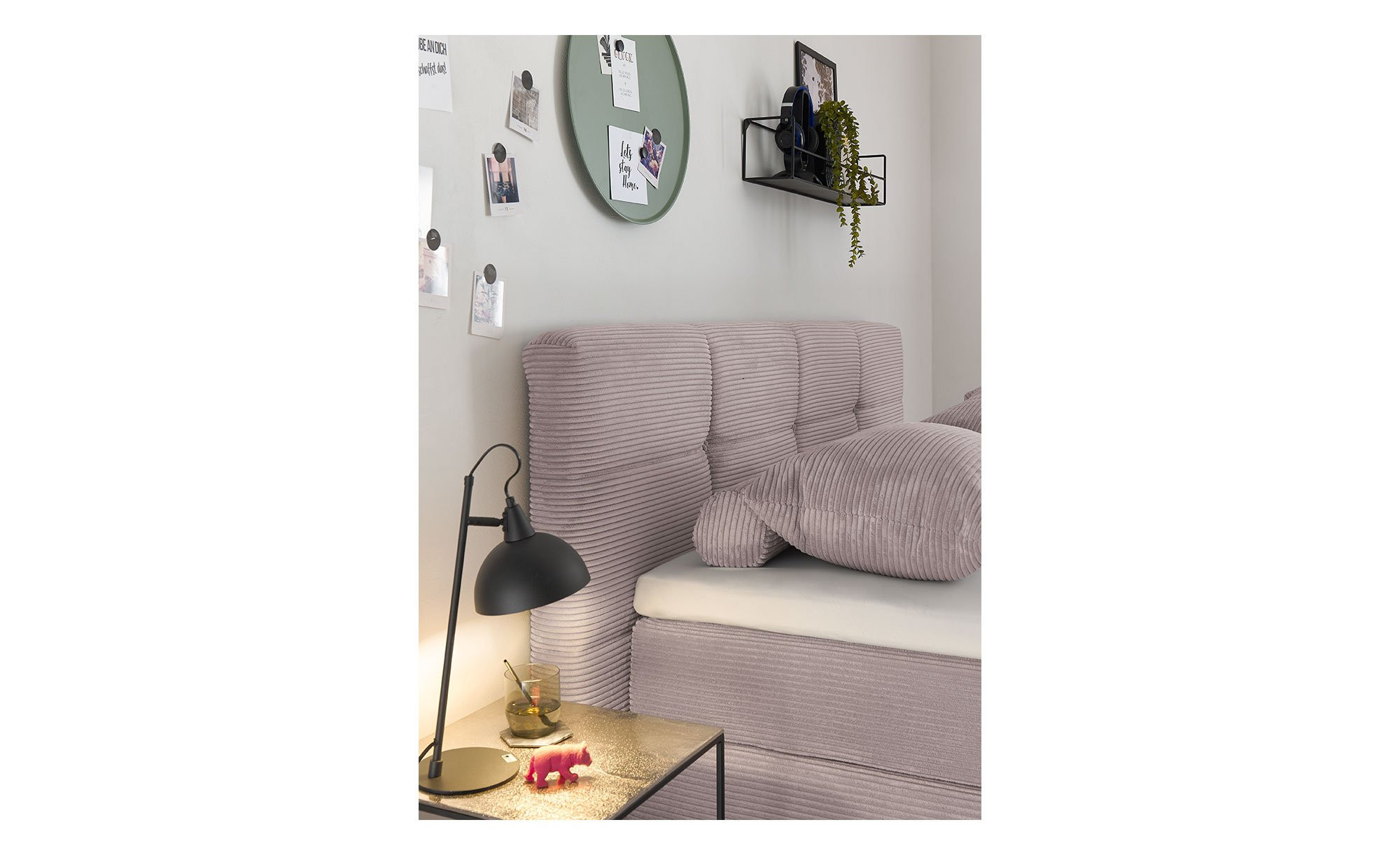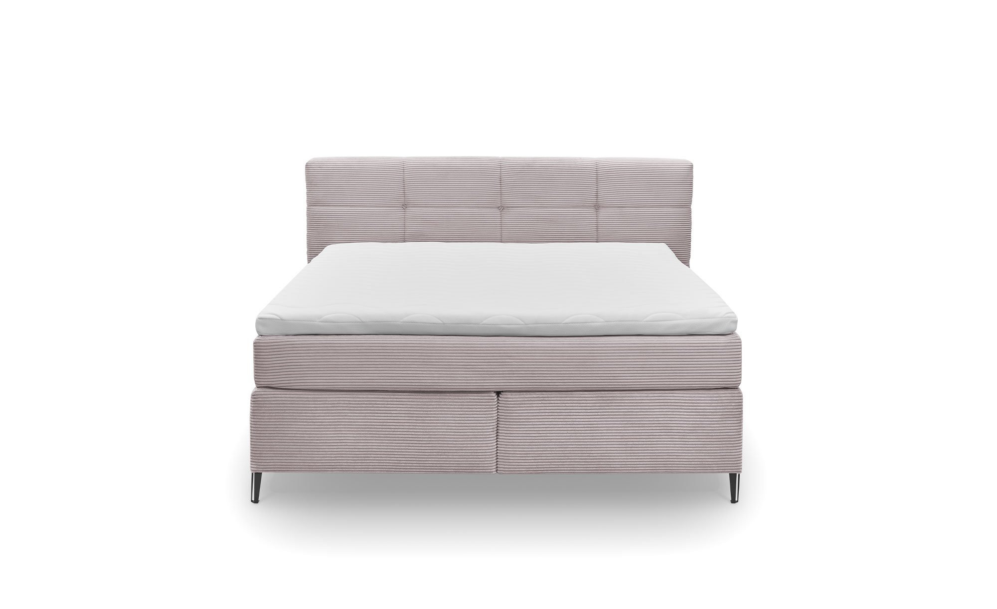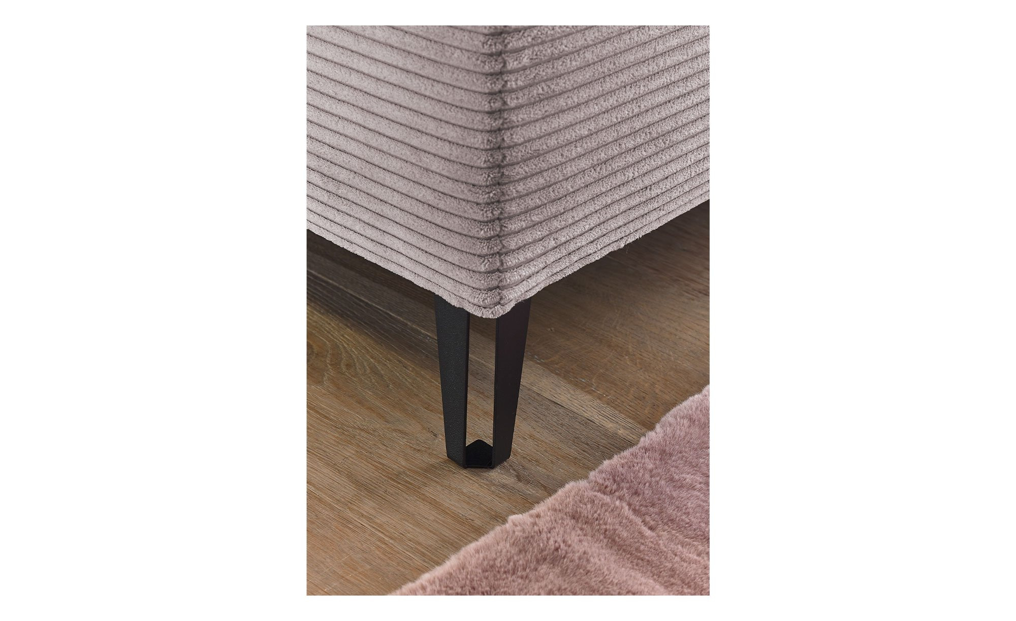 Das ca. 204 x 116 x 218 cm große Bett überzeugt mit einem Mikrofaser-Bezug in Rosa, der einen modernen und gleichzeitig einladenden Look kreiert. Ein Kopfteil mit Kassettenfedern sorgt für extra Komfort, während die schwarzen Metallfüße auf ca. 12 cm Höhe dem Bett das gewisse Etwas verleihen.