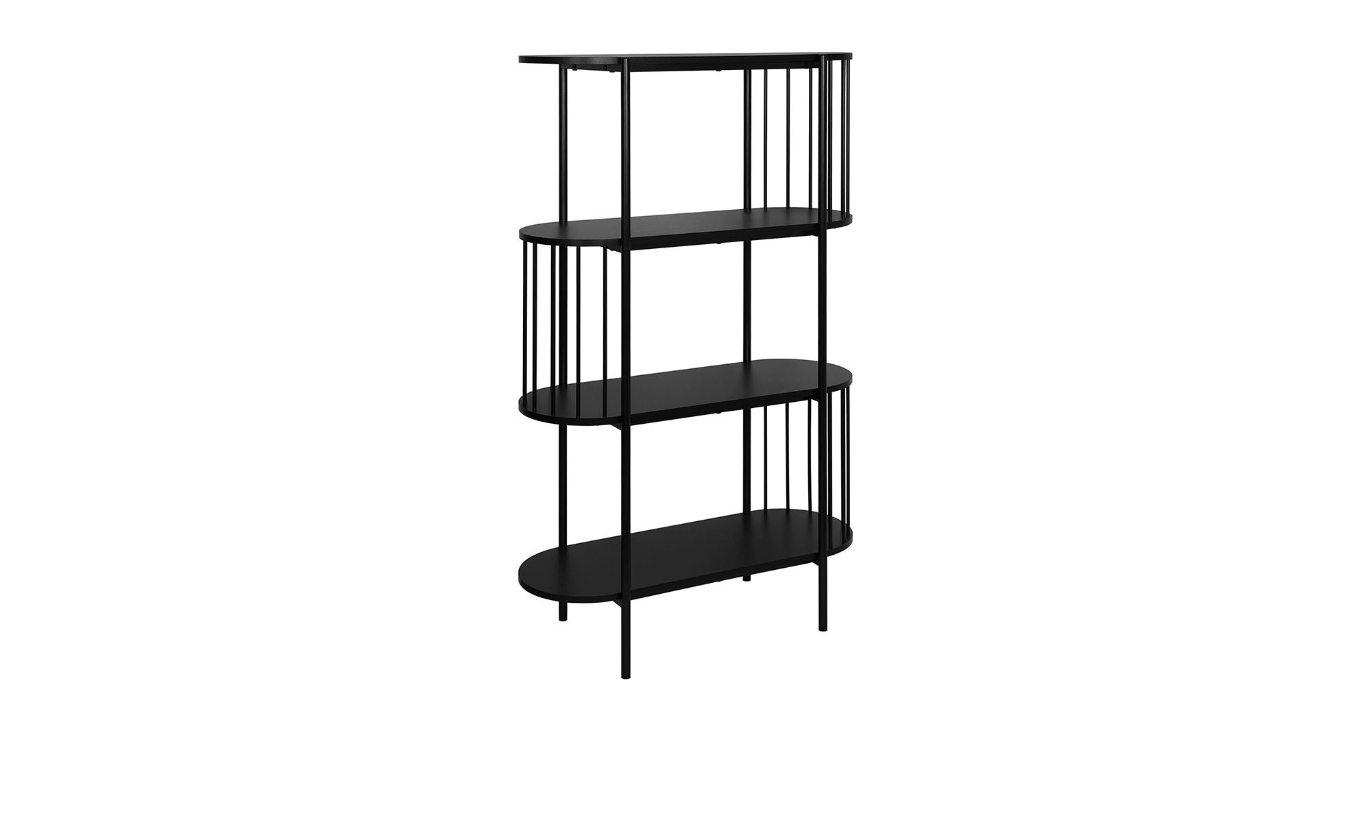 Das Möbelstück misst ca. 80 x 133,5 x 34 cm und verfügt über ein stabiles Gestell aus pulverbeschichtetem Stahl. Es ist in Schwarz gehalten und passt damit perfekt zu den Böden aus MDF in der gleichen Farbe. Eine Melaminharzbeschichtung schützt hier zuverlässig vor Verschleiß.