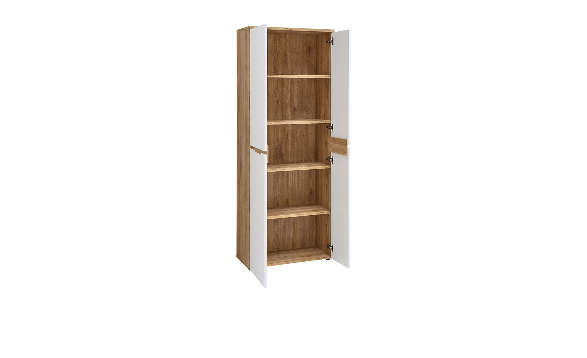 Der ca. 75 x 197 x 38 cm große Artikel verfügt über einen Holzwerkstoff-Korpus in einer natürlichen Mauvella Oak Nachbildung. Dieses Design findet sich außerdem am Innendekor und an der Rückwand des Möbels. An den aus Holzwerkstoff - MDF bestehenden Fronten in supermattem Weiß wurden Griffausfräsungen integriert. Als Füße fungieren bodenschonende Kunststoffgleiter.