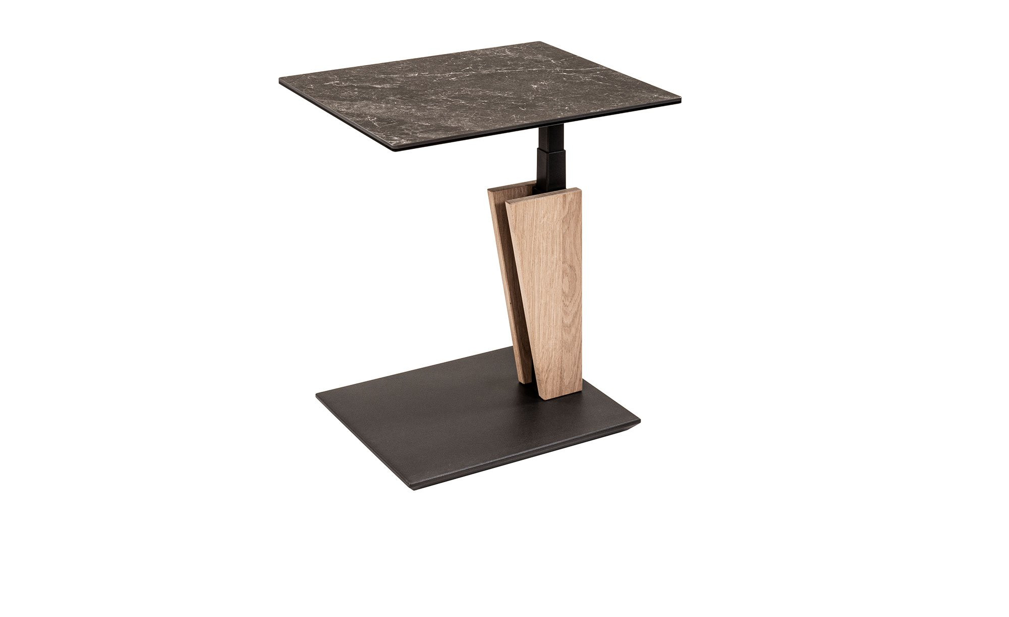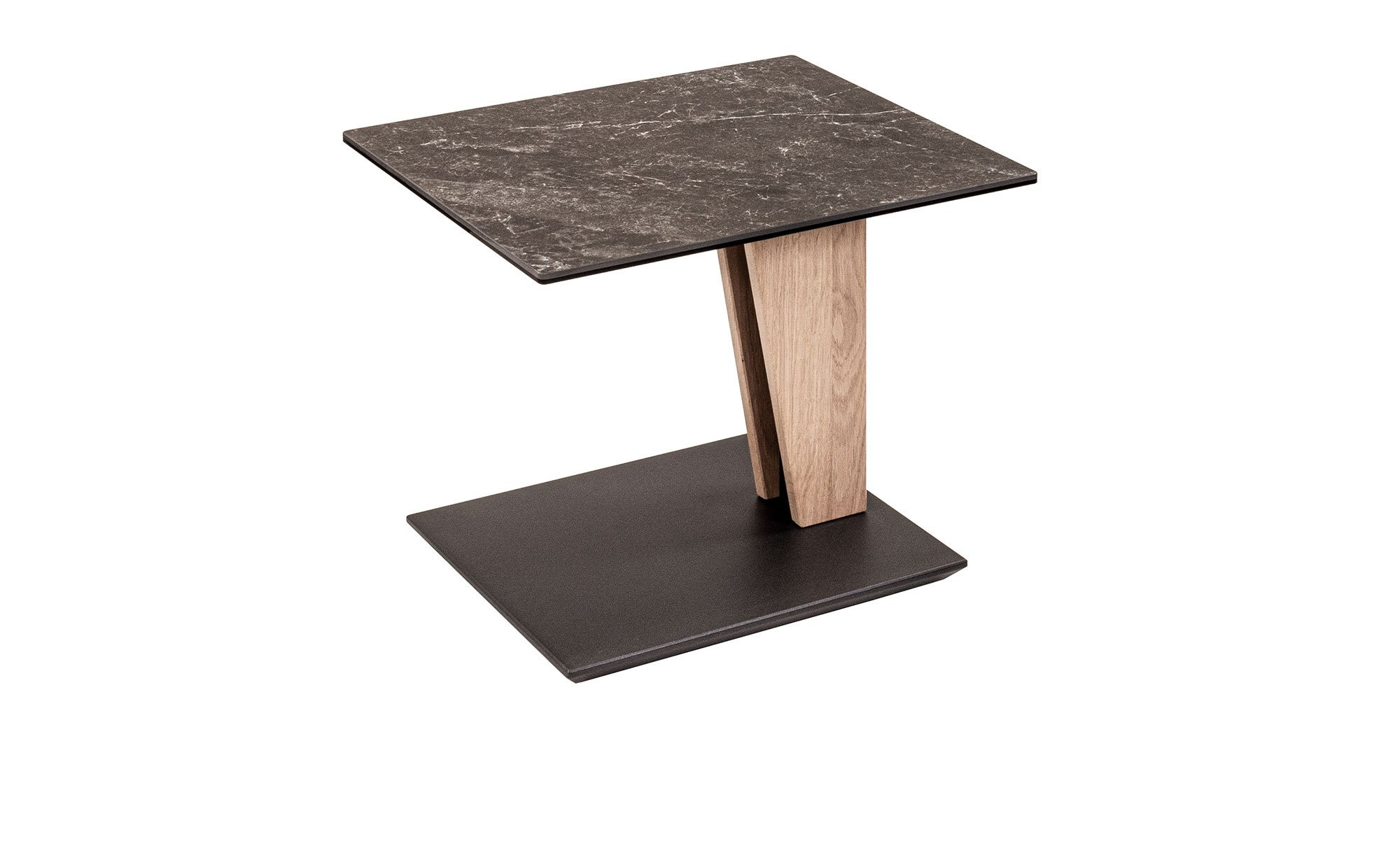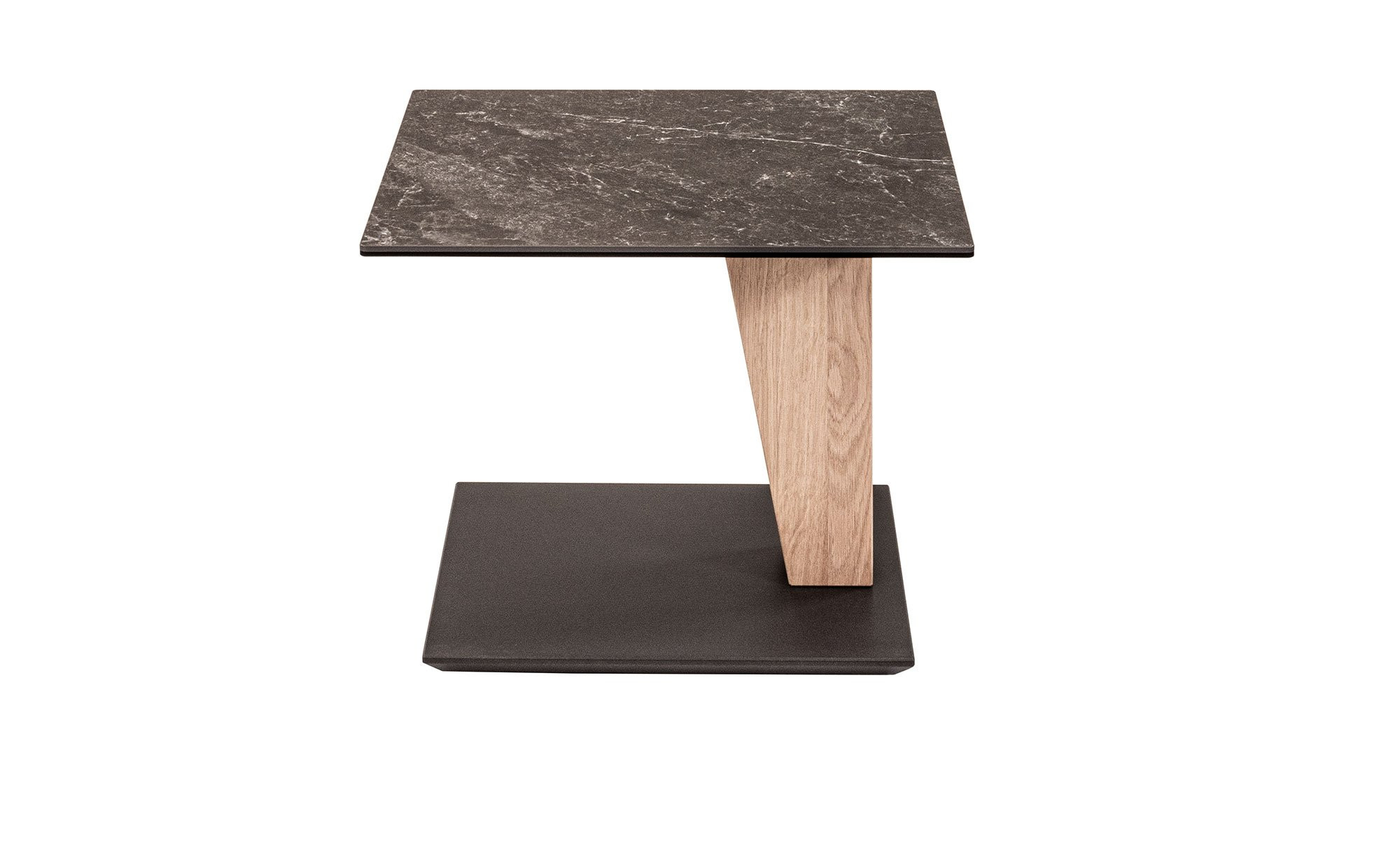 Der rechteckige Tisch ist ca. 55 x 47 x 47 cm groß. Er verfügt über eine Platte aus Schwarz Nero Keramik auf Glas und ein dazu passendes Gestell mit Metallfuß. Hier findet sich eine faszinierende Verbindung aus einer Lackierung in Anthrazit-Metallic und geölten Bestandteilen aus massiver Wildeiche.