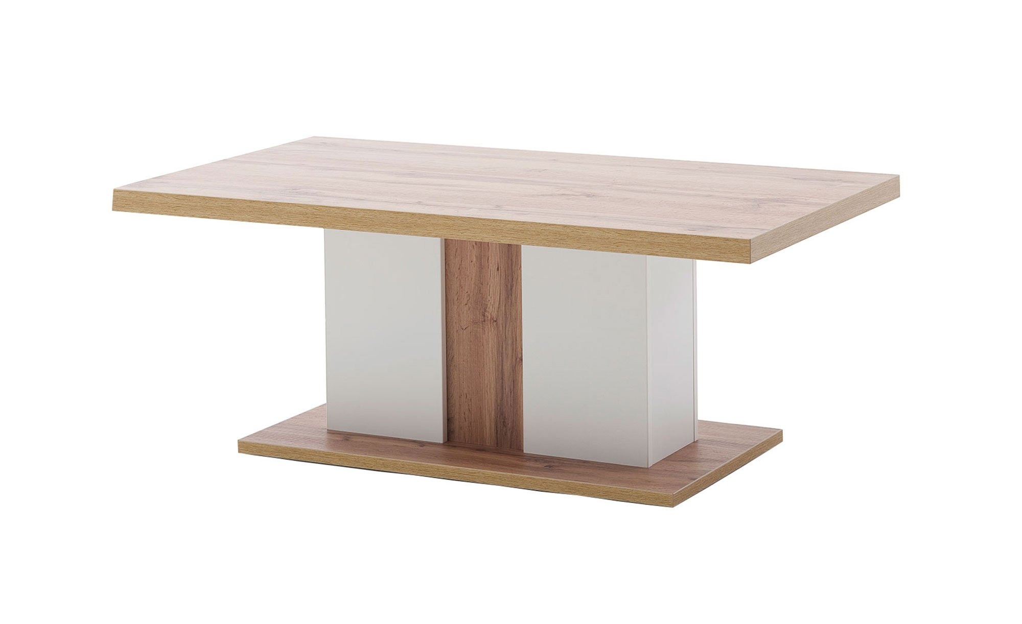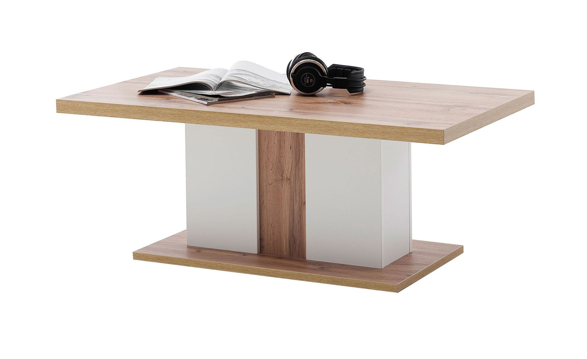 Sowohl der Boden als auch die rechteckige Tischplatte wurden im ansprechenden Dekor Wotan Eiche Melamin Nachbildung gestaltet. Die Beschichtung sorgt für eine große Widerstandsfähigkeit und macht die Oberflächen somit langlebig. Die Farbgebung findet sich auch teilweise beim Säulenfuß wieder, wobei dieser zusätzlich von einer weißen Faserplatte ummantelt ist. Insgesamt ist der Tisch ca. 115 x 45 x 65 cm groß.