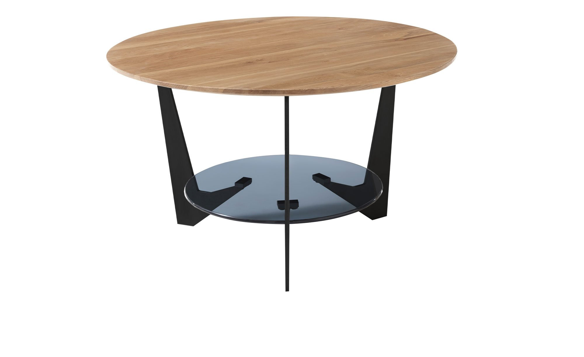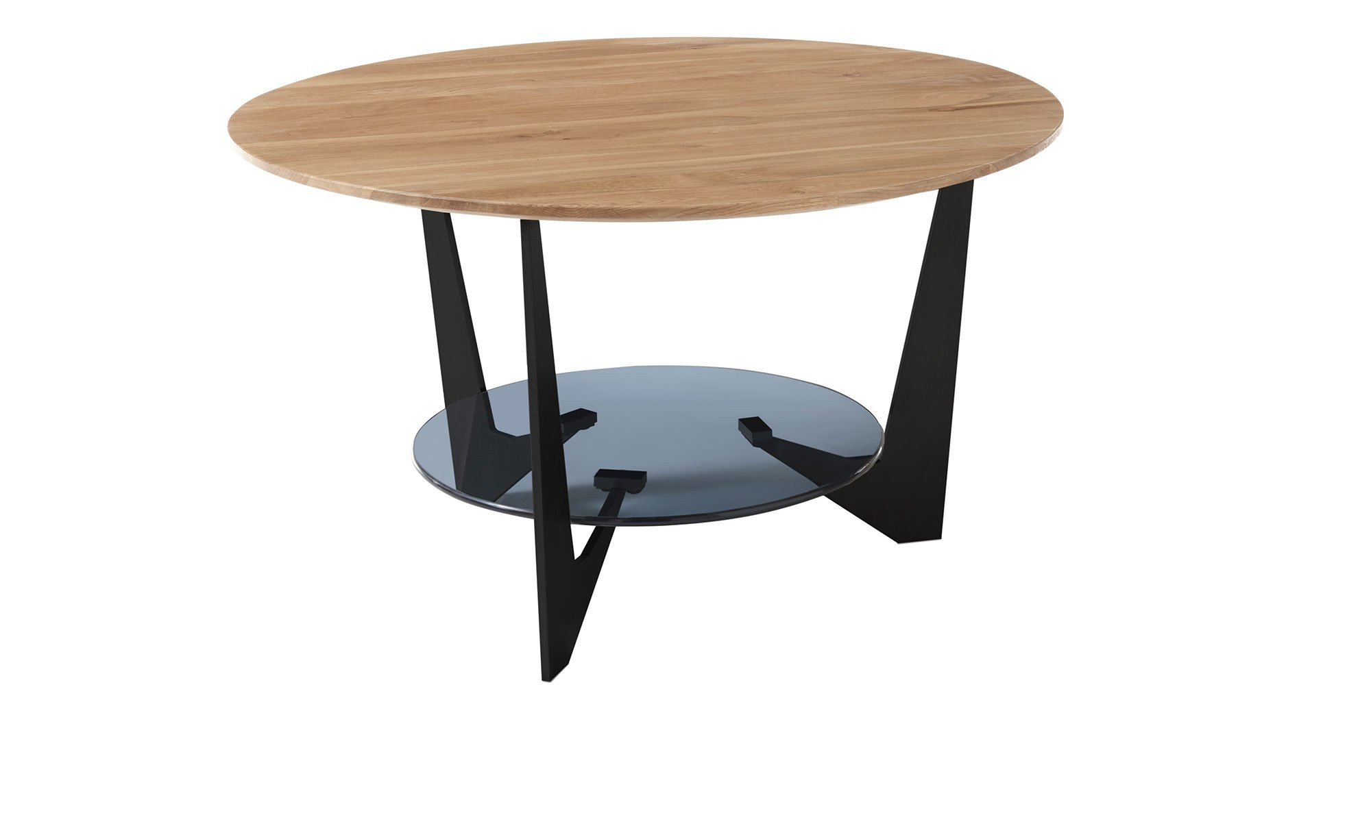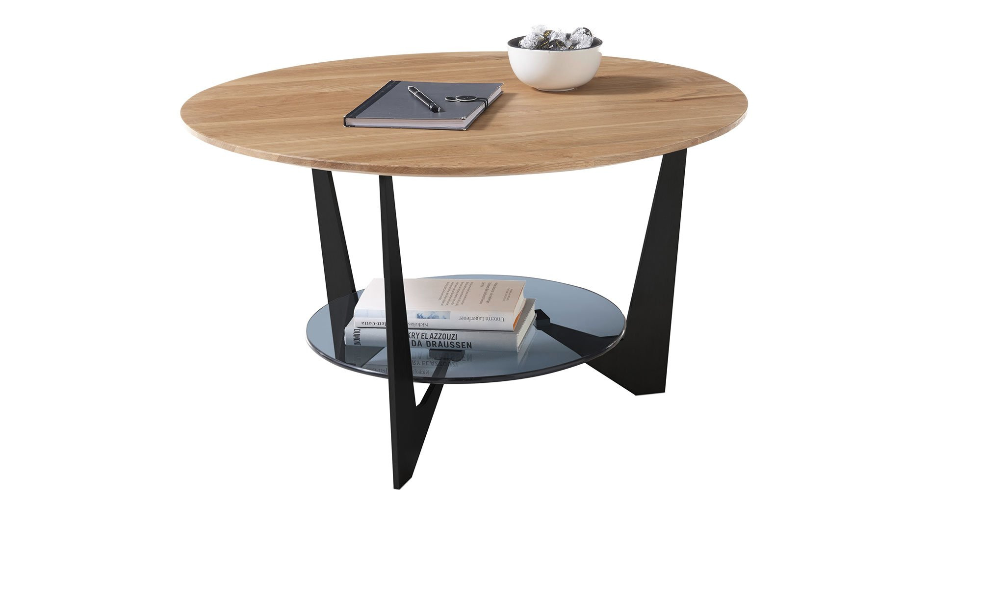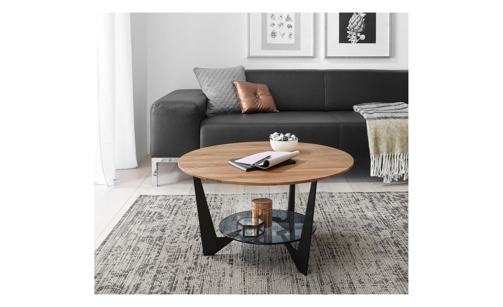 Der runde Tisch ist ca. 40 cm hoch und verfügt über eine Platte aus geöltem Echtholz im Dekor Eiche Natur. Ihr Durchmesser liegt bei ca. 70 cm. Ein stabiles Metallgestell mit drei Füßen und matt-schwarzer Lackierung gewährleistet den nötigen Halt. Besonders praktisch ist die zusätzlich integrierte Ablageplatte aus grauem Glas.