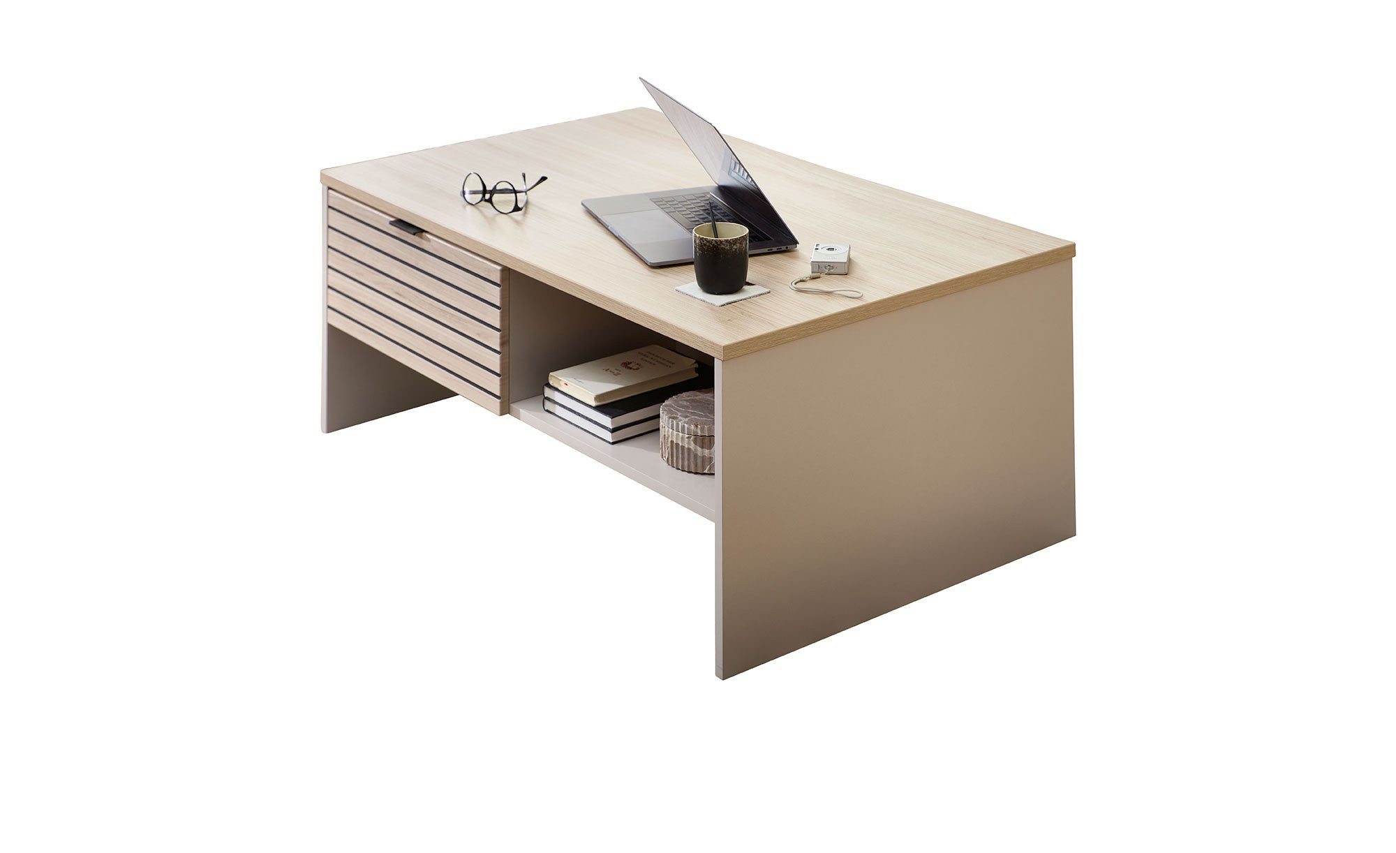 Das ca. 110 x 44 x 65 cm große Möbelstück besteht aus Holzwerkstoff. Während das Gestell in einem edlen Kaschmir-Ton gehalten ist, setzt sich die rechteckige Tischplatte mit einer Riva Eiche-Nachbildung gelungen ab.
