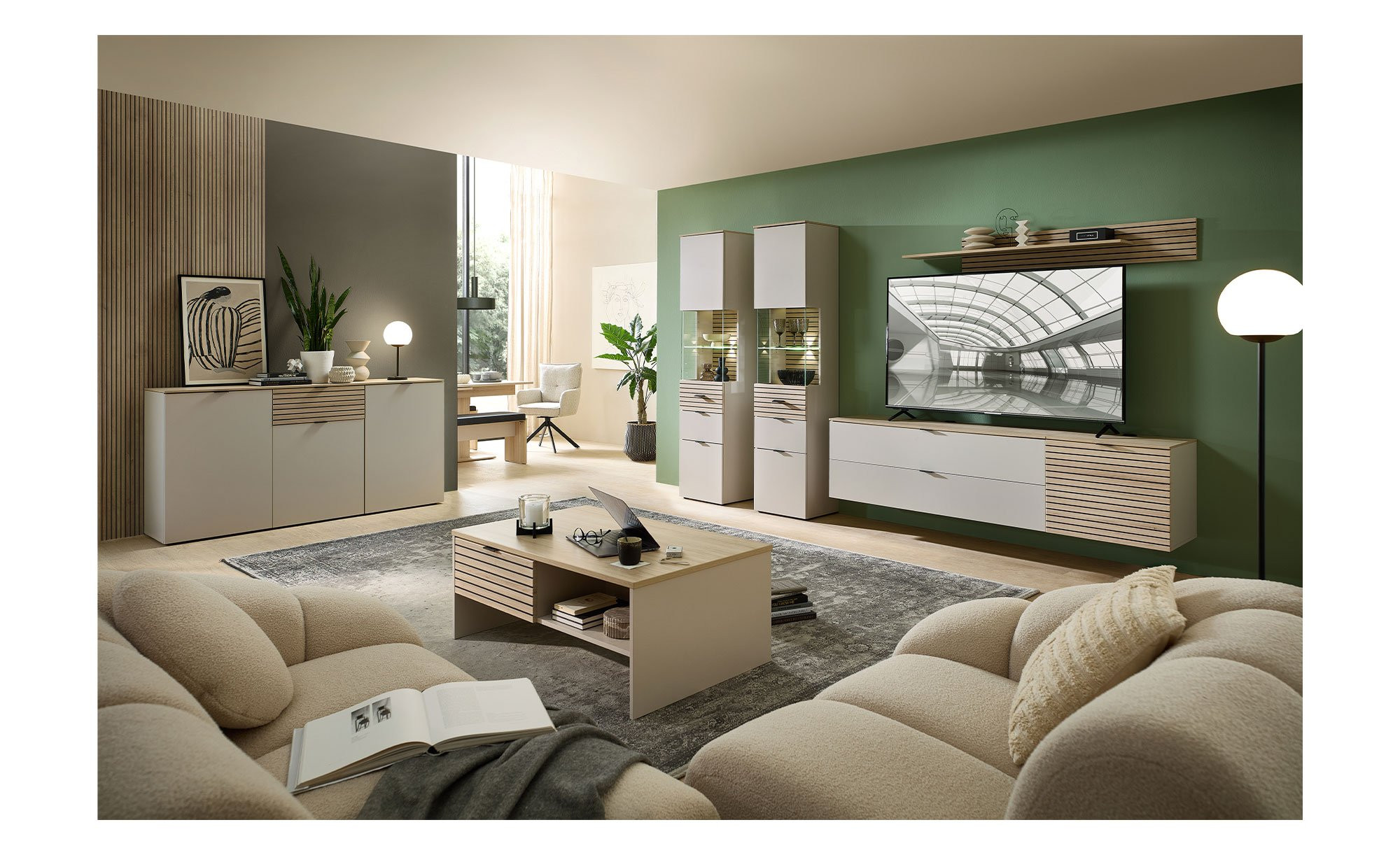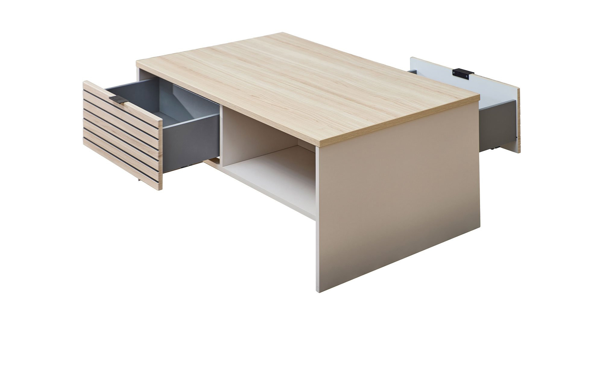 An der Schubkastenfront findet sich ebenfalls das Holz-Dekor, hier in einer ansprechenden Leisten-Variante. Außerdem wurde ein Metallgriff in mattem Schwarz integriert, mit dem sich die Schublade öffnen lässt. Zwei offene Fächer bieten zusätzlichen Stauraum.