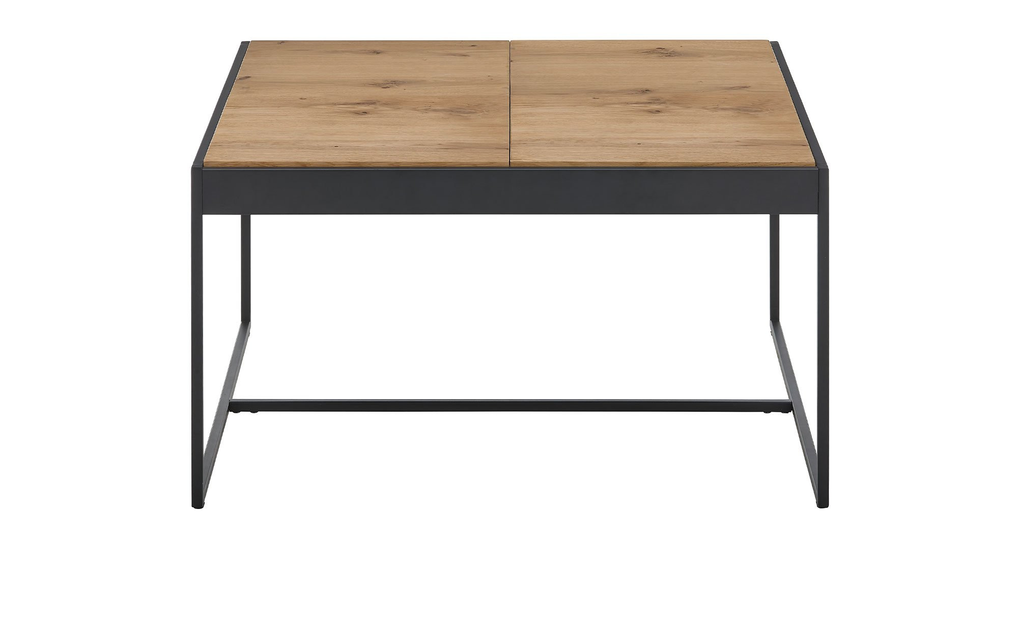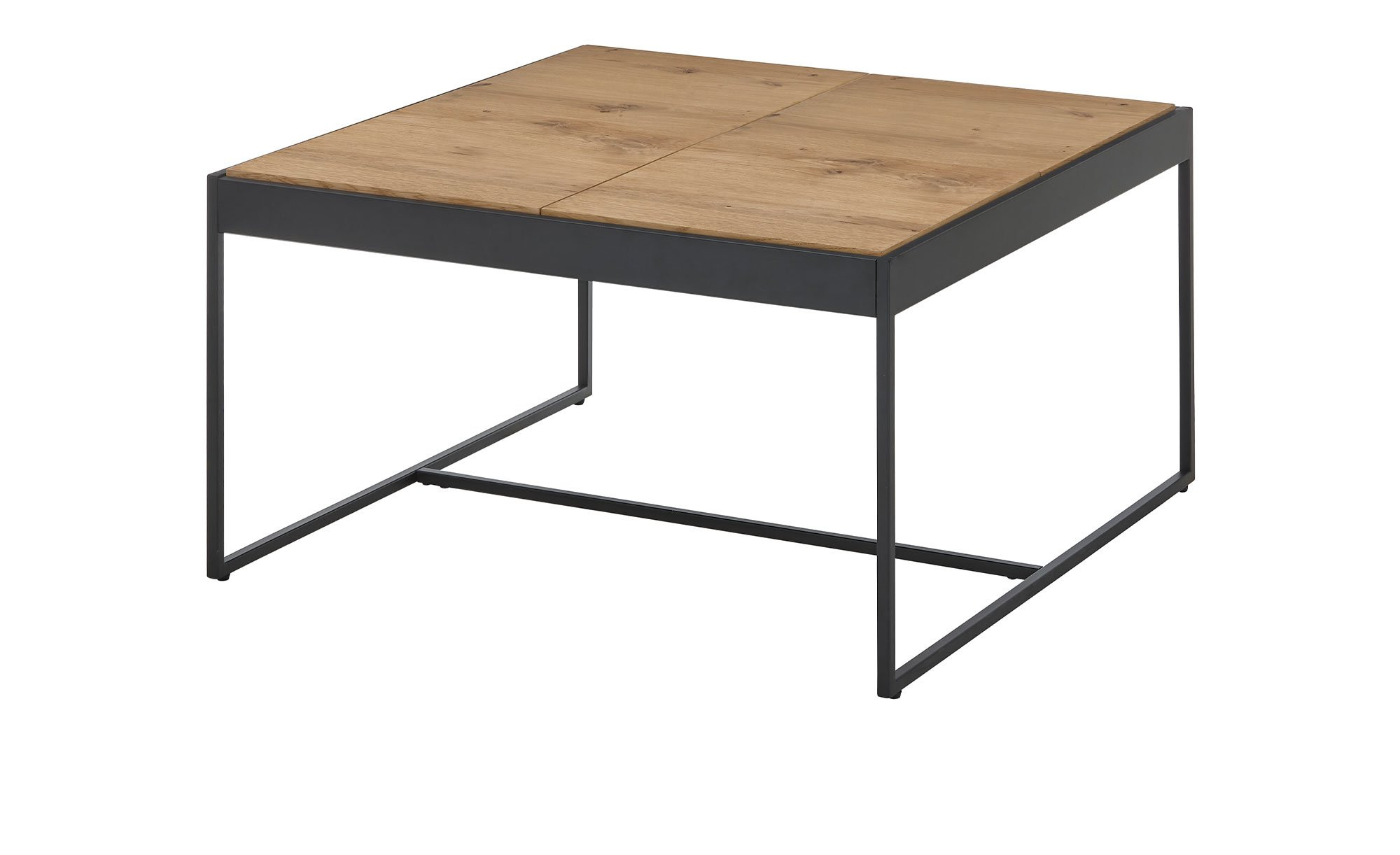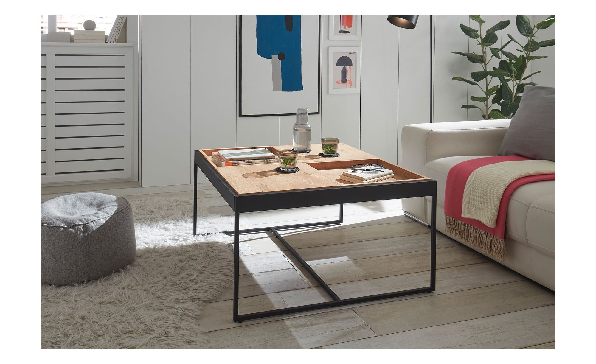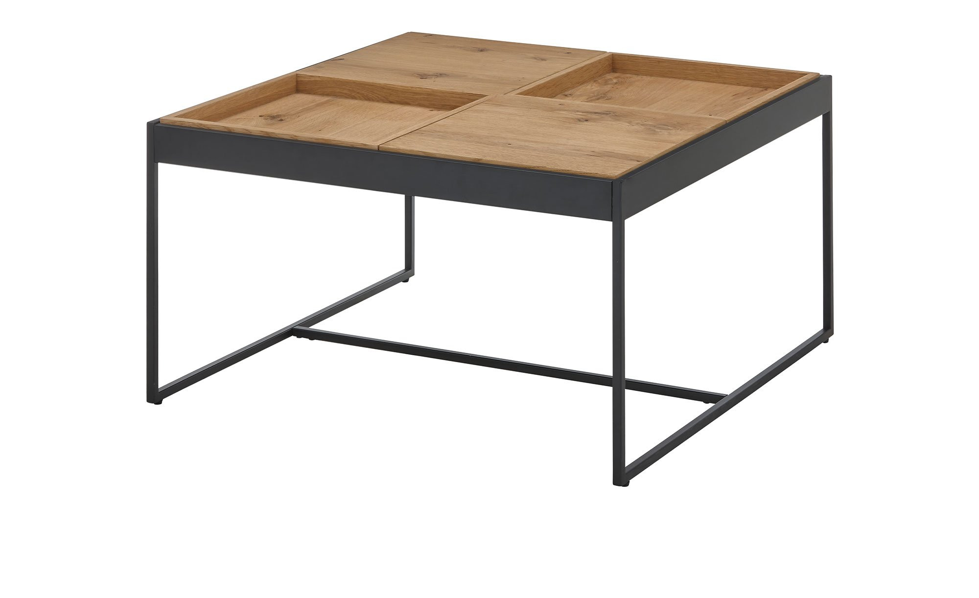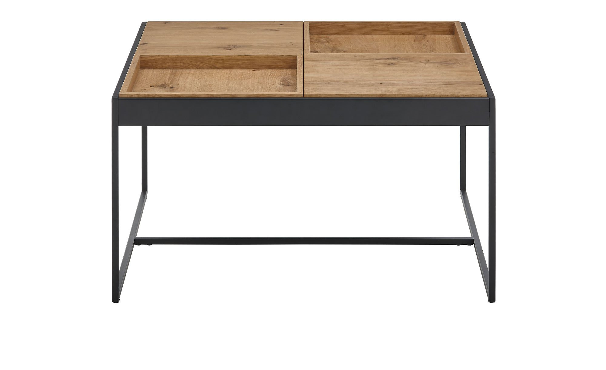 Das quadratische Möbelstück mit Maßen von ca. 83 x 45 x 83 cm ist mit einem schwarzen Kufengestell aus pulverbeschichtetem Metall ausgestattet. Dieses trägt die HWP-Platte mit geöltem Eichenfurnier. Das Besondere? Die Tischplatte besteht aus vier einzelnen Tabletts, die sich unabhängig voneinander drehen lassen!