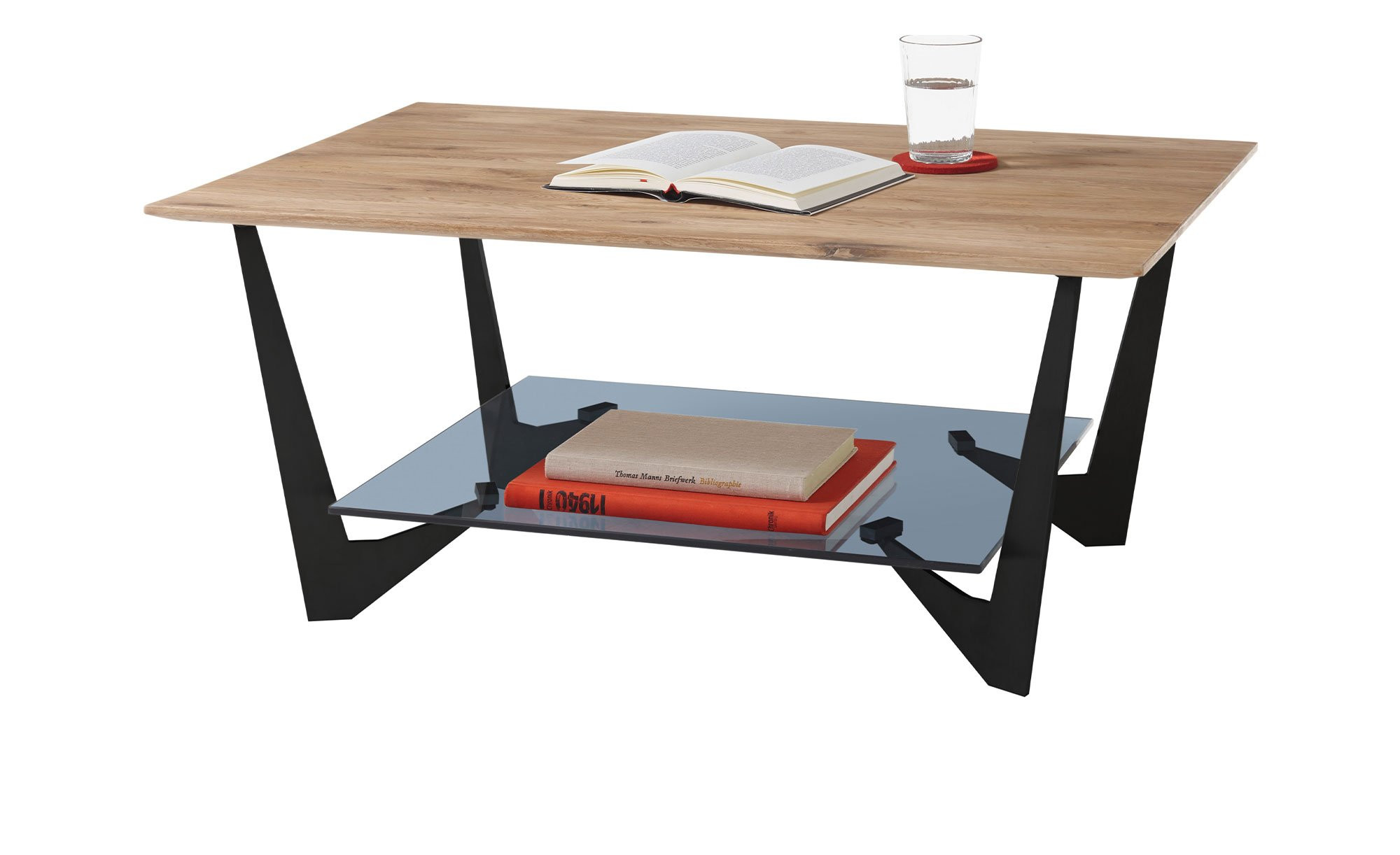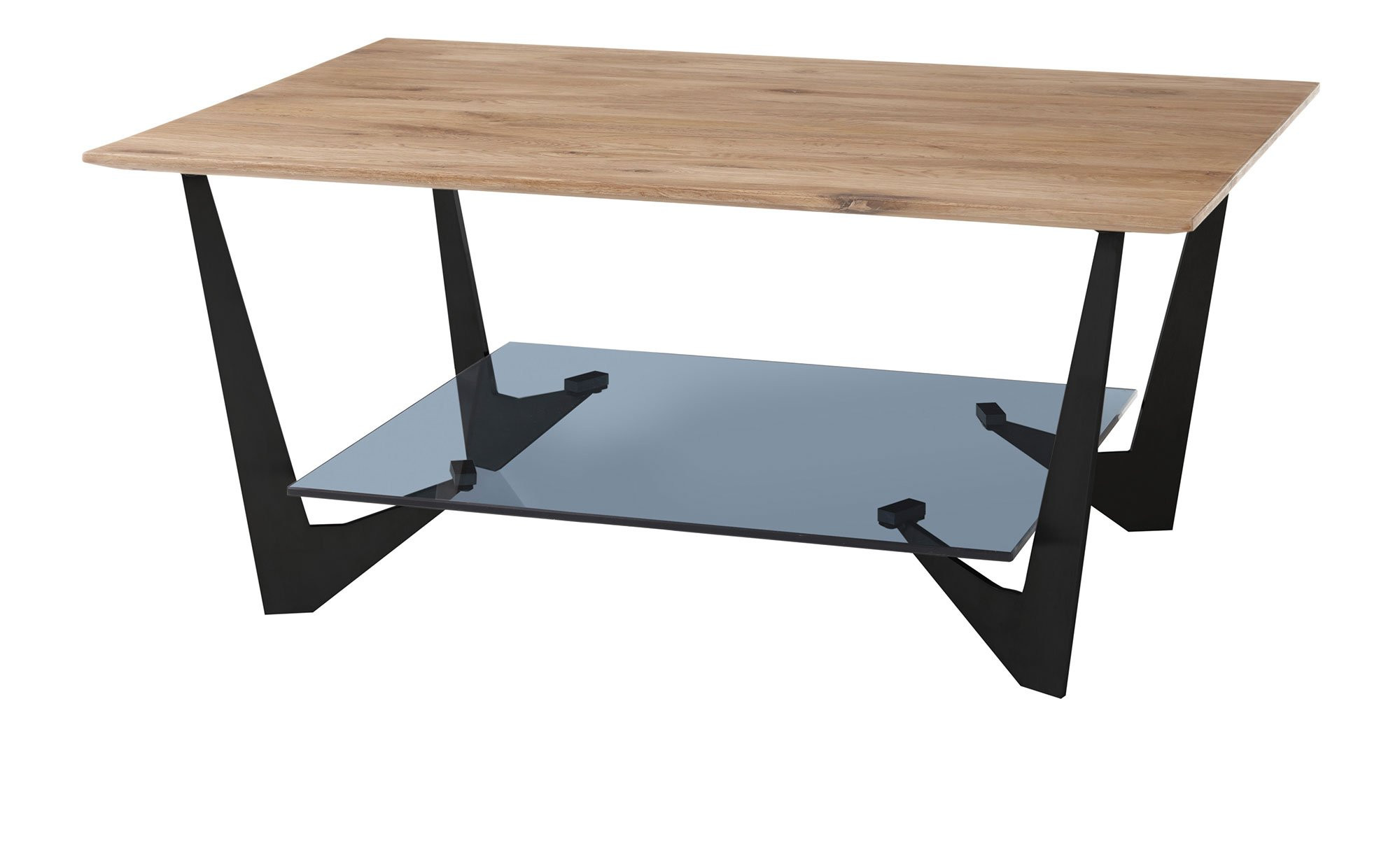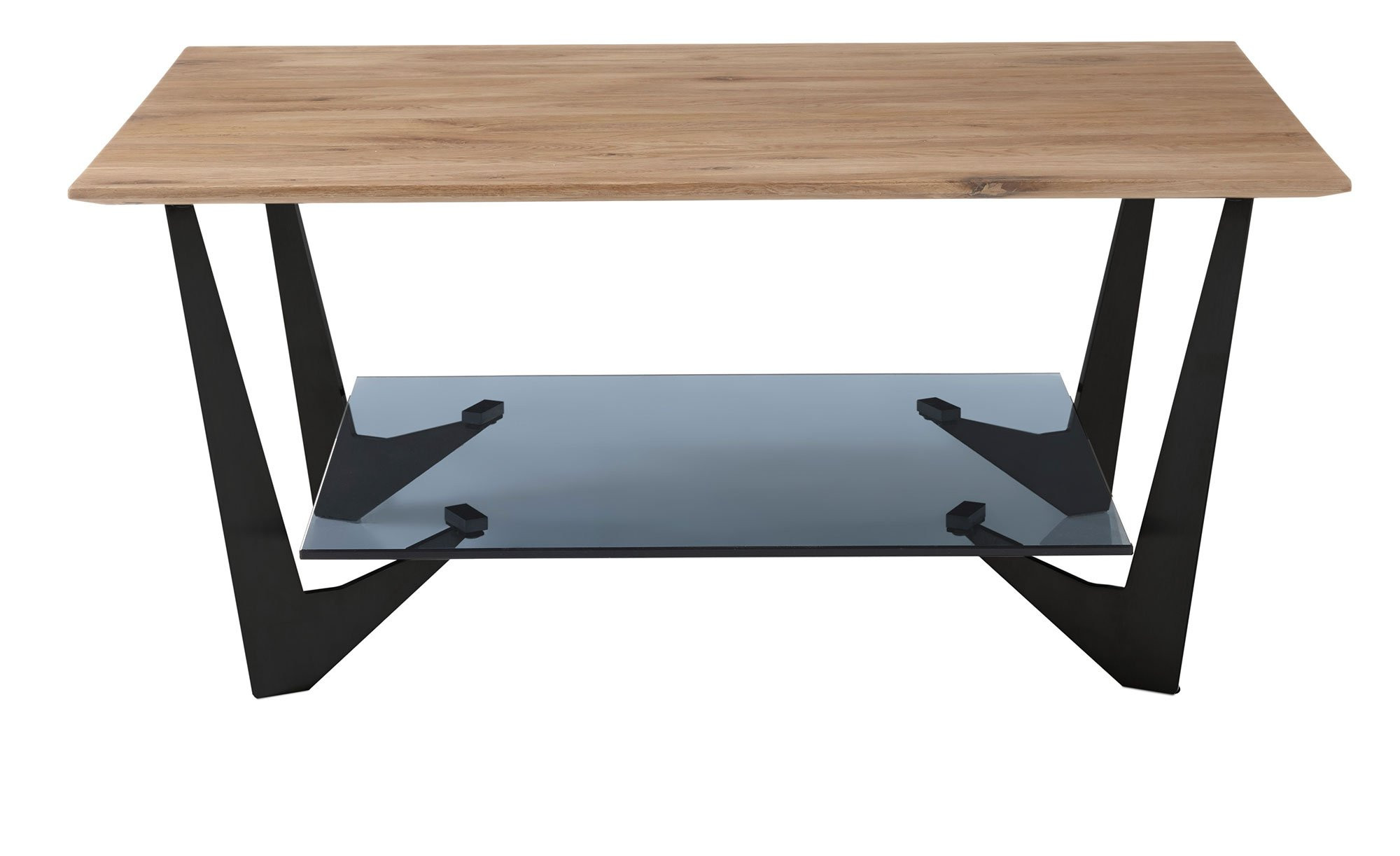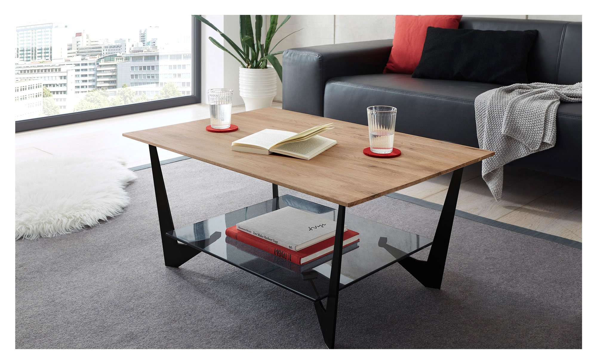 Ein vierfüßiges, in mattem Schwarz lackiertes Gestell bildet die Basis des ca. 90 x 40 x 60 cm großen Tischs. Es trägt eine rechteckige Platte aus geöltem Echtholz. Durch das Eiche Natur-Dekor entsteht ein gelungener Kontrast innerhalb der modernen Optik. Verstärkt wird dieser zusätzlich durch einen grauen Ablageboden aus Glas.