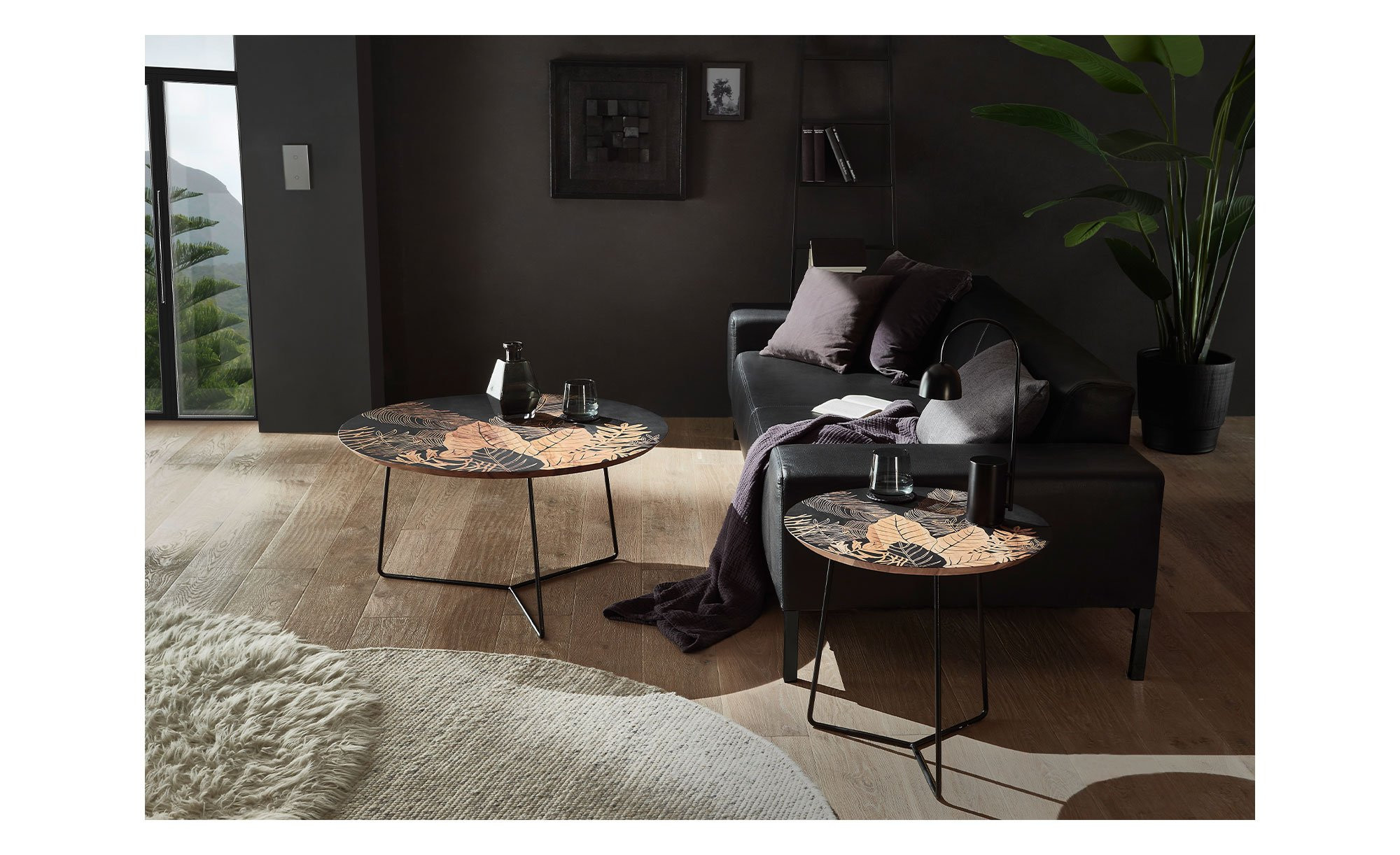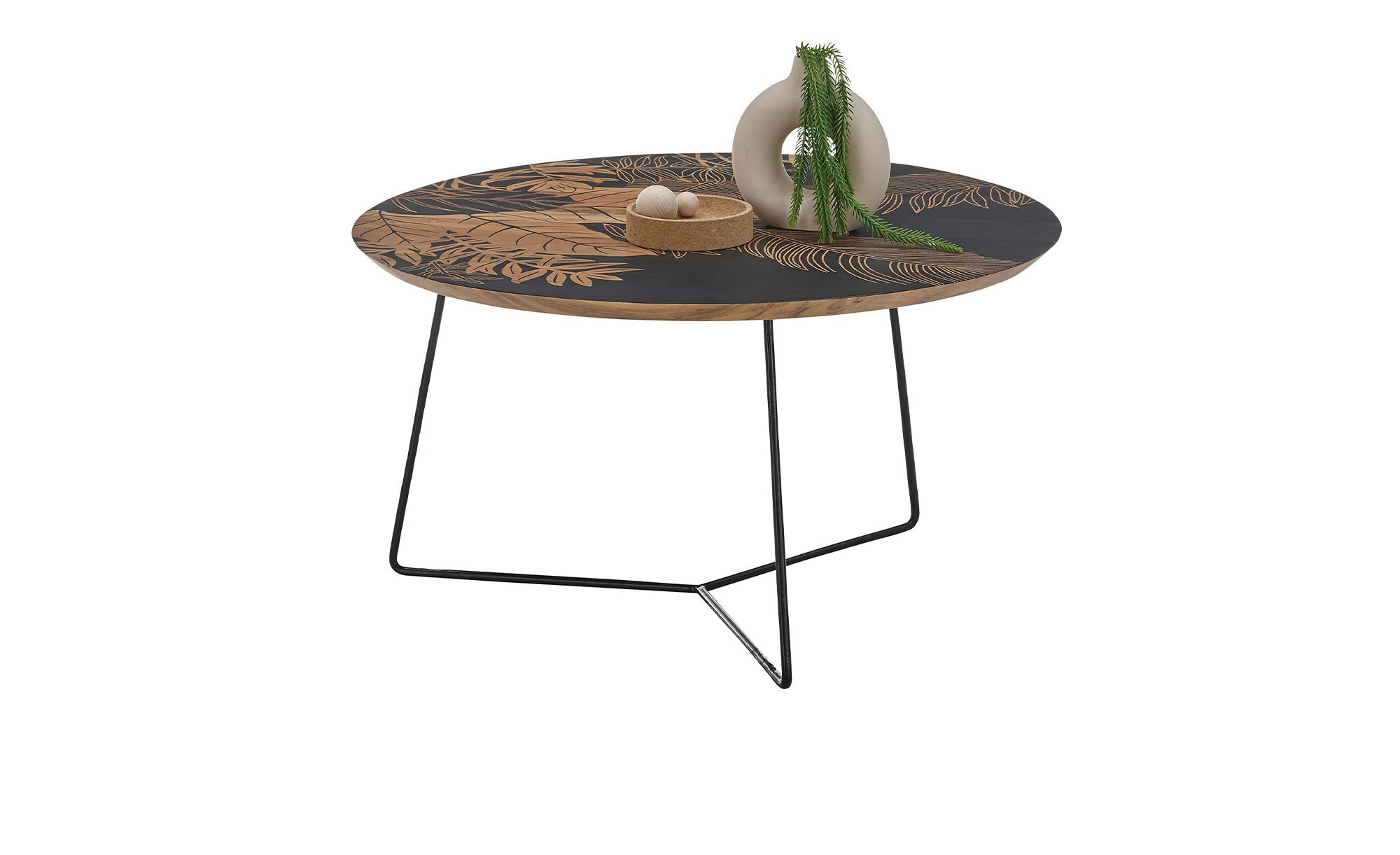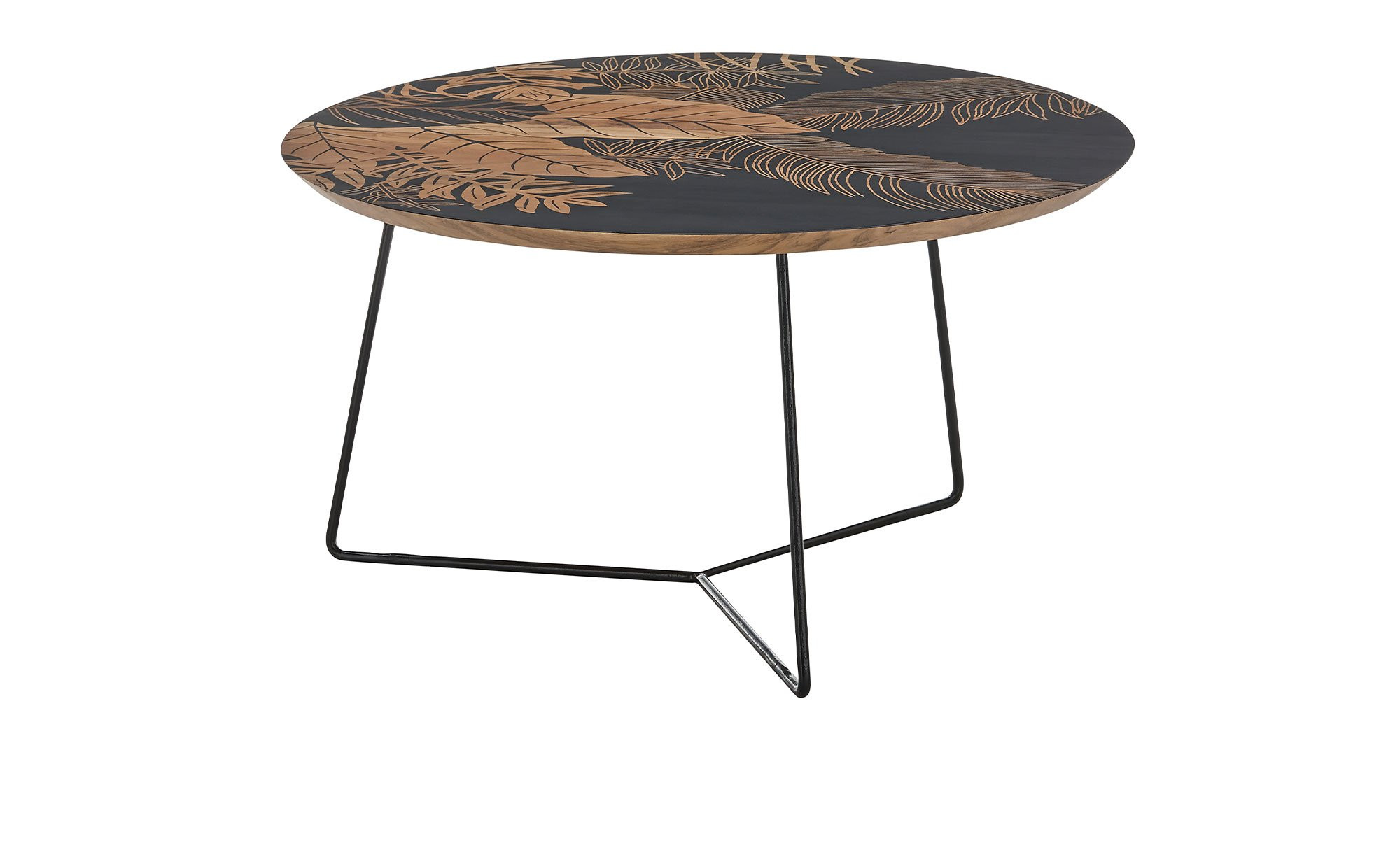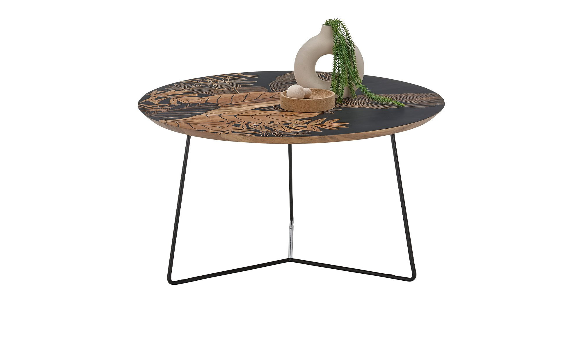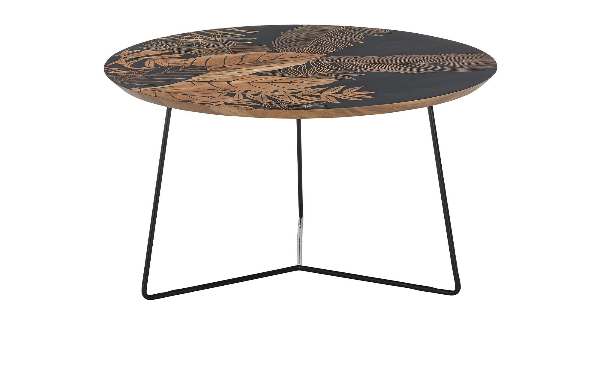 Die runde Platte des ca. 85 x 45 x 85 cm großen Möbelstücks besteht aus natürlichem Mangoholz mit einem floralen Druck in Schwarz. Getragen wird sie von einem filigranen Gestell aus matt-schwarzem Metall mit Pulverbeschichtung.