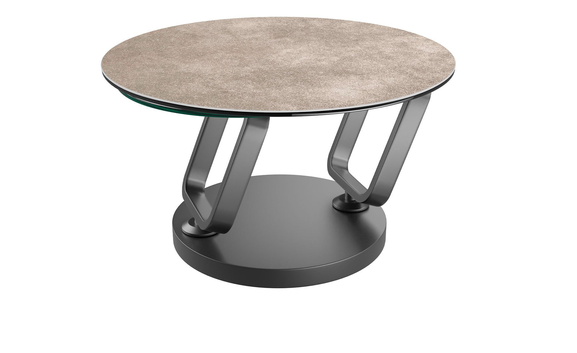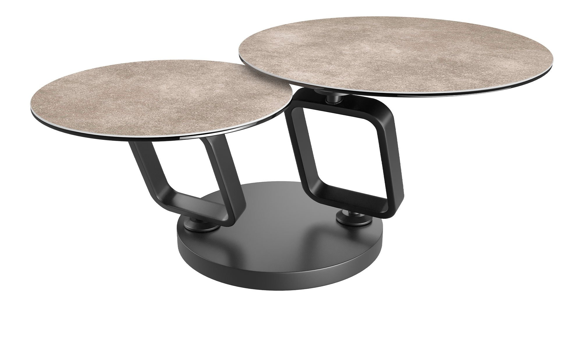 Das Möbelstück verfügt über zwei in unterschiedlichen Höhen angebrachte, verstellbare Tischplatten. Sie bestehen aus ca. 3 mm Keramik und ca. 6 mm Glas. Mit ihrem Zementgrau harmonieren sie perfekt mit dem schwarz lackierten Stahlgestell.