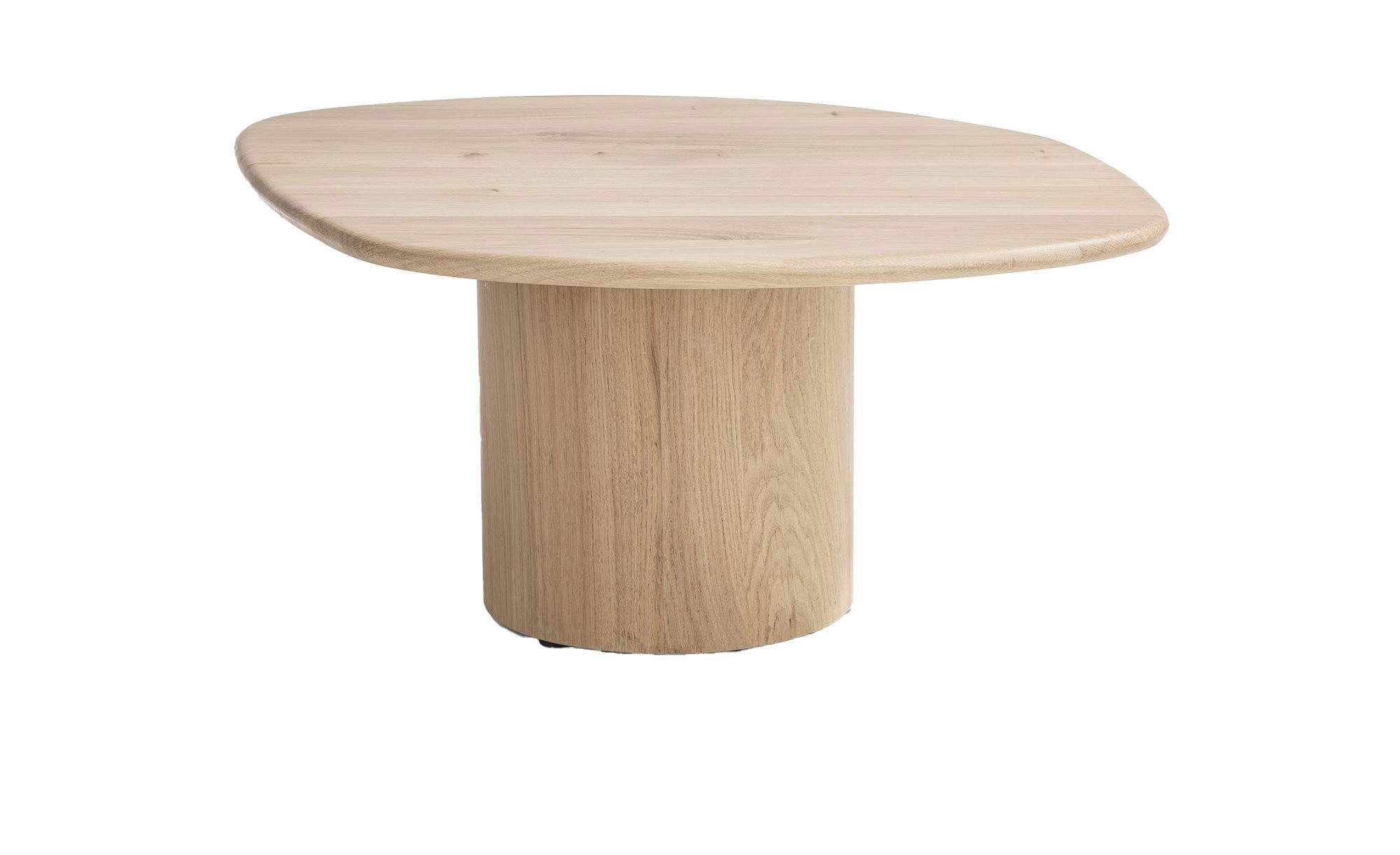 Ein Gestell mit hochwertigem Eichenfurnier trägt die Platte aus massivem Eichenholz mit lackierter Oberfläche. Ihre unebene Form trägt zusätzlich zum rauen, ursprünglichen Erscheinungsbild bei.