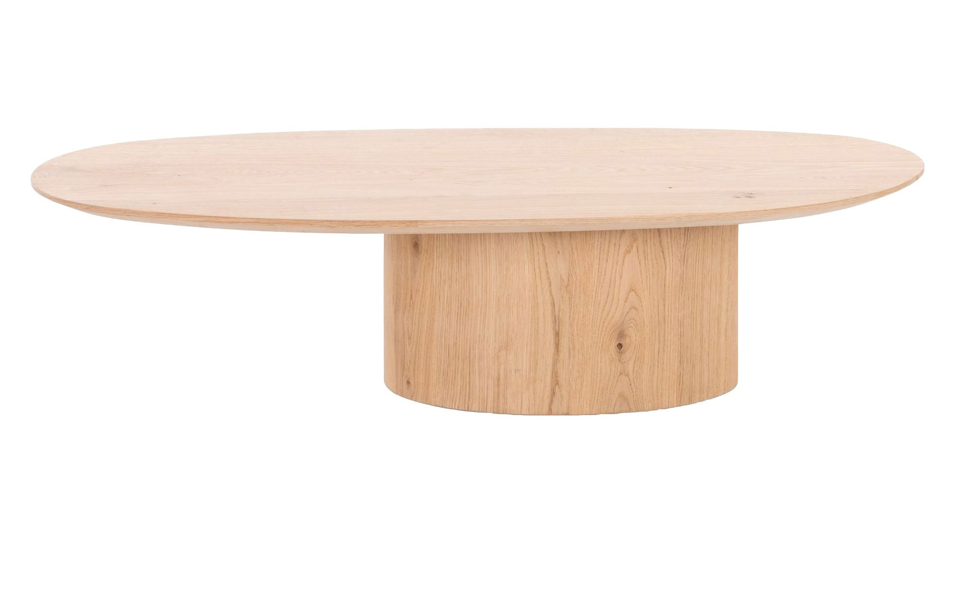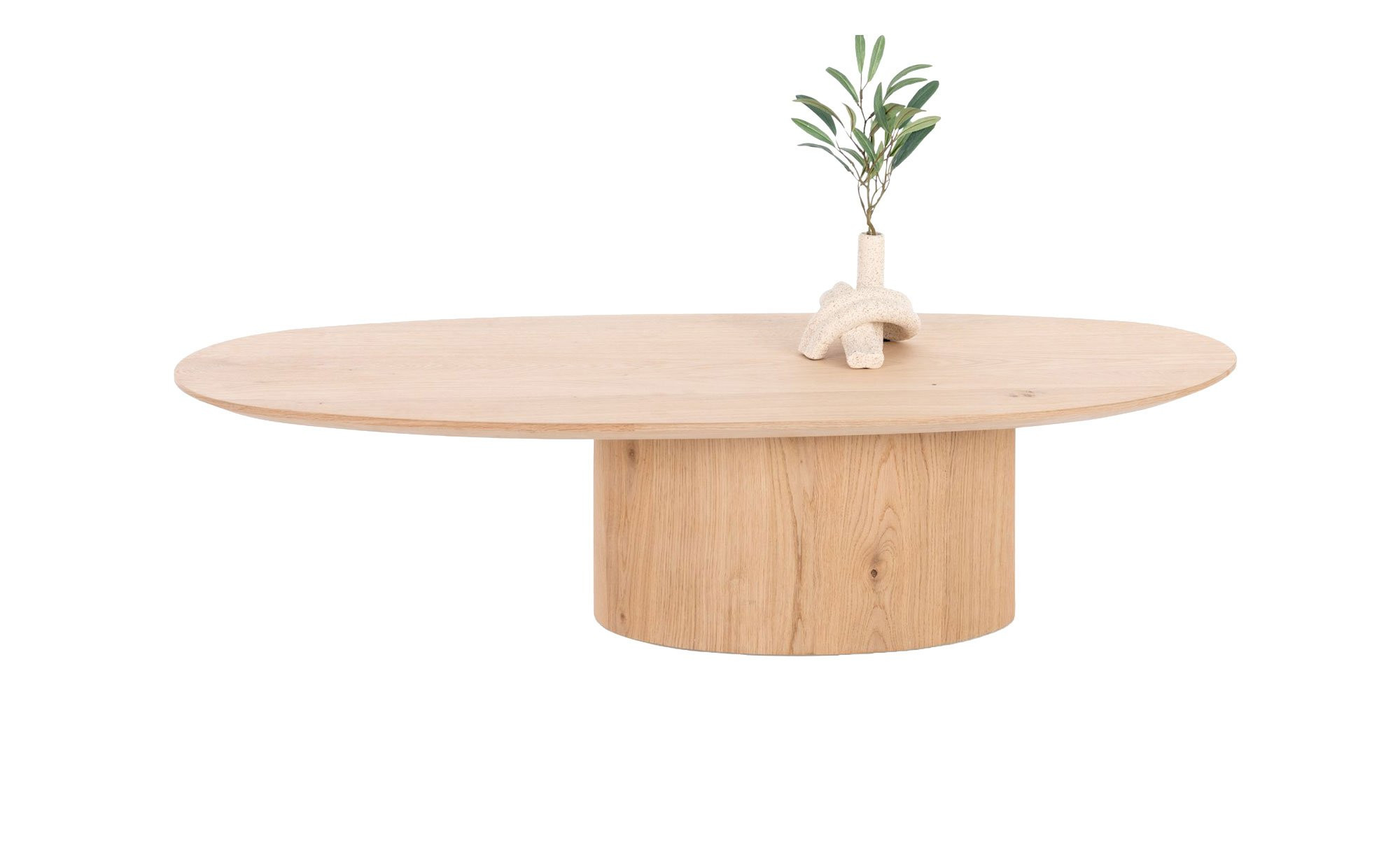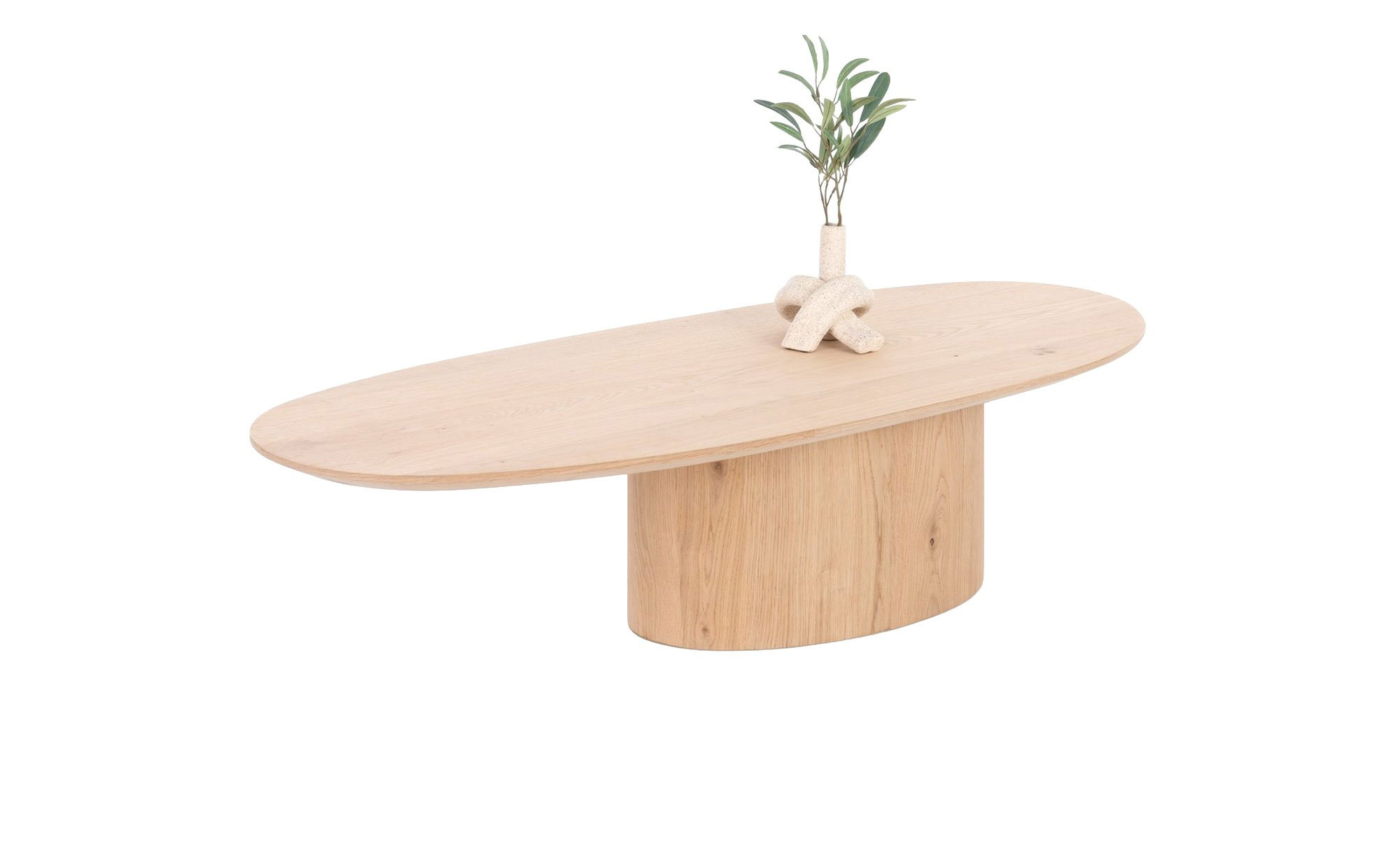 Sowohl die ovale Platte als auch das Säulengestell des Möbelstücks sind mit einem natürlichen Eichenfurnier versehen. Für die perfekte Balance ist der Fuß auf der Innenseite beschwert. So wird die maximale Stabilität des ca. 50 x 30 x 120 cm Tischs gewährleistet.