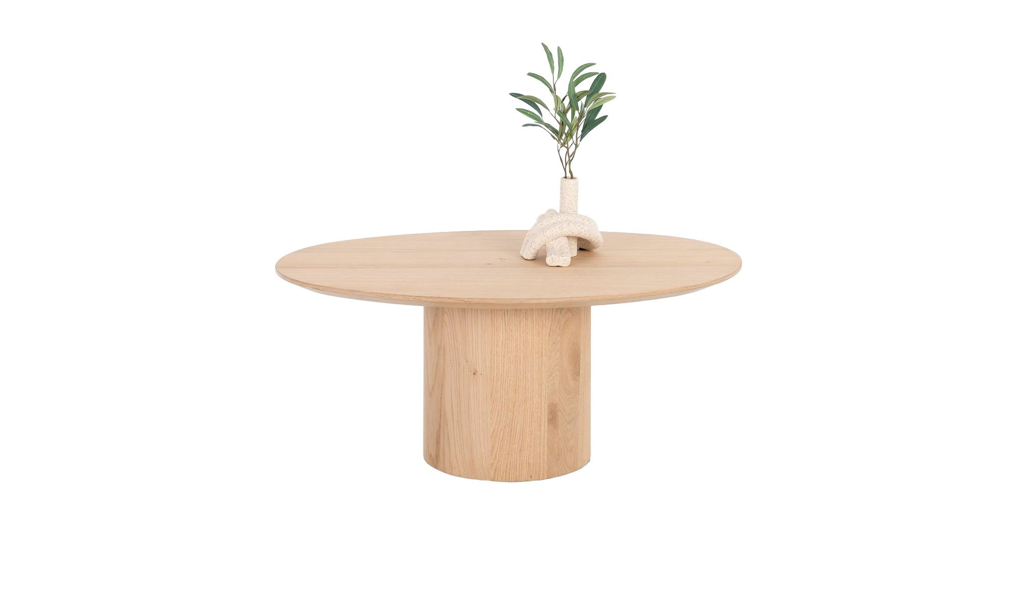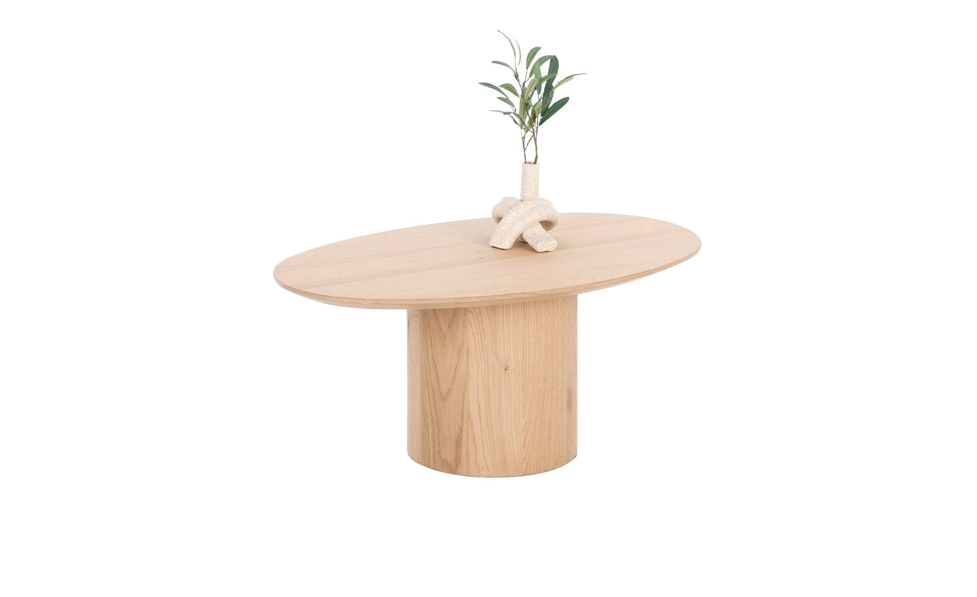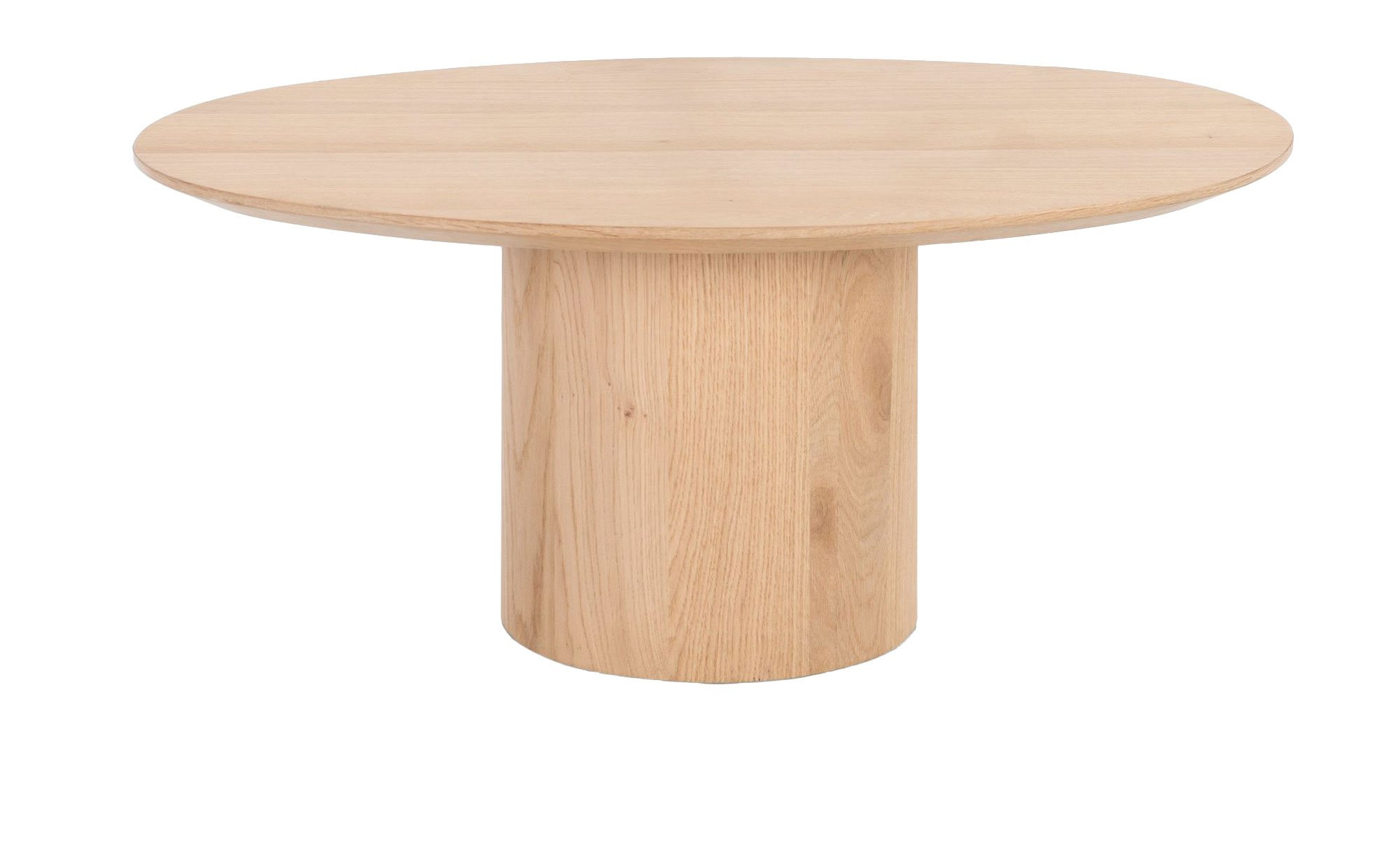 Sowohl die ovale Tischplatte als auch das Säulengestell sind mit einem natürlichen Eichenfurnier versehen und verleihen dem Möbelstück damit eine warme Ausstrahlung. Für eine optimale Standfestigkeit ist der Fuß auf der Innenseite beschwert, wodurch die Stabilität des ca. 51 x 35 x 80 cm großen Tisches gewährleistet wird.