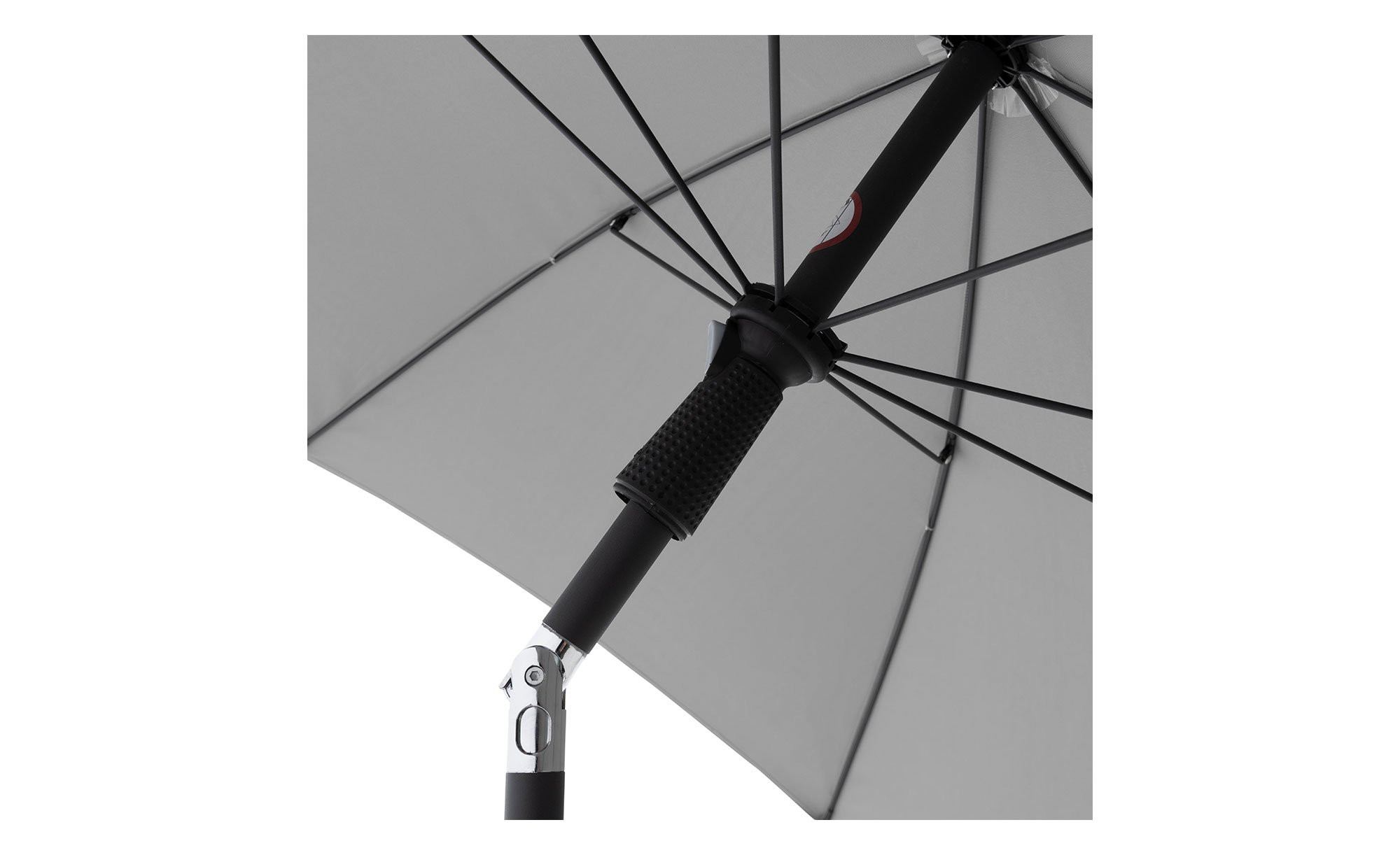 Der hellgraue Schirmstoff besteht zu 100 % aus Polyester. Er ist wasserabweisend und bietet mit LSF 50+ einen effektiven Schutz vor Sonnenstrahlen. Zudem zeichnet sich der Stoff durch eine Lichtechtheit von 5+ aus und kann problemlos per Handwäsche gereinigt werden.
