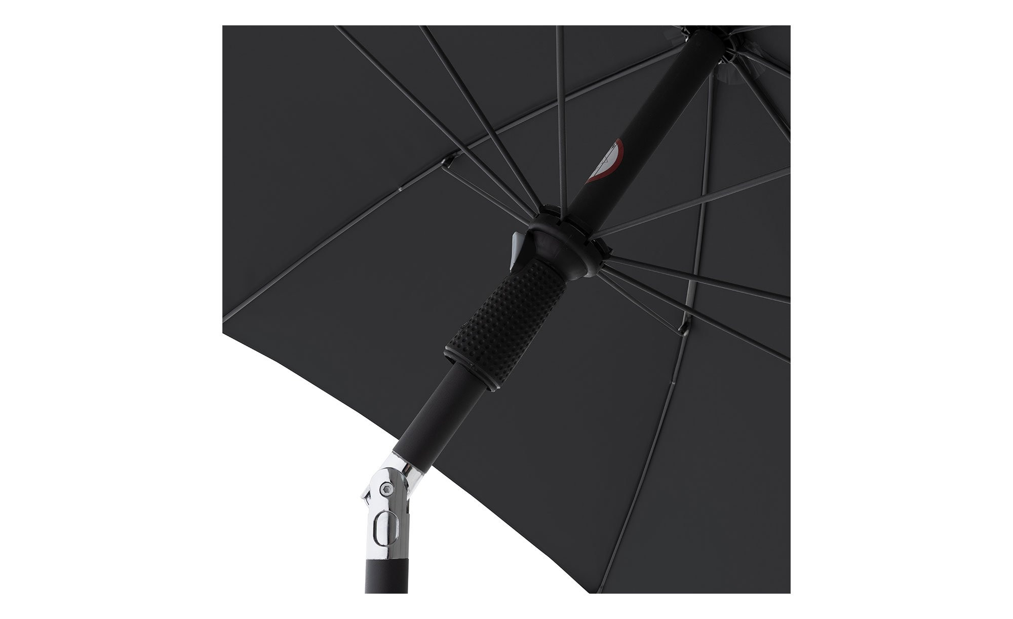 Der aus 100 % Polyester bestehende Schirmstoff trägt ebenfalls die Farbe Anthrazit. Er ist wasserabweisend und schützt mit seinem Lichtschutzfaktor 50+ effektiv vor schädlicher UV-Strahlung. Zusätzlich weist der Stoff eine Lichtechtheit von 5+ auf und lässt sich leicht per Handwäsche reinigen.