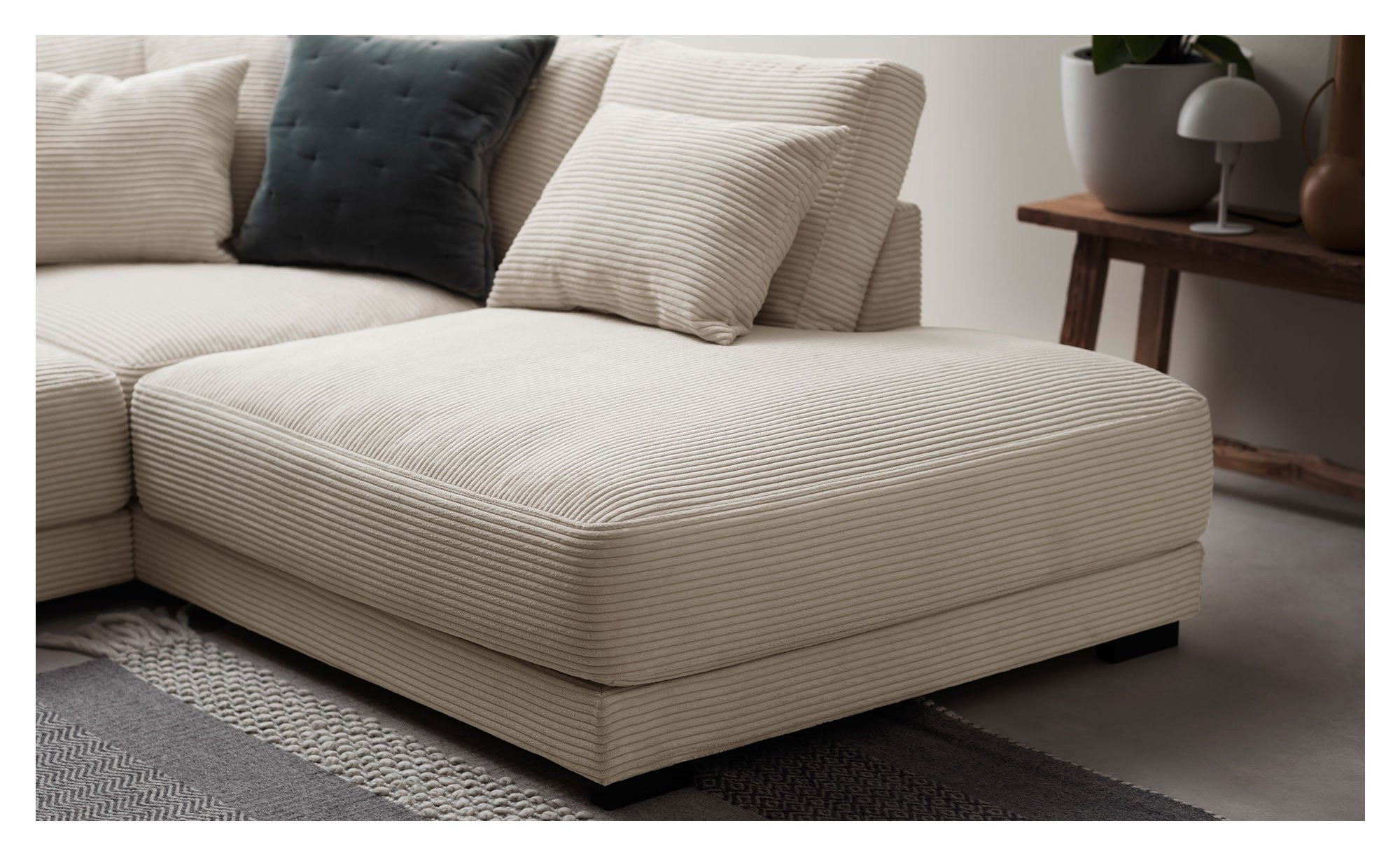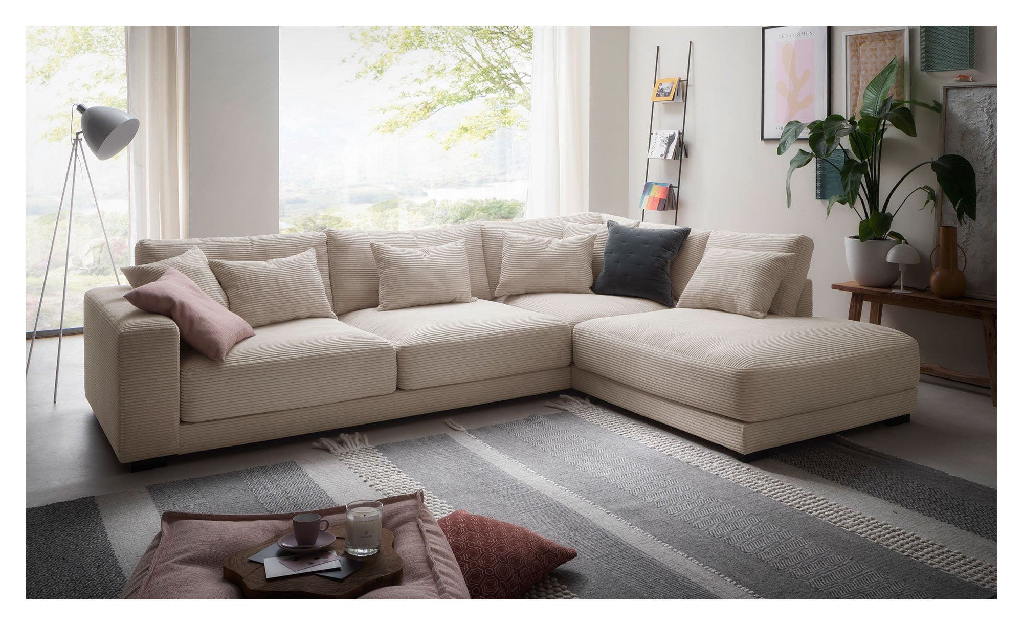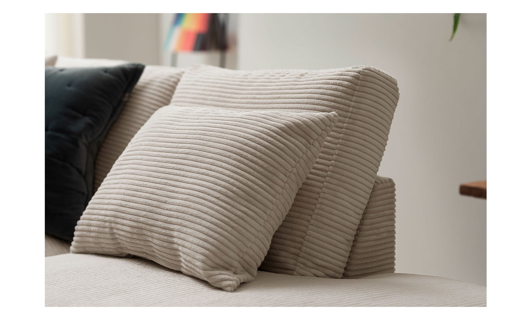 Freuen Sie sich auf einen weichen Cordstoff in Beige, der das ca. 310 x 85 x 220 cm große Sofa inklusive des Rückens umspannt! Im Angebot enthalten sind zudem fünf große Rücken- sowie vier Zierkissen im selben Bezugsstoff. Zusätzlich erwarten Sie zwei Zierkissen in Rosa und Türkisblau, die für einen gelungenen Kontrast sorgen. Holzfüße in der Farbe Wenge runden das Bild ab.