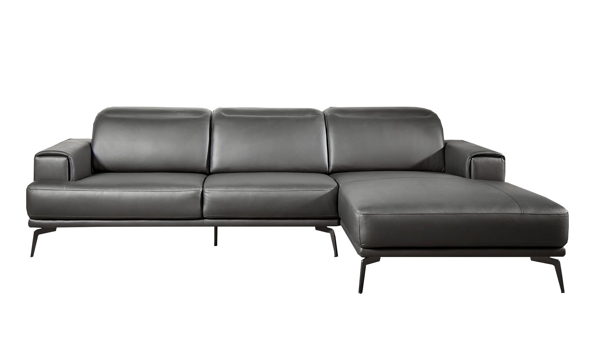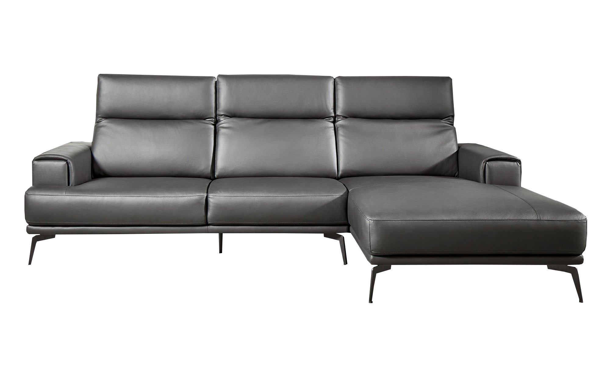 Ein Bezug aus echtem Leder in Schwarz schmiegt sich um das ca. 269 cm breite und ca. 97 cm hohe Möbelstück. Seine Tiefe beträgt ca. 103 cm, zudem gibt es eine ca. 168 cm tiefe Chaiselongue auf der rechten Seite.