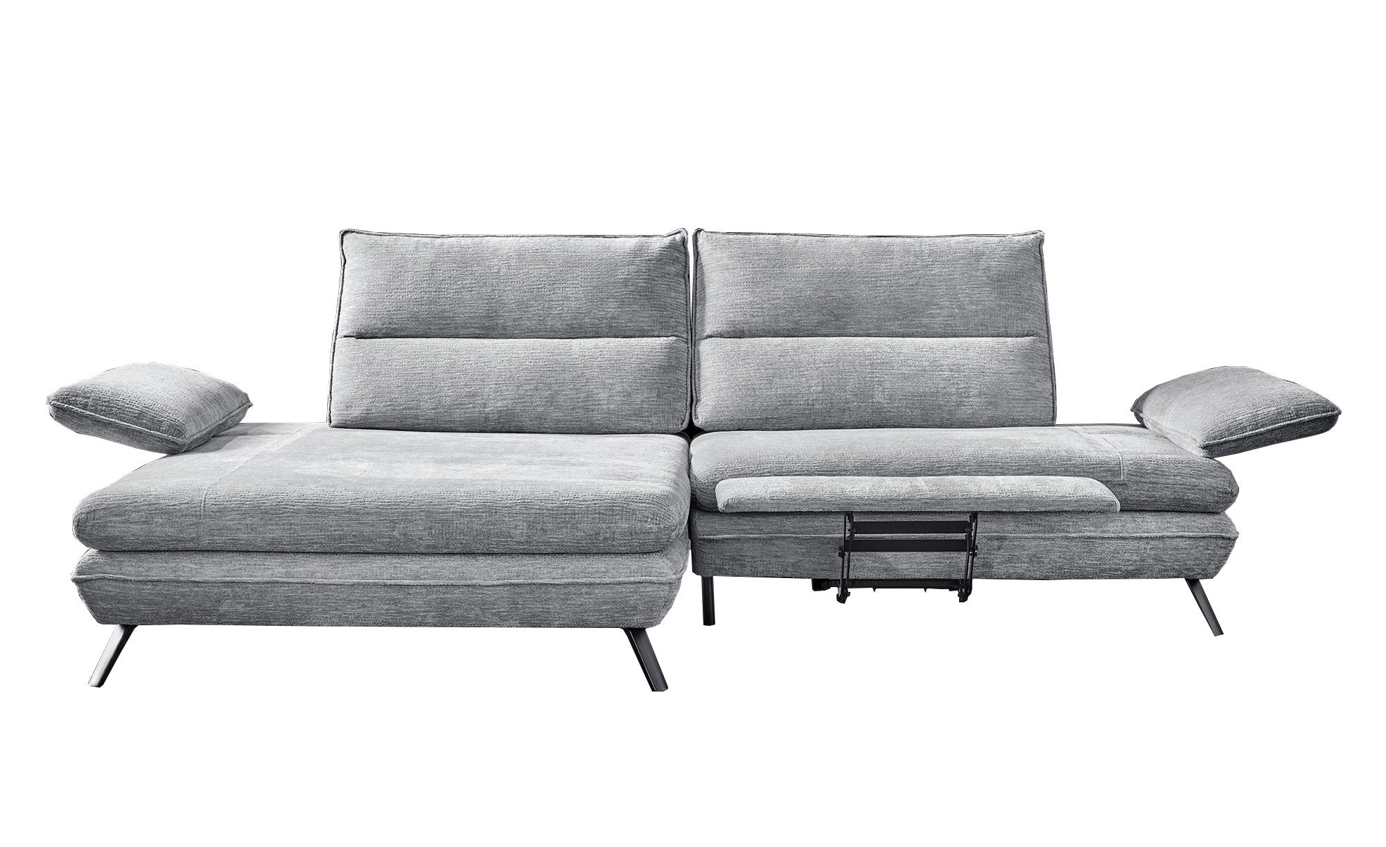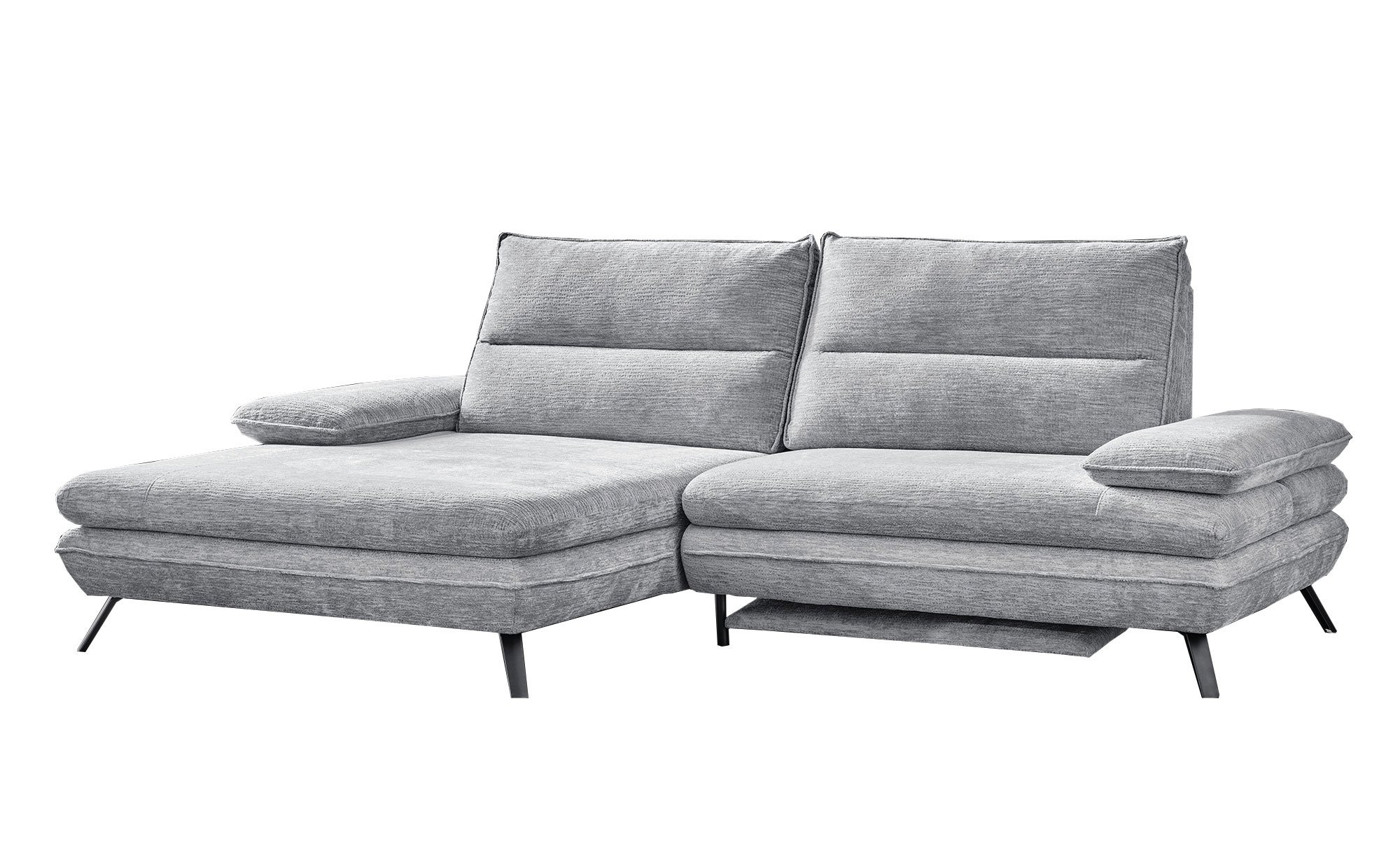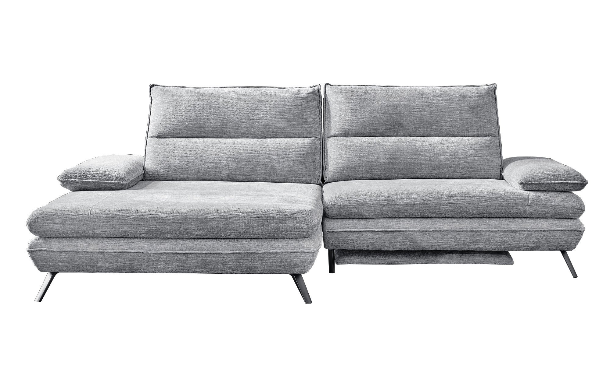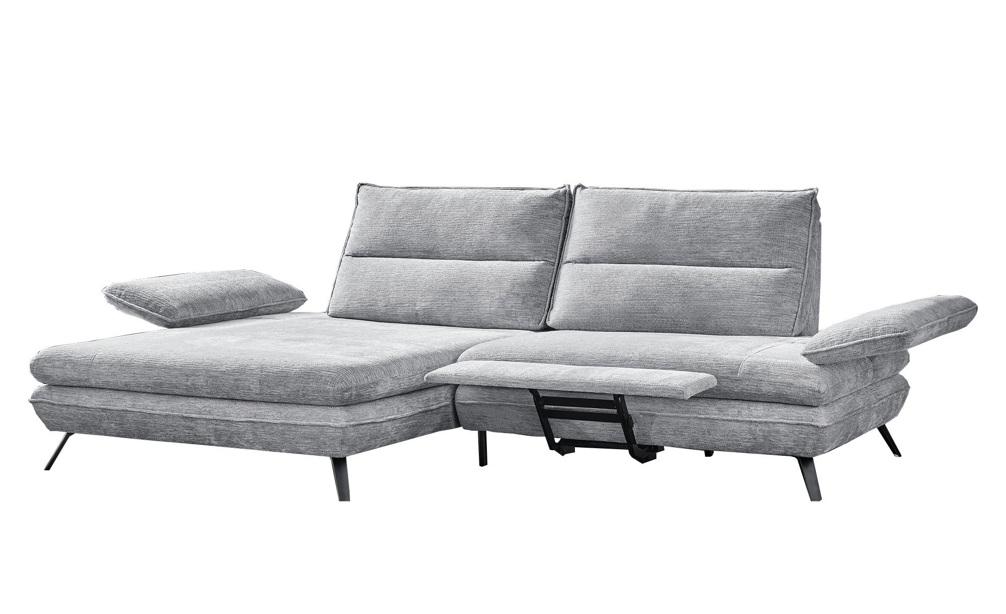 Am ca. 276 x 97 großen Artikel mit linksseitiger Ausrichtung und einer Tiefe von ca. 104 cm bzw. 168 cm am Longchair findet sich ein hellgrauer Stoffbezug. Für besonderen Komfort sorgen eine integrierte elektrische Fußstütze sowie zwei Armlehnen mit praktischer Funktionsverstellung. Außerdem dürfen Sie sich auf eine manuelle Push-Back-Funktion der beiden Relax-Rückenlehnen freuen.