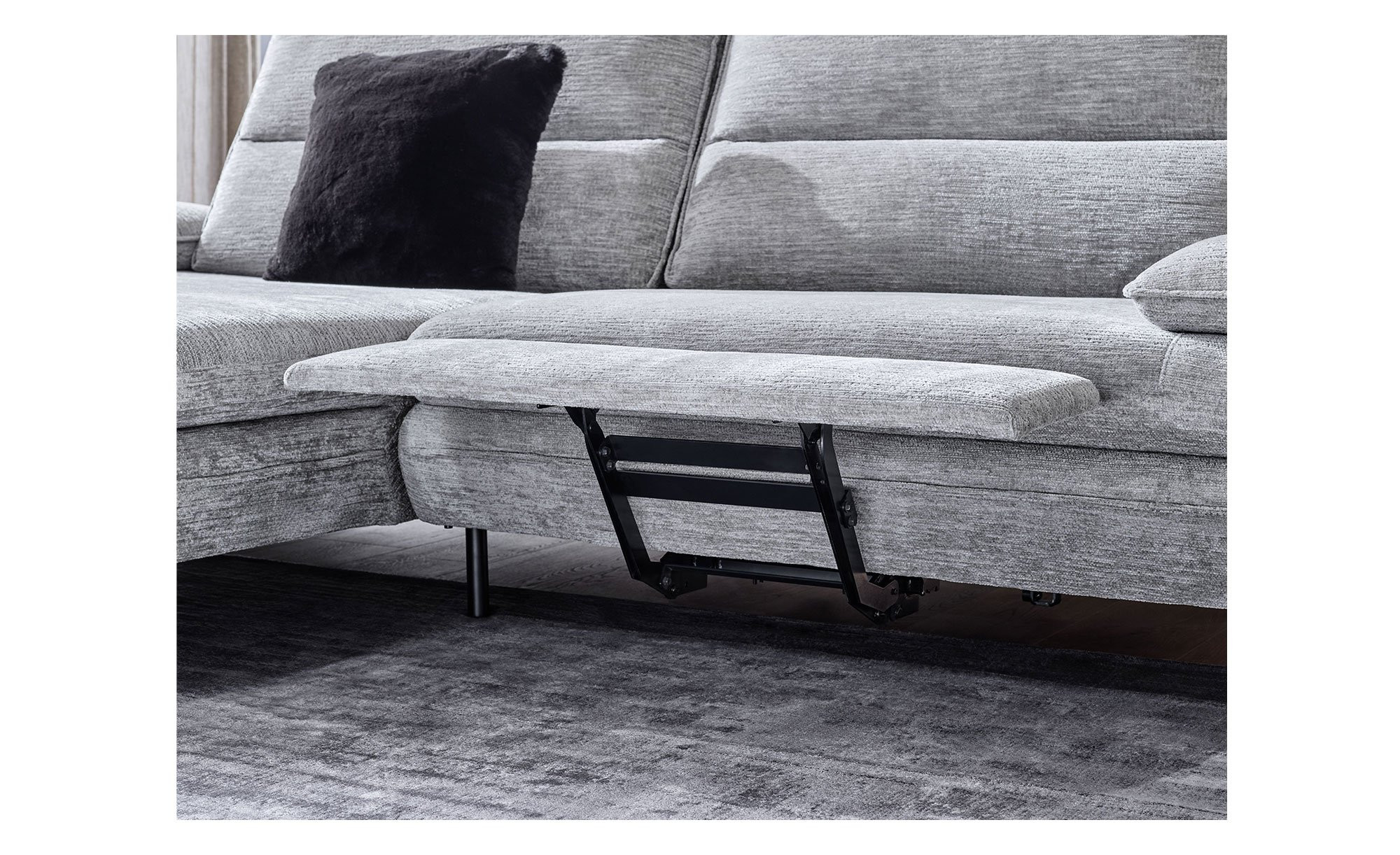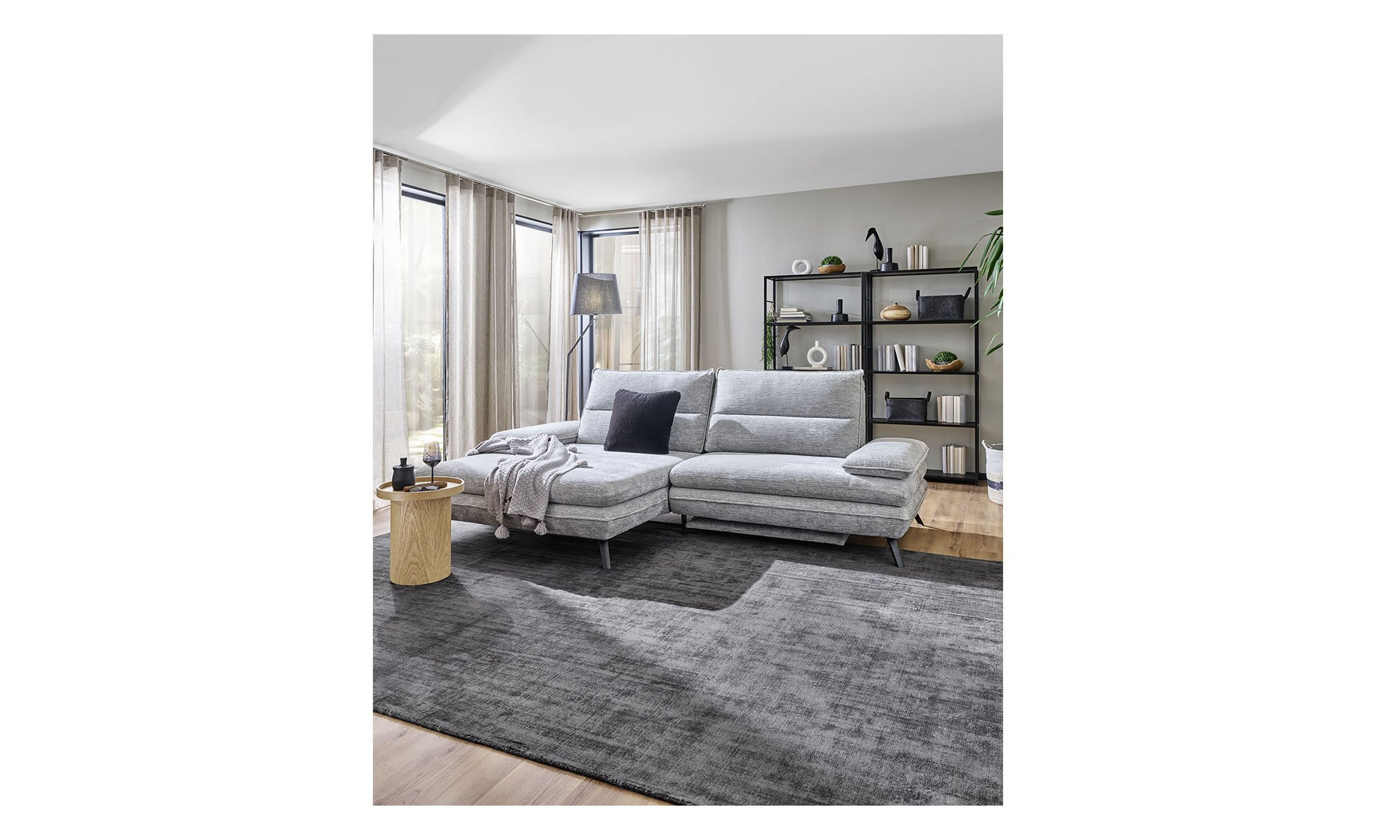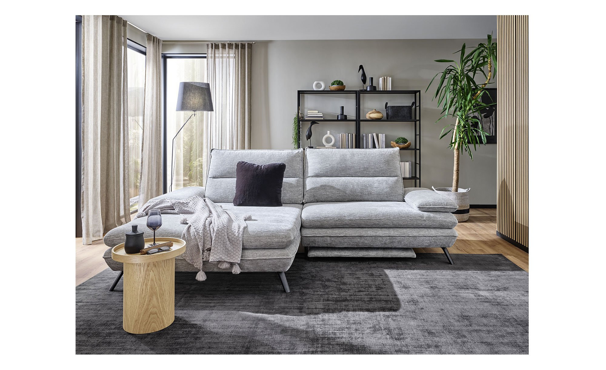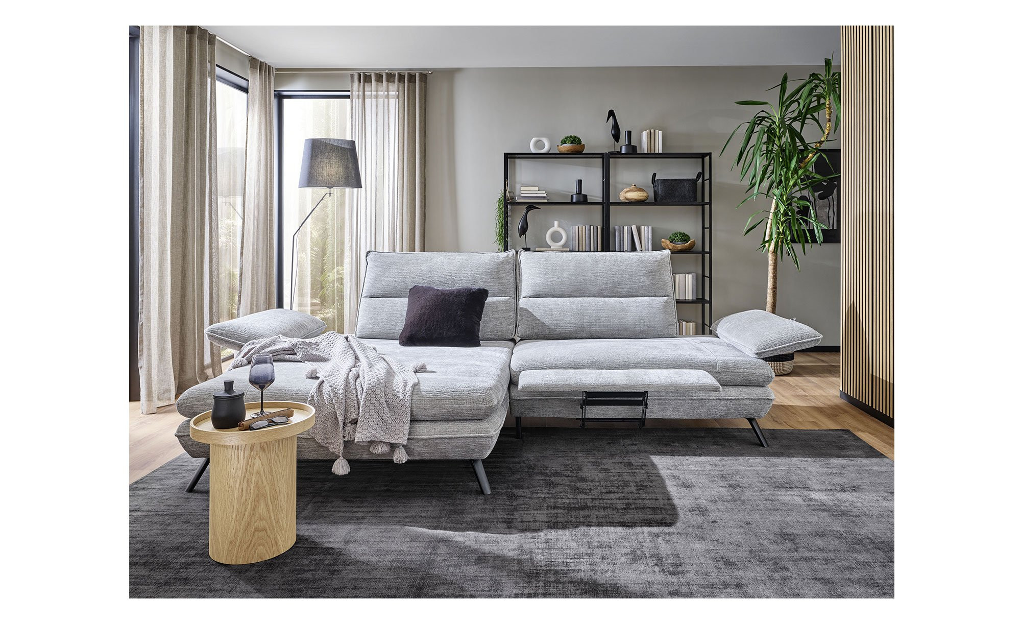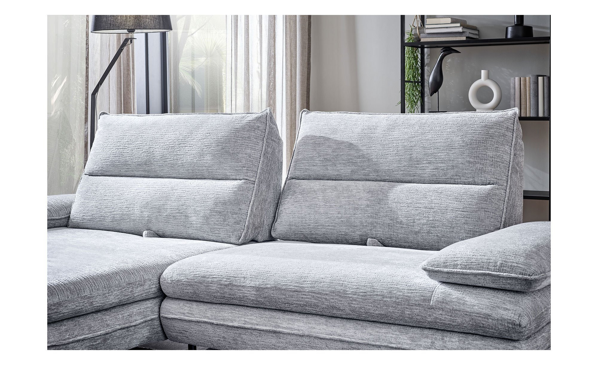 Am ca. 276 x 97 großen Artikel mit linksseitiger Ausrichtung und einer Tiefe von ca. 104 cm bzw. 168 cm am Longchair findet sich ein hellgrauer Stoffbezug. Für besonderen Komfort sorgen eine integrierte elektrische Fußstütze sowie zwei Armlehnen mit praktischer Funktionsverstellung. Außerdem dürfen Sie sich auf eine manuelle Push-Back-Funktion der beiden Relax-Rückenlehnen freuen.