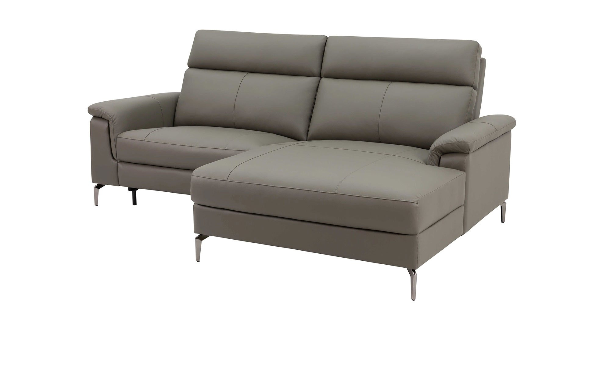 Ein Bezug mit einer Stoffzusammensetzung aus Leder und PVC in Braun schmiegt sich um das rechtsseitig ausgerichtete Möbelstück. Da auch der Rücken echt ist, bieten sich verschiedene Möglichkeiten für die Platzierung im Raum. Metallfüße verleihen dem Gesamtbild seinen letzten Schliff.