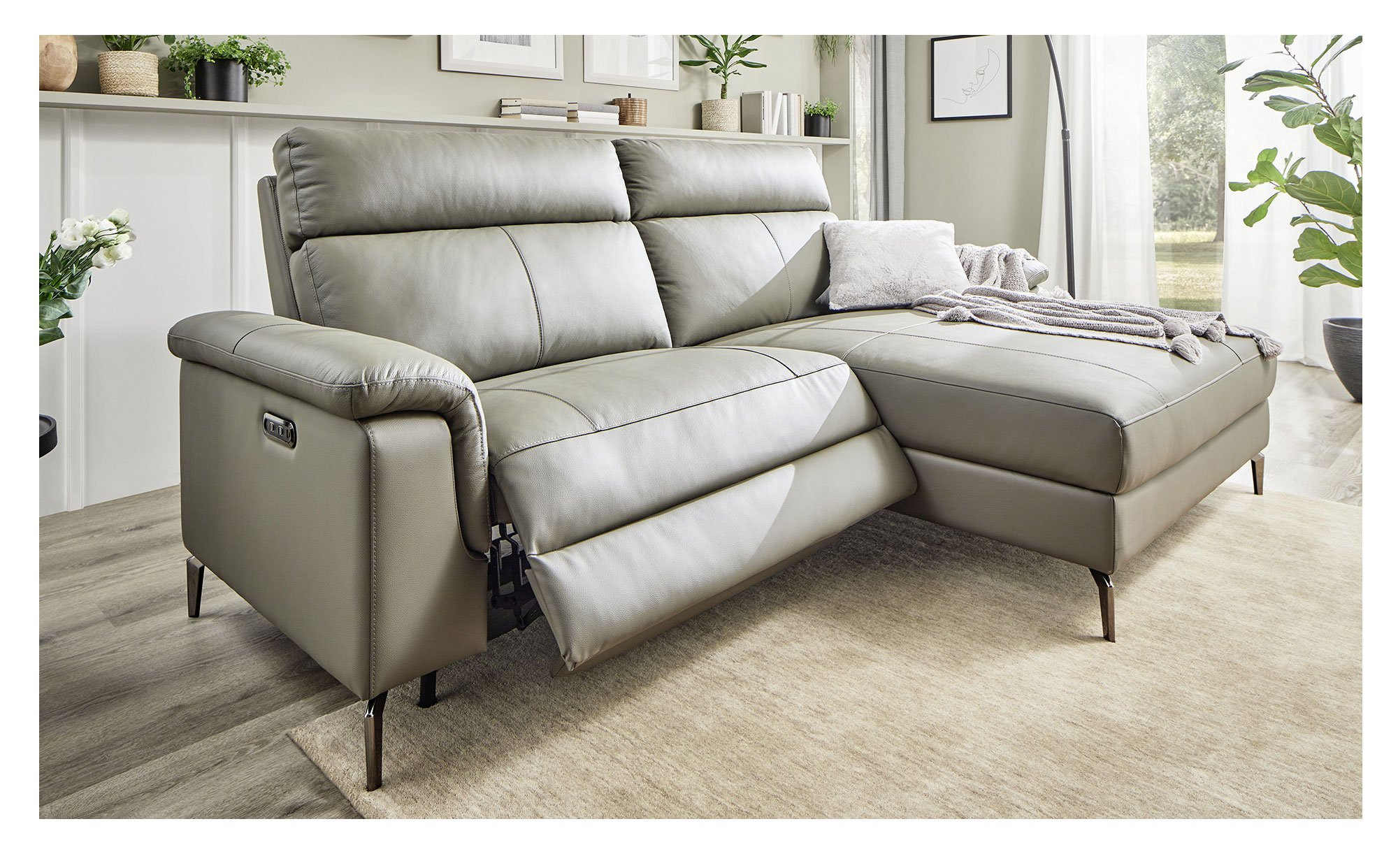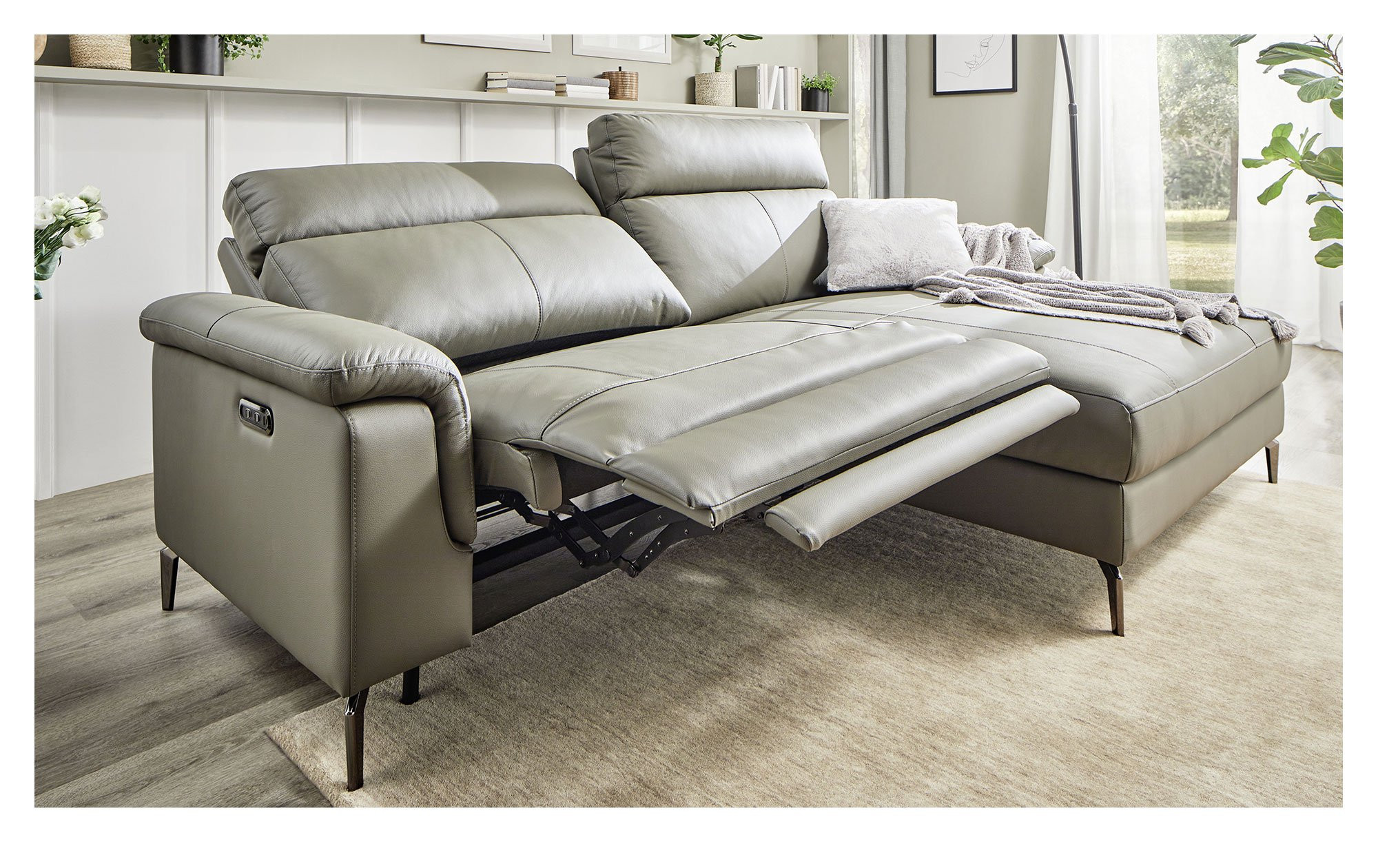 Im Bereich des Sessels mit fester Liege ist das Möbel elektrisch zwischen ca. 53-117 cm verstellbar. Besonders praktisch sind zudem die integrierten Lademöglichkeiten für USB/Typ C.