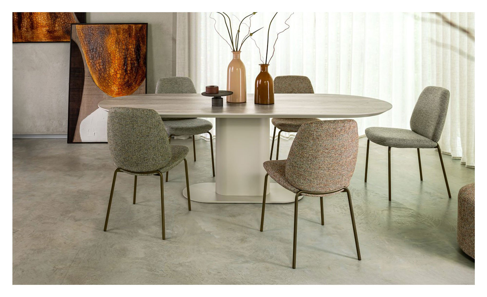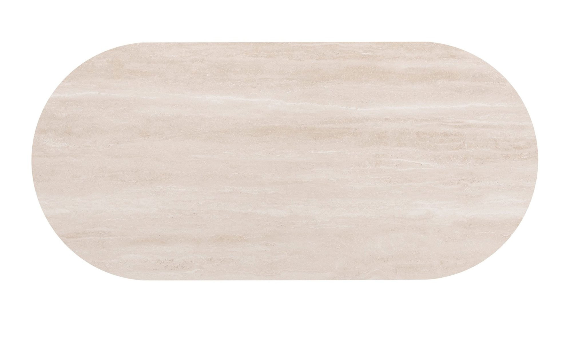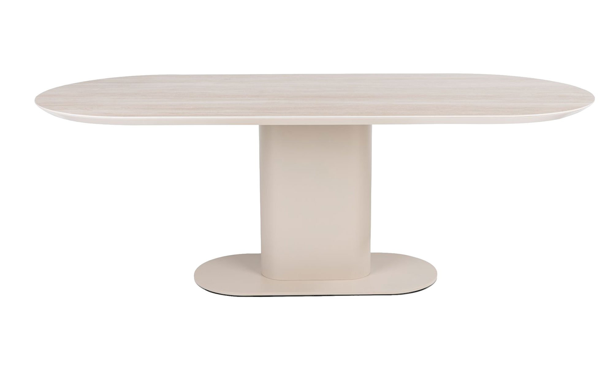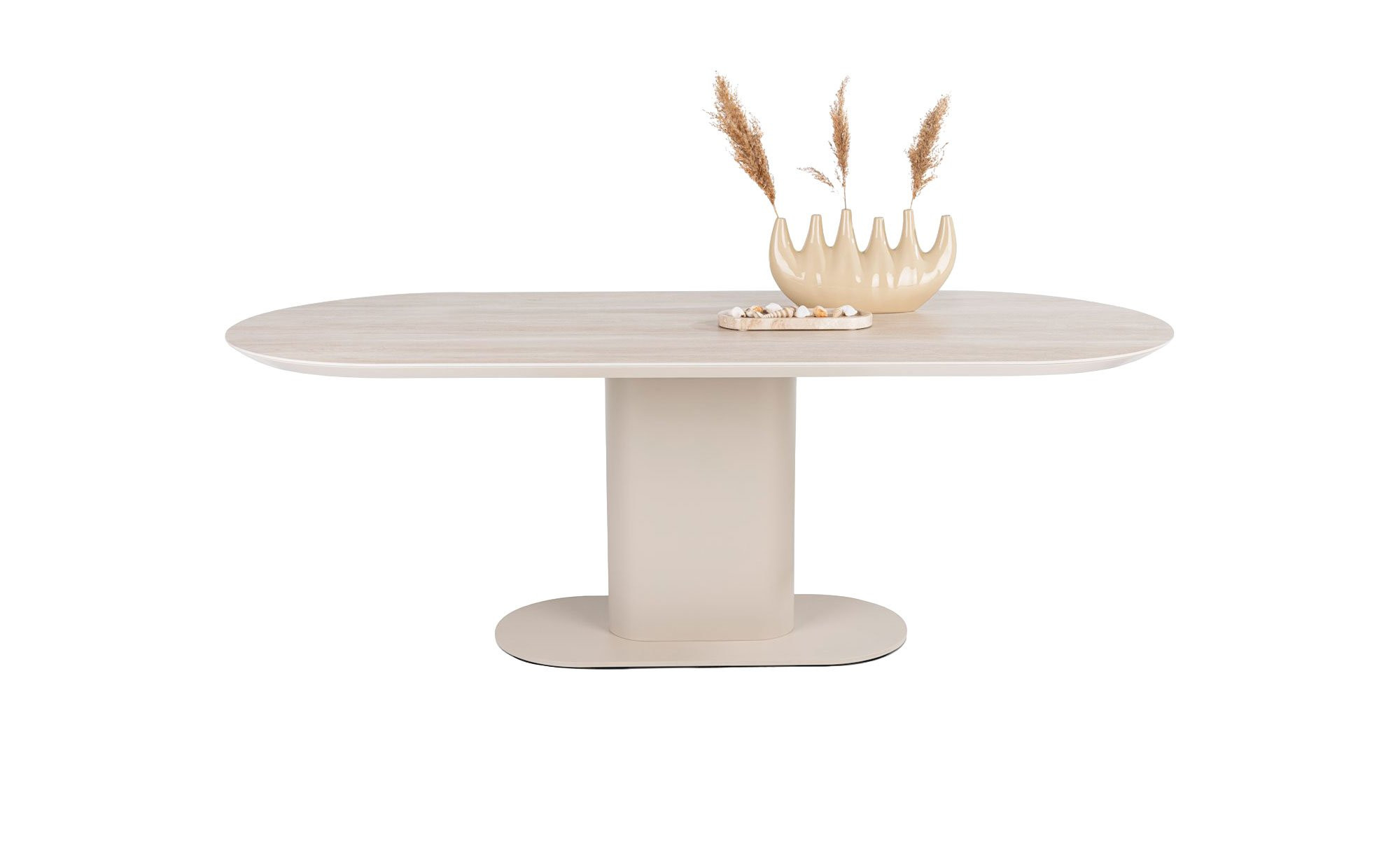 Ein cremefarbiges Metallgestell in Säulenform bildet die stabile Basis des ca. 100 x 77 x 210 cm großen Möbelstücks. Es trägt die ovale Platte, die aus Keramik auf MDF gefertigt wurde. Durch diesen besonderen Eyecatcher kreieren Sie definitiv eine einzigartige Atmosphäre im ganzen Raum!