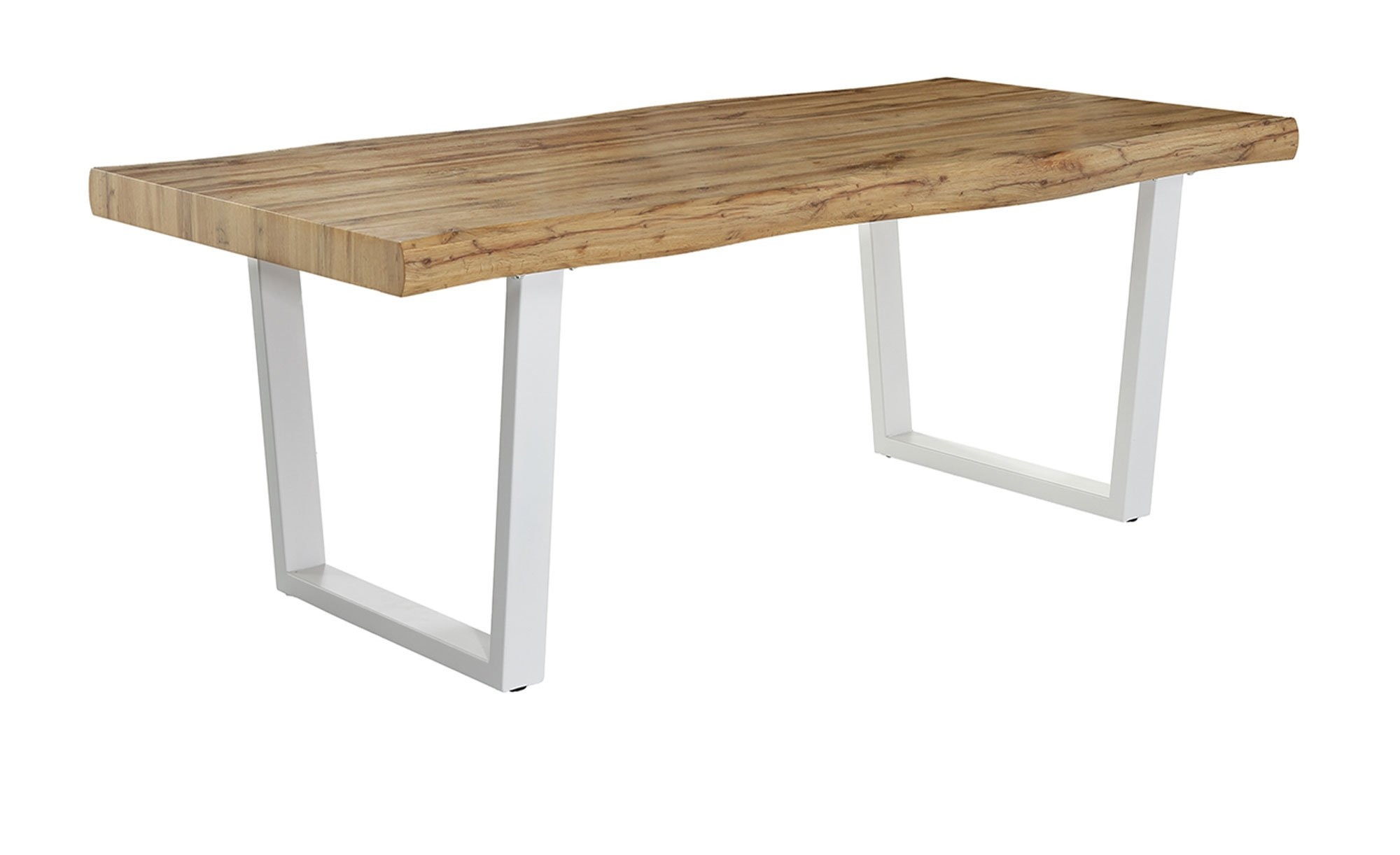 Die rechteckige Platte des ca. 200 x 76 x 100 cm großen Tischs besteht aus Holzwerkstoff im Dekor Wildeiche. Ihre Baumkanten-Optik verleiht ihr einen ursprünglichen Charme und auch die Stärke von ca. 8 cm trägt zum robusten Eindruck bei.