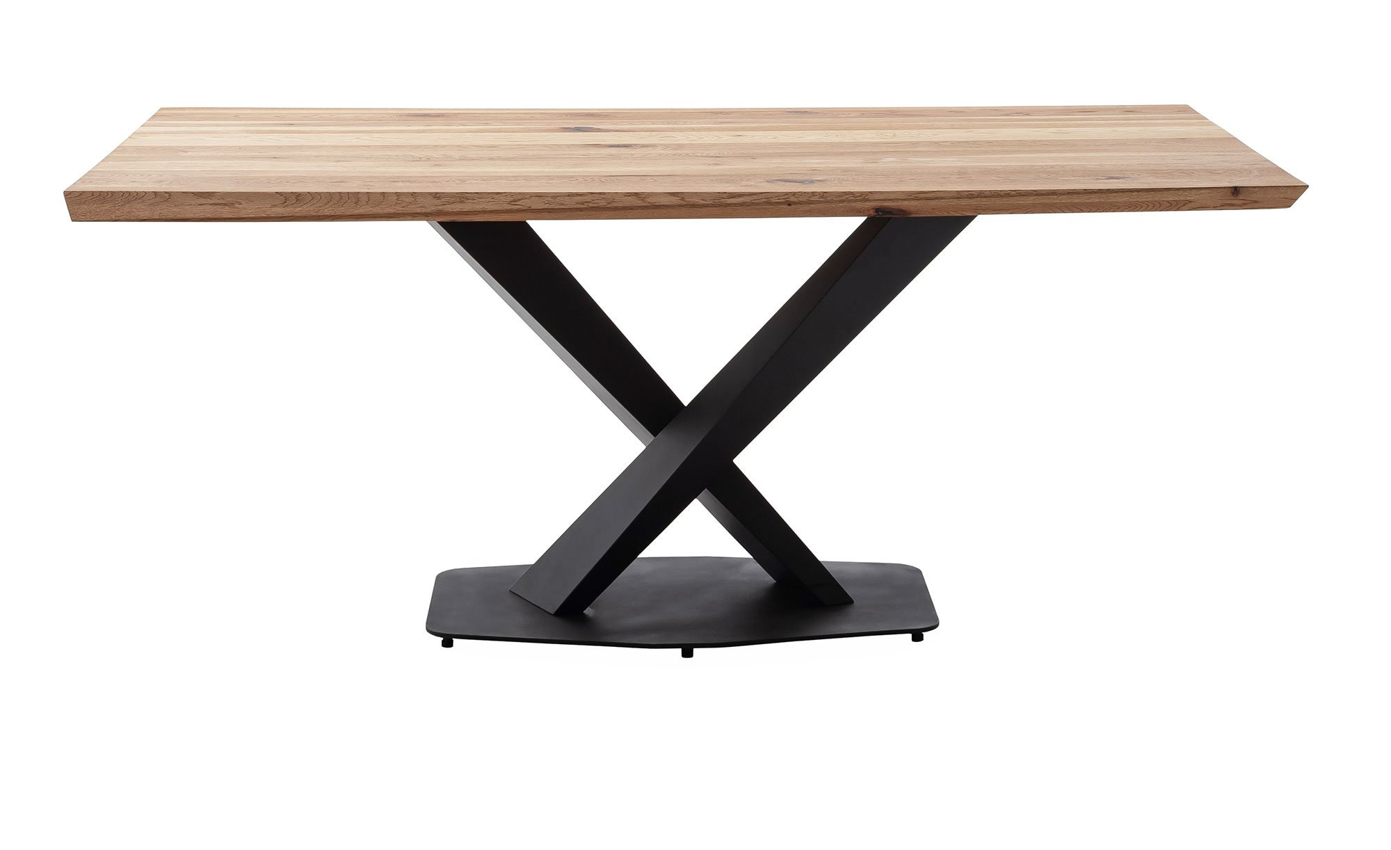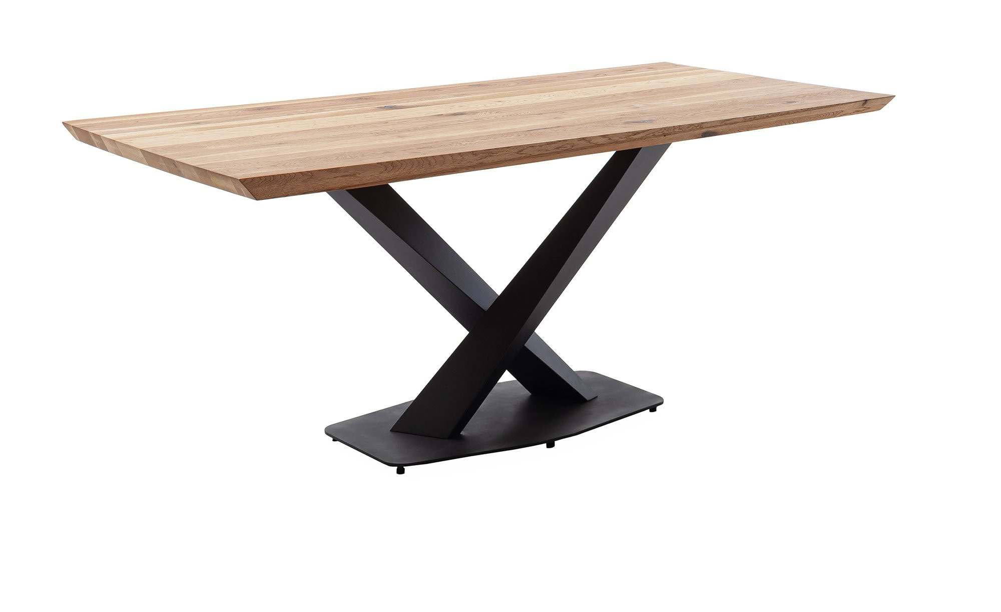 Der rechteckige Artikel verfügt über ein modernes Säulengestell aus pulverbeschichtetem Metall in Schwarz. Dieses trägt zuverlässig die Platte aus massiver Zerreiche. Ihre Oberfläche wurde geölt, zudem dürfen Sie sich auf eine reverse/gedrehte Baumkante mit einer aufgedoppelten Stärke von ca. 40 mm freuen.