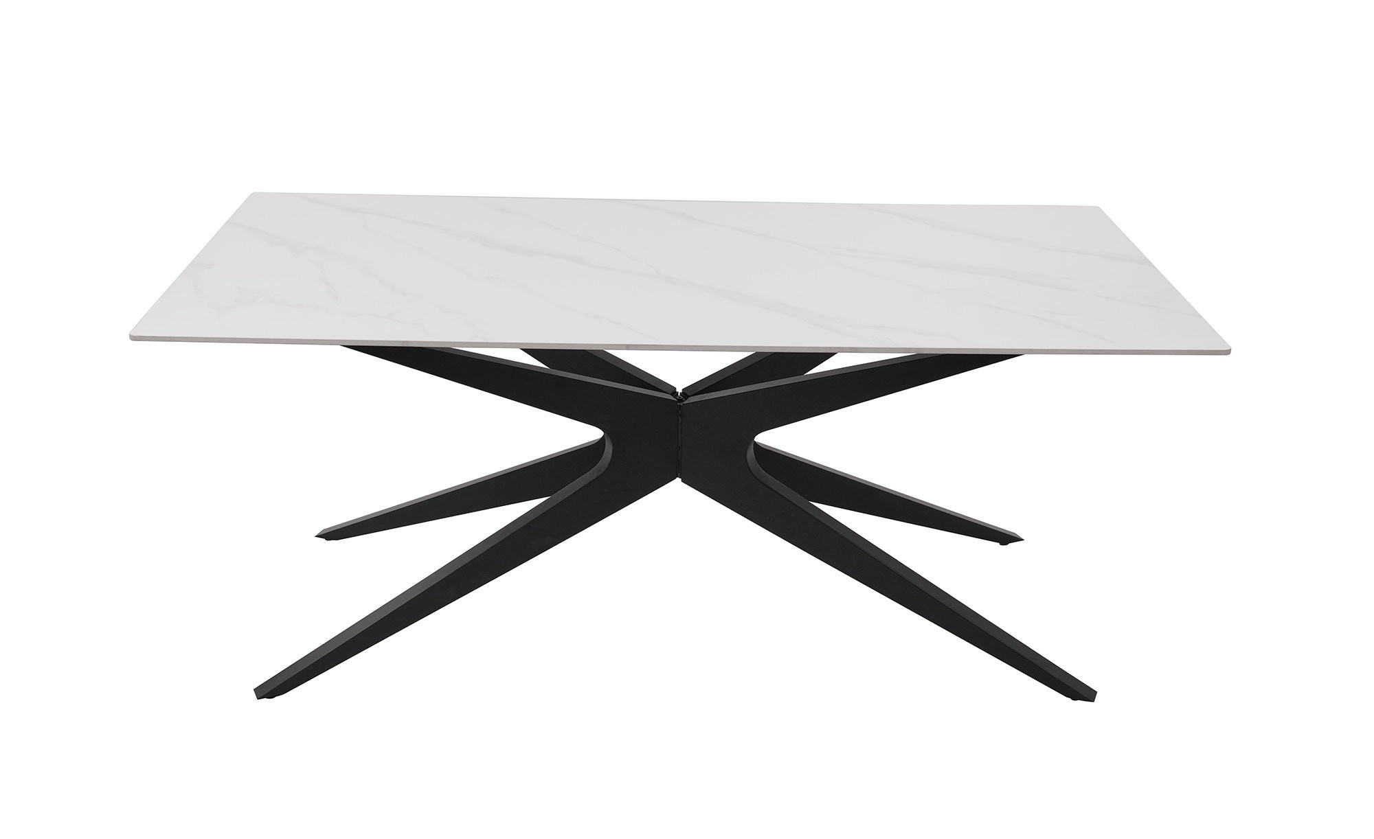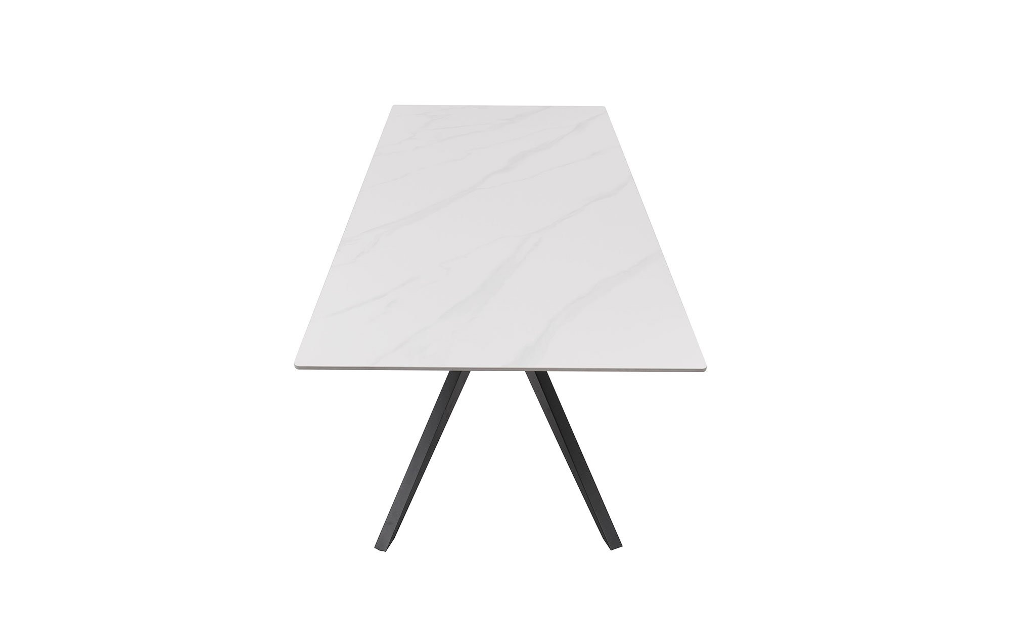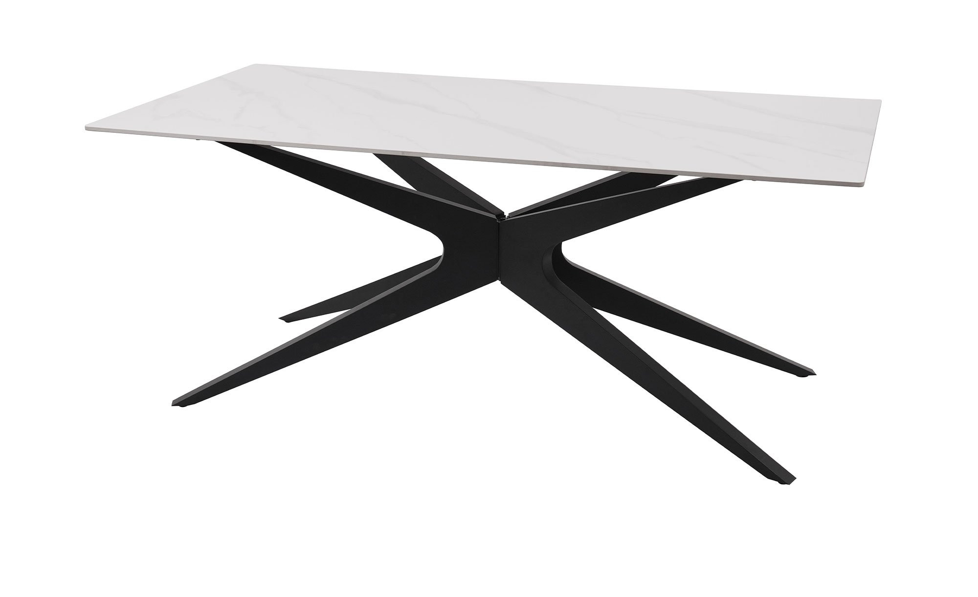 Das ca. 180 x 75 x 90 cm große Möbelstück zieht durch sein Metallgestell im Farbton Schwarz-Sand unmittelbar die Blicke auf sich. In einer ansprechenden Form gestaltet, ist es aber nicht nur ein Hingucker, sondern garantiert auch den stabilen Halt der Tischplatte aus Keramik in weißer Marmor-Optik.