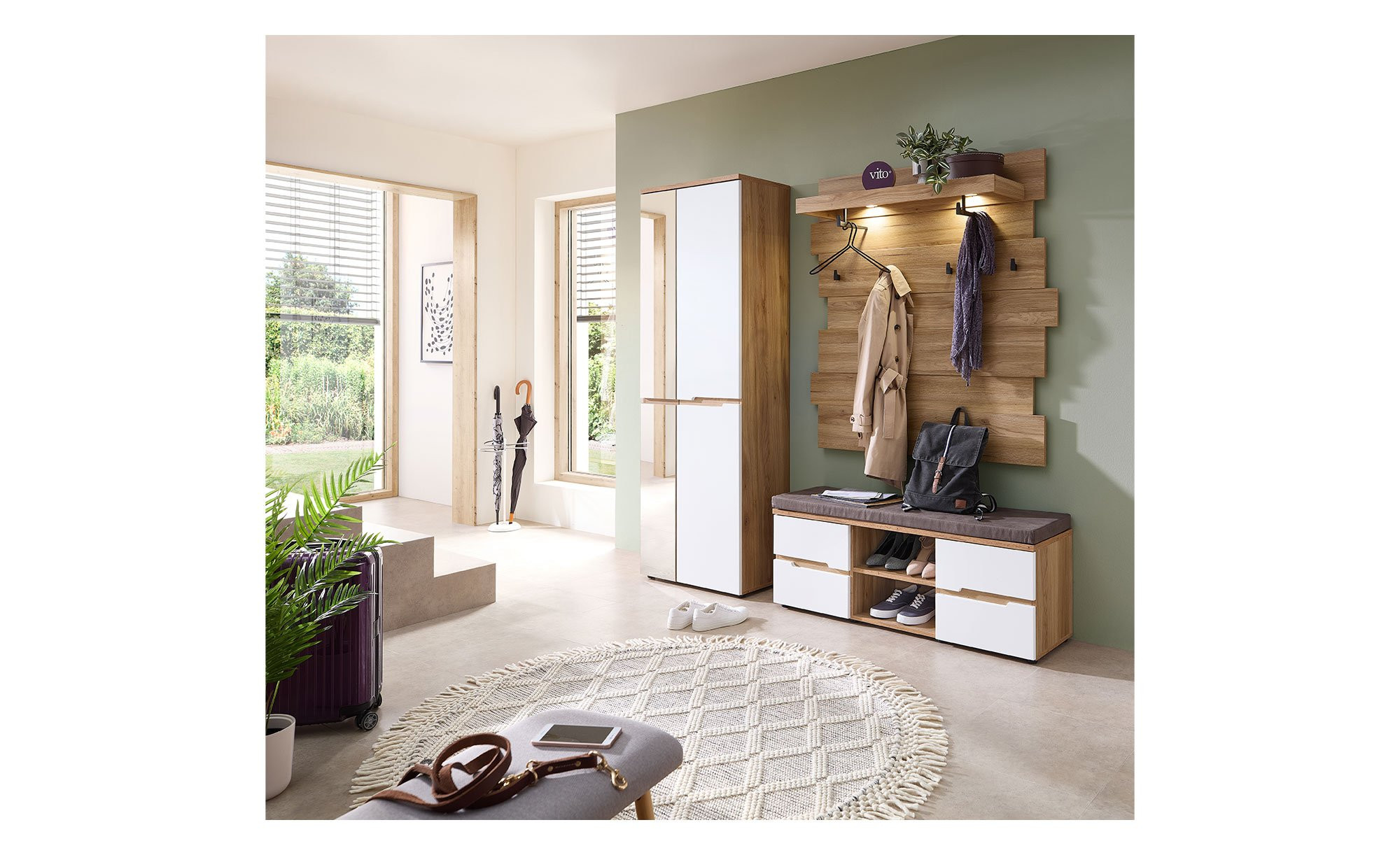 Unsere moderne Garderobenbank vito Clyde bietet praktischen Stauraum, eine Sitzgelegenheit – und macht dabei auch optisch eine hervorragende Figur!