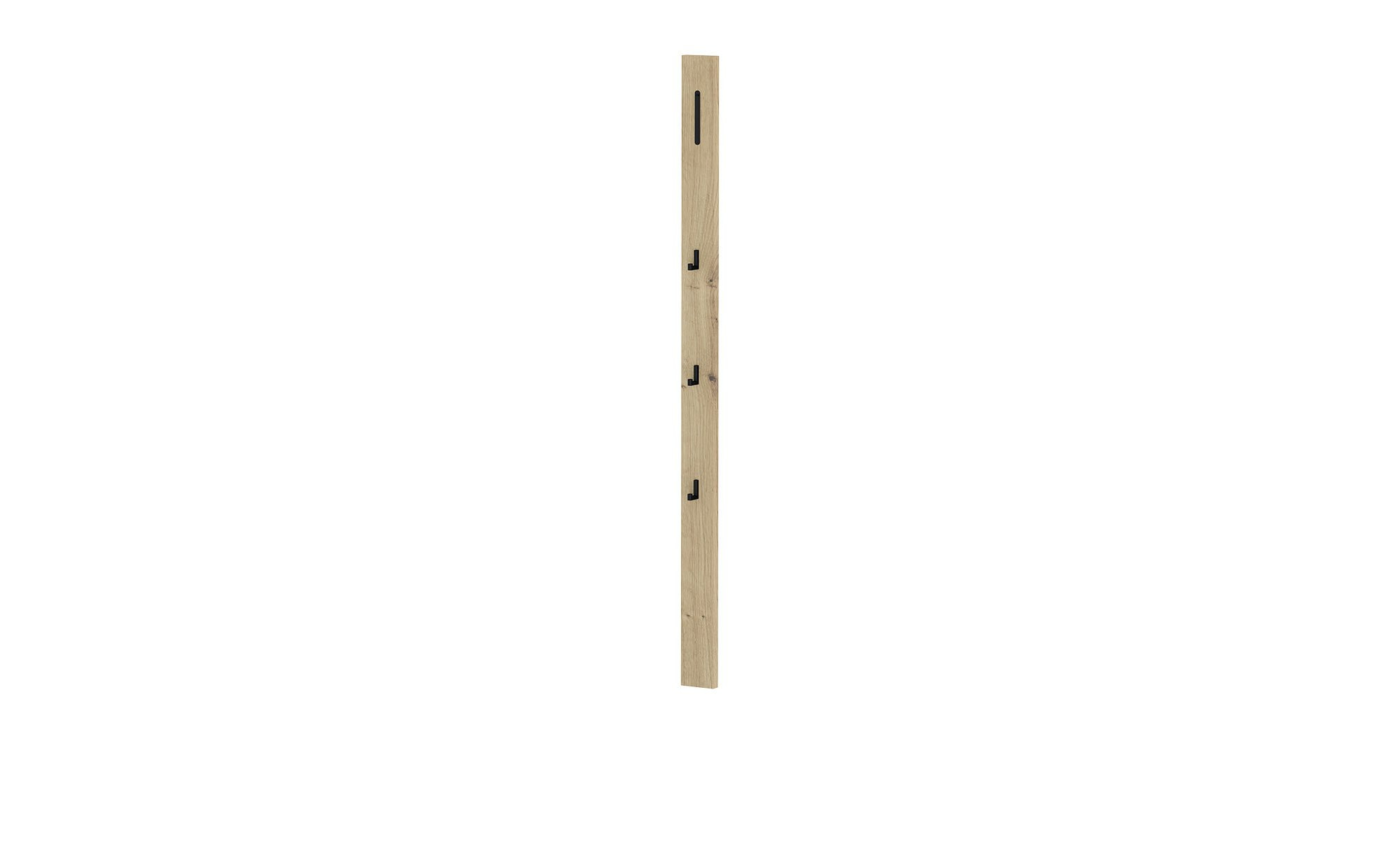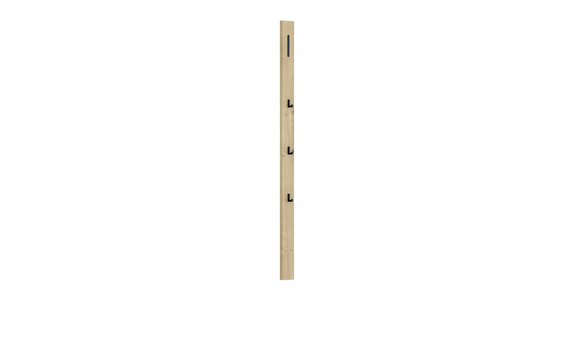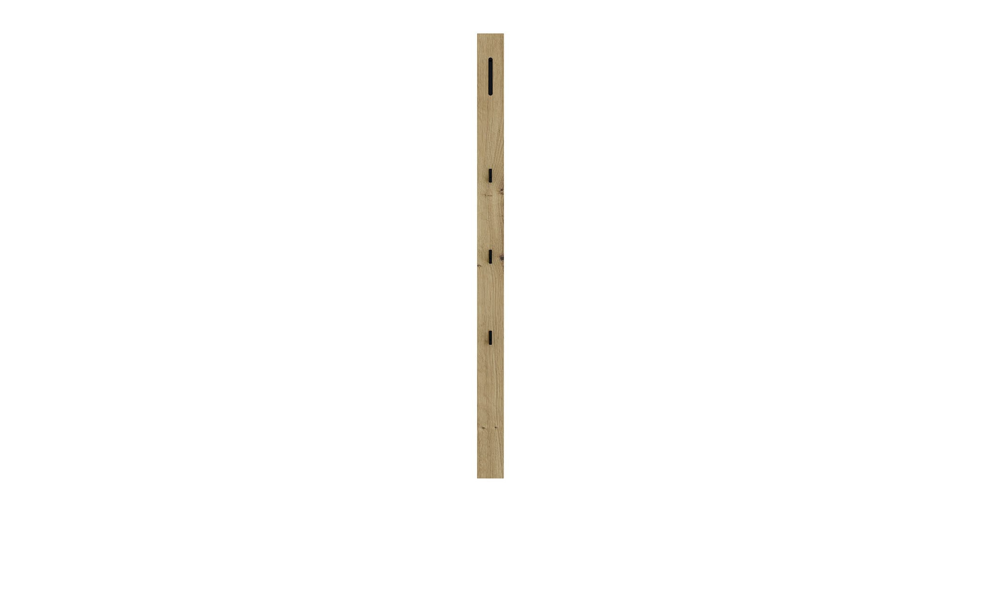 Das schlanke MDF-Paneel misst ca. 10 x 165 x 5 cm und präsentiert sich mit einer natürlichen Eiche-Nachbildung. Vier Haken aus schwarzem Aluminium stehen für Ihre Kleidung bereit – einer davon ist bei Bedarf klappbar und bietet somit noch mehr Flexibilität.