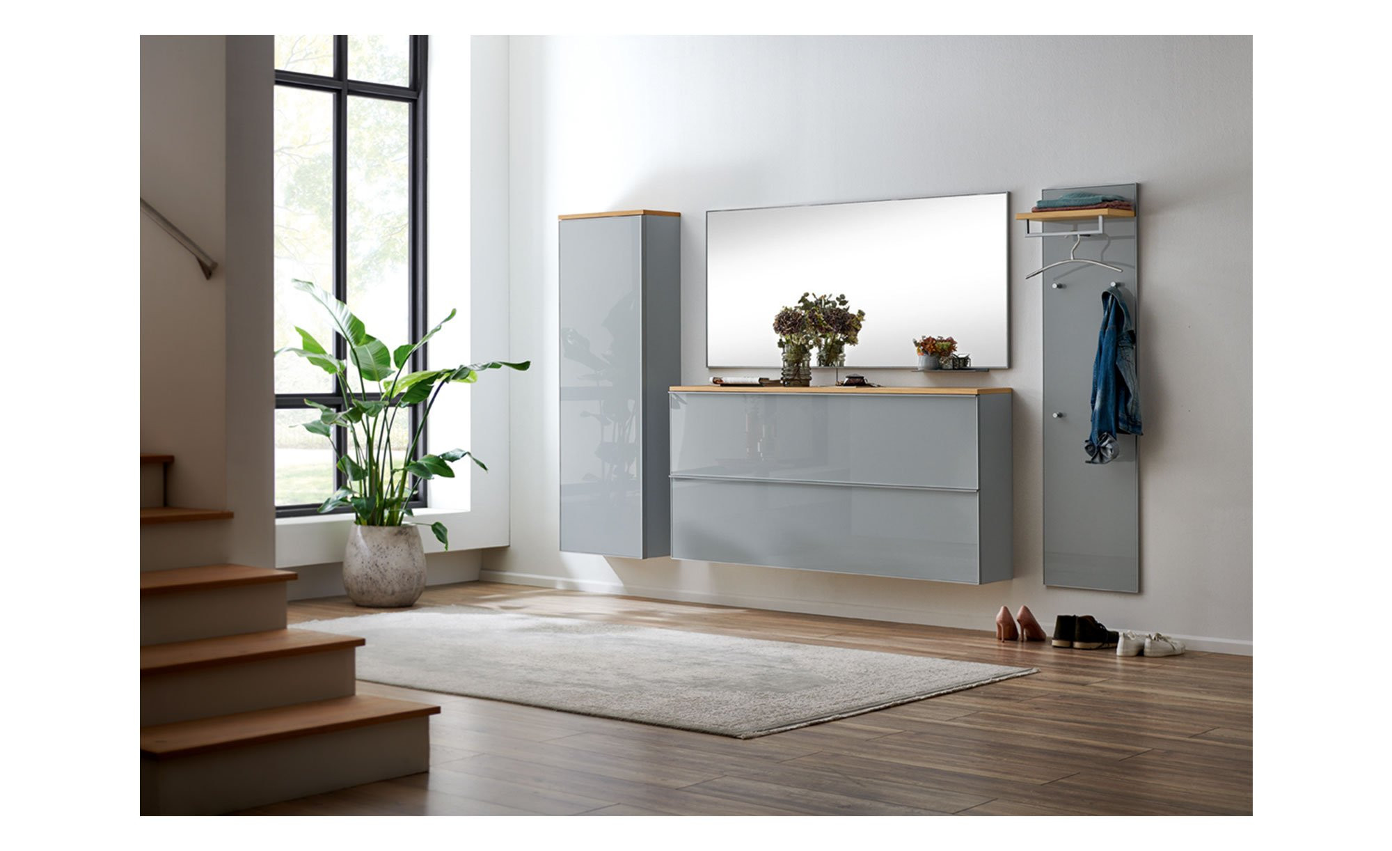 Da die komplette Front aus Spiegelglas besteht, können Sie sich ganz aufs Wesentliche konzentrieren. Gleichzeitig sorgt die große Spiegelfläche dafür, dass Ihr Eingangsbereich optisch weiter und heller wirkt.