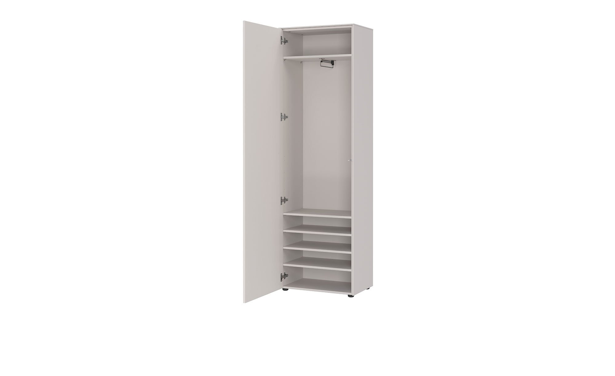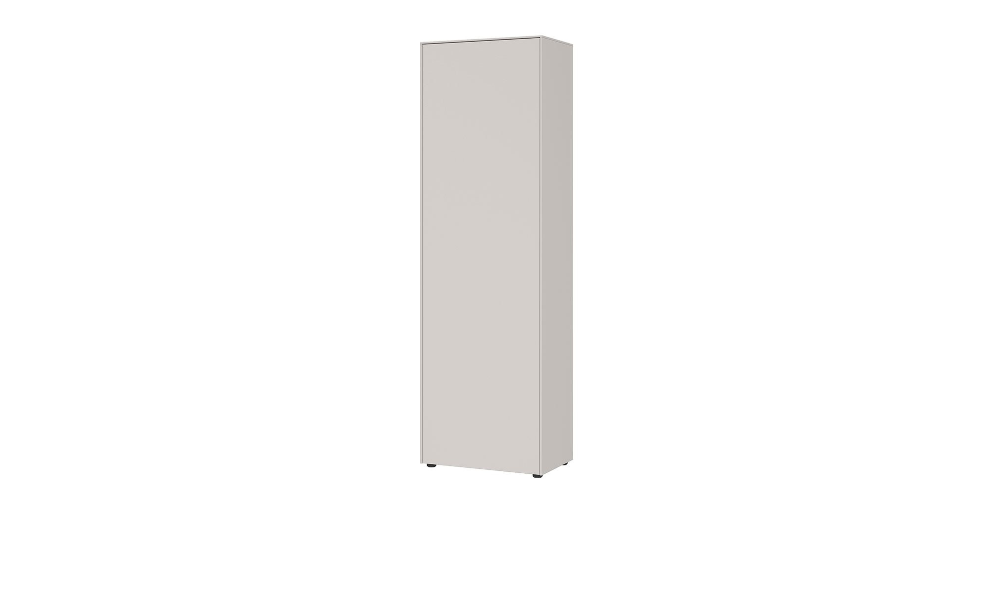 Das ca. 61 x 199 x 41 cm große Möbelstück besteht aus Holzwerkstoff im Farbton Kaschmir. Seine Oberflächen werden durch eine Beschichtung mit Melaminharz vor Kratzern geschützt, außerdem gibt es stoß- und schlagfeste Kanten gegen Verschleiß. Das Erscheinungsbild wird durch schwarze Kunststofffüße abgerundet. Im Innern des Artikels erwarten Sie vier verstellbare Böden und eine Kleiderstange. Davor befindet sich eine gedämpfte Tür mit Push-to-open-Funktion. Sie kann wahlweise links- oder rechtsseitig montiert werden.
