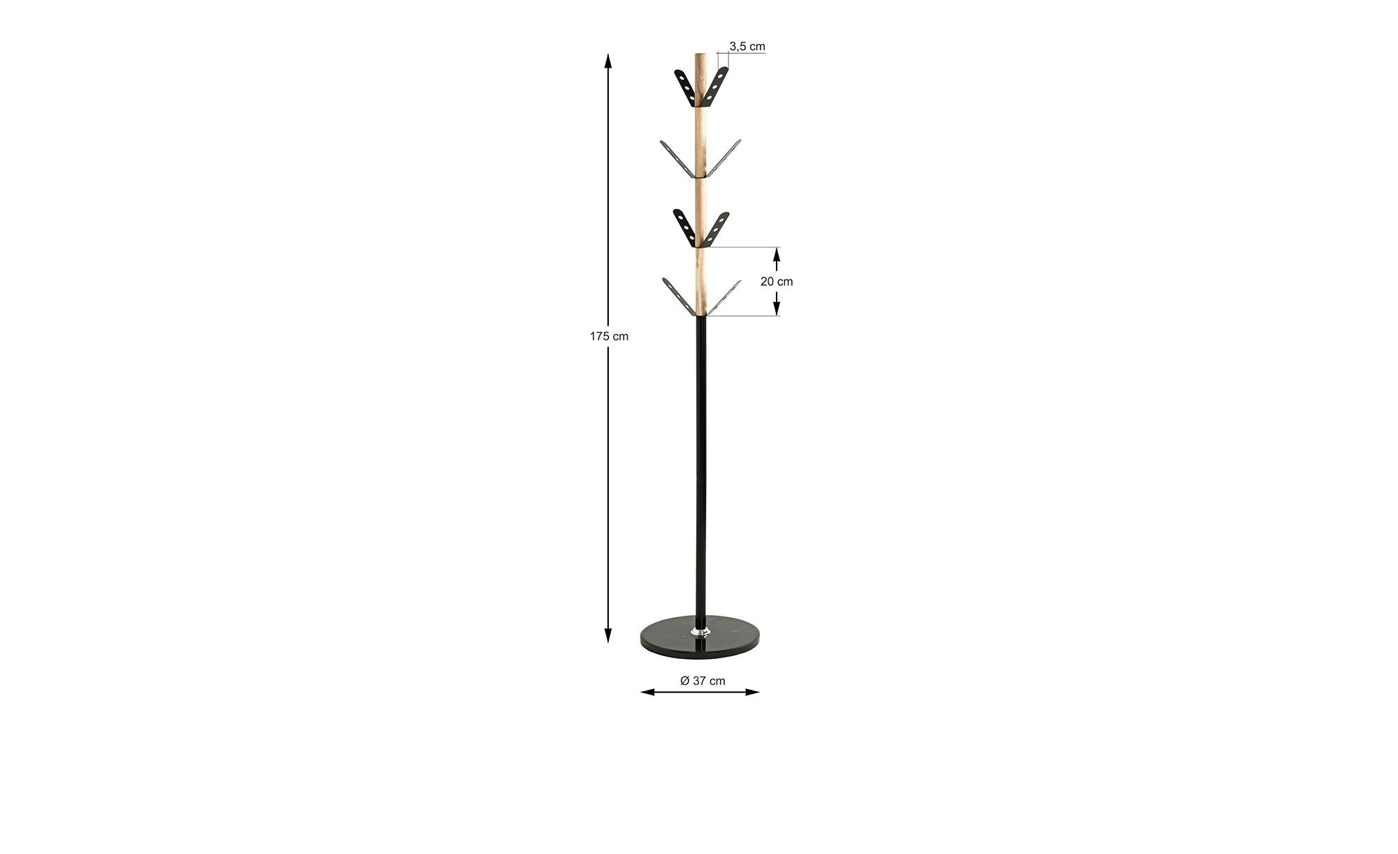 Zum ca. 37 x 179 x 37 cm großen Artikel gehören insgesamt acht Garderobenhaken aus Metall mit schwarzer Pulverbeschichtung. Sie sind mit ca. 6 kg belastbar.